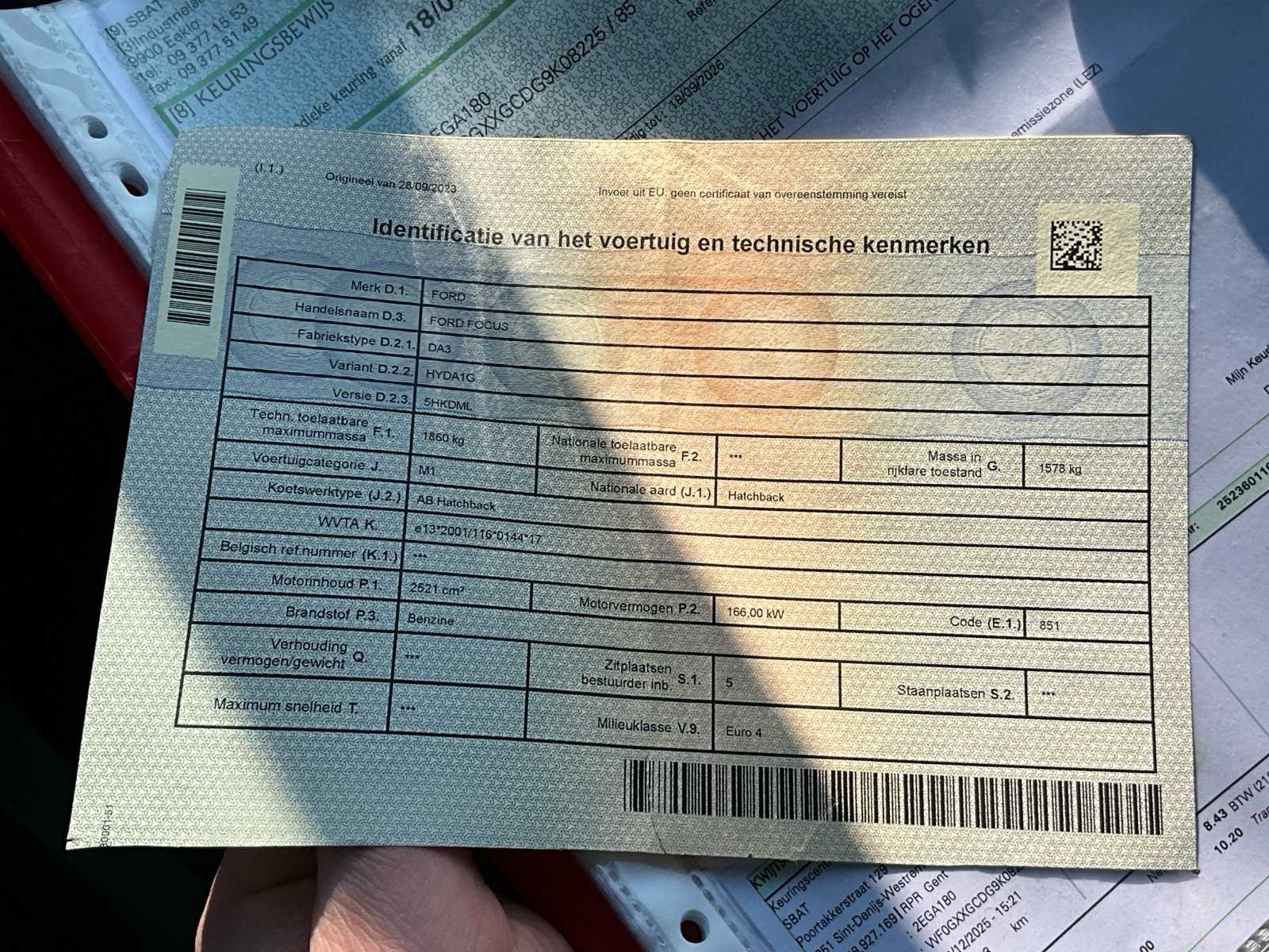 Compleet met alle papieren en tuningverslag. Merk: Ford Model: Focus ST Bouwjaar: 2009 Afgelezen kilometerstand: 232722km Cilinderinhoud: 2521cc Vermogen (kW): 166kW Brandstof: Benzine Chassisnummer: WF0GXXGCDG9K08225 Datum eerste toelating: 14/10/2009 Transmissie: Handgeschakeld Nationaliteit documenten: Belgisch Start en rijdt: Ja startinformatie : Start en rijdt Inschrijvingsbewijs - deel 1 : Aanwezig Inschrijvingsbewijs - deel 2: Aanwezig