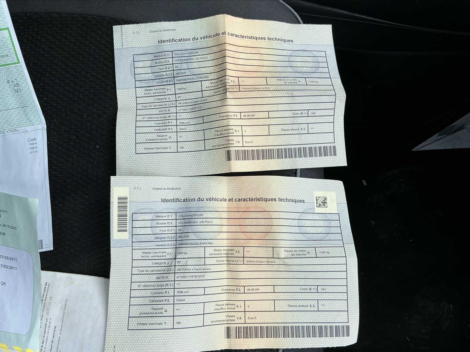 Hierbij heeft deze een nieuwe batterij nodig, start wel met startkabels. Amortisator maakt soms een licht lawaai. Merk: Volkswagen Model: Polo Type: 1.6 TDi bleumotion Bouwjaar: 2011 Afgelezen kilometerstand: 306676km Cilinderinhoud: 1598cc Vermogen (kW): 66kW Brandstof: Diesel Chassisnummer: WVWZZZ6 RZBY144717 Laadvermogen: 550kg Datum eerste toelating: 07/03/2011 Vermogen (pk): 90hp Energielabel: A Aandrijving: Voorwielaandrijving Aantal zitplaatsen: 5 Maximaal trekgewicht ongeremd: 600kg Maximaal trekgewicht geremd: 1200kg Kleur: Zwart Transmissie: Handgeschakeld Drive type: Front wheel Stuurwiel: Links Emissieklasse: Euro 5 Aantal deuren: 5 Aantal sleutels: 2 Aantal cilinders: 3 Nationaliteit documenten: België Gelijkvormigheidsattest aanwezig: true Carpass: true Start en rijdt: Ok Keuringsrapport geldig tot: 20/08/2026 startinformatie : Ok met startkabels Vavato voert geen technische keuring uit.: true Navigatie: true Inschrijvingsbewijs - deel 1 : Aanwezig Inschrijvingsbewijs - deel 2: Aanwezig