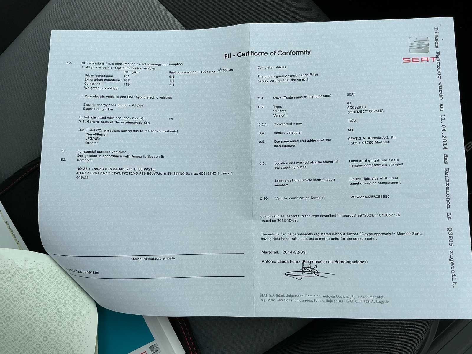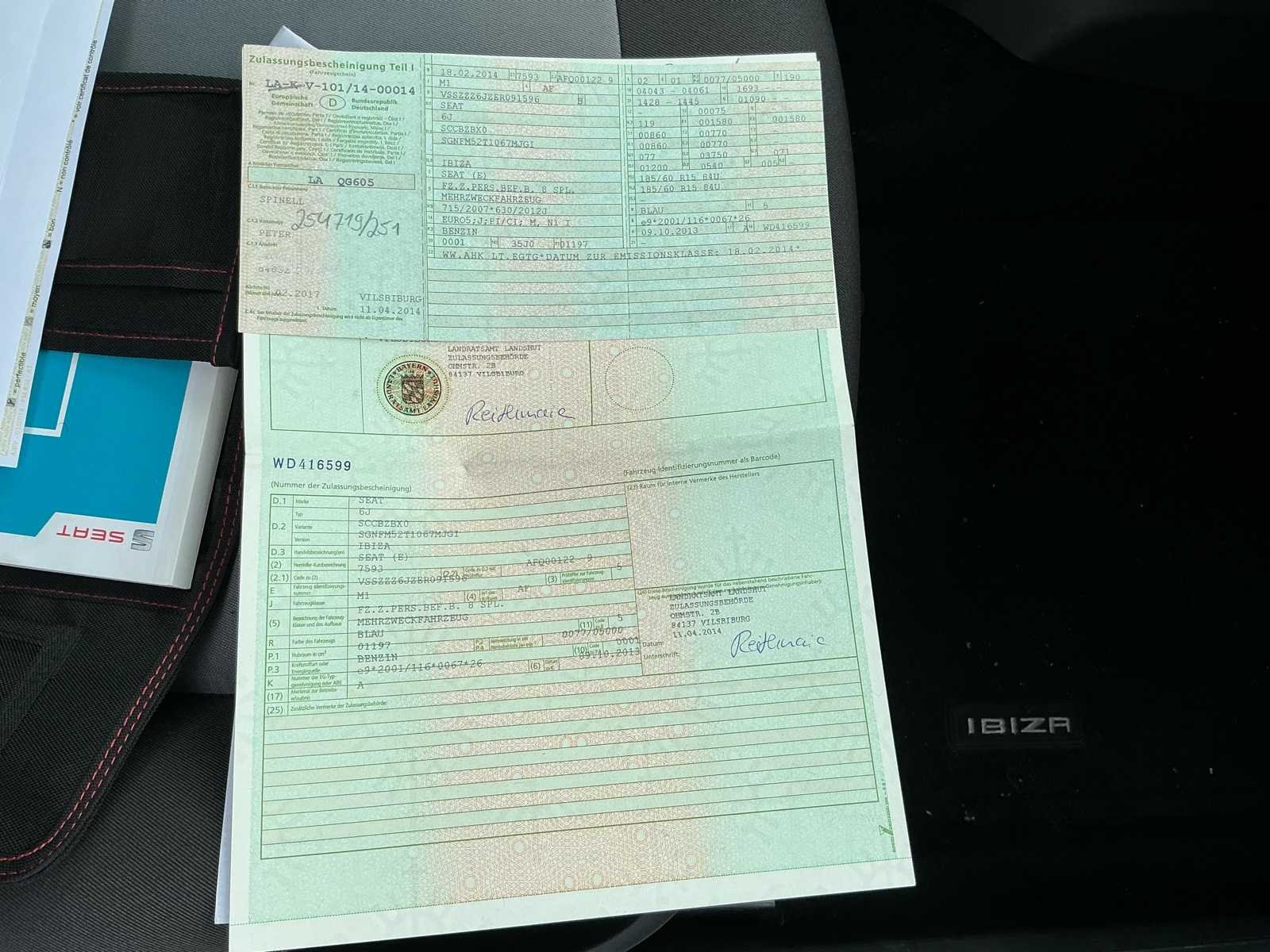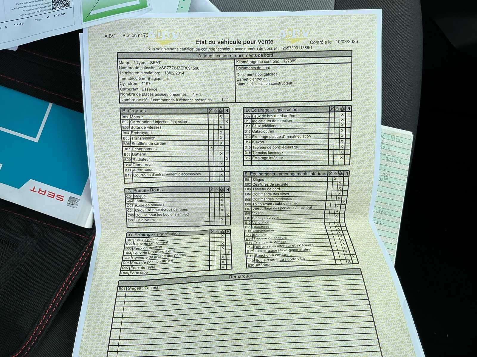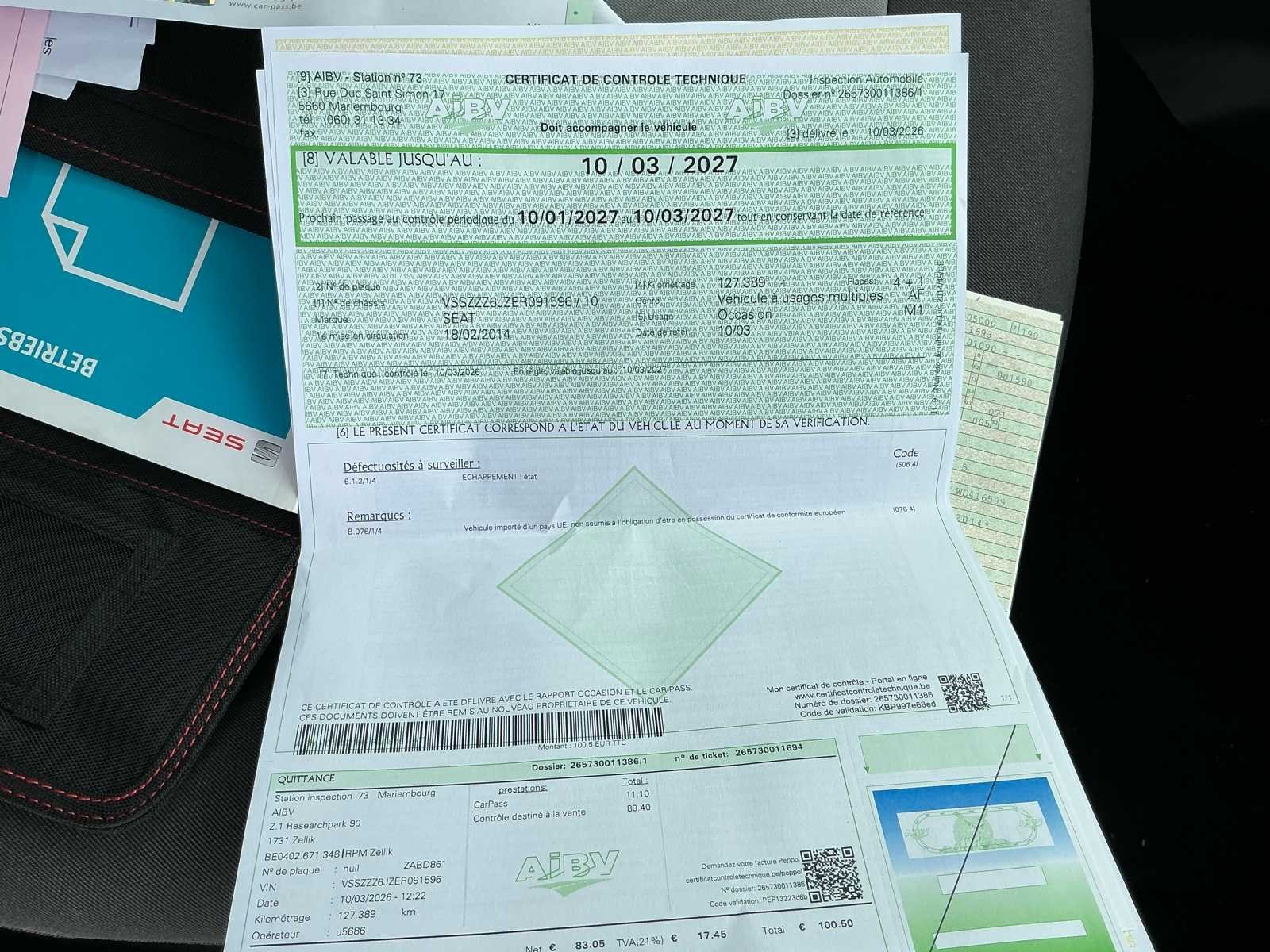 Complete Seat Ibiza, enkel een licht kleurverschil vooraan aan spoiler (klein hoekje) Roos formulier en technische controle ok. Onderhoudsboekje aanwezig. Zie foto’s. Merk: Seat Model: Ibiza Type: Hatchback Bouwjaar: 2014 Afgelezen kilometerstand: 127654km Cilinderinhoud: 1197cc Vermogen (kW): 63kW Brandstof: Benzine Chassisnummer: VSSZZZ6JZER091596/10 Laadvermogen: 520kg Datum eerste toelating: 11/04/2014 Vermogen (pk): 84hp Energielabel: B Aandrijving: Voorwielaandrijving Aantal zitplaatsen: 5 Maximaal trekgewicht ongeremd: 500kg Maximaal trekgewicht geremd: 1000kg Kleur: Blauw Transmissie: Handgeschakeld Drive type: Front wheel Stuurwiel: Links Emissieklasse: Euro 5 Aantal deuren: 5 Aantal sleutels: 2 Ledig gewicht: 990kg Aantal cilinders: 4 Carrosserie: Ok Nationaliteit documenten: Duitsland Onderhoudshistorie: Ok Carpass: true Start en rijdt: Ok Keuringsrapport geldig tot: 10/03/2027 Technische fiche: true Andere boorddocumenten: Alle nodige zijn aanwezig startinformatie : Ok Zichtbare schade: Geen enkel een klein kleurverschil onderaan voorspoiler (klein hoekje) Vavato voert geen technische keuring uit.: true Inschrijvingsbewijs - deel 1 : Aanwezig Inschrijvingsbewijs - deel 2: Aanwezig