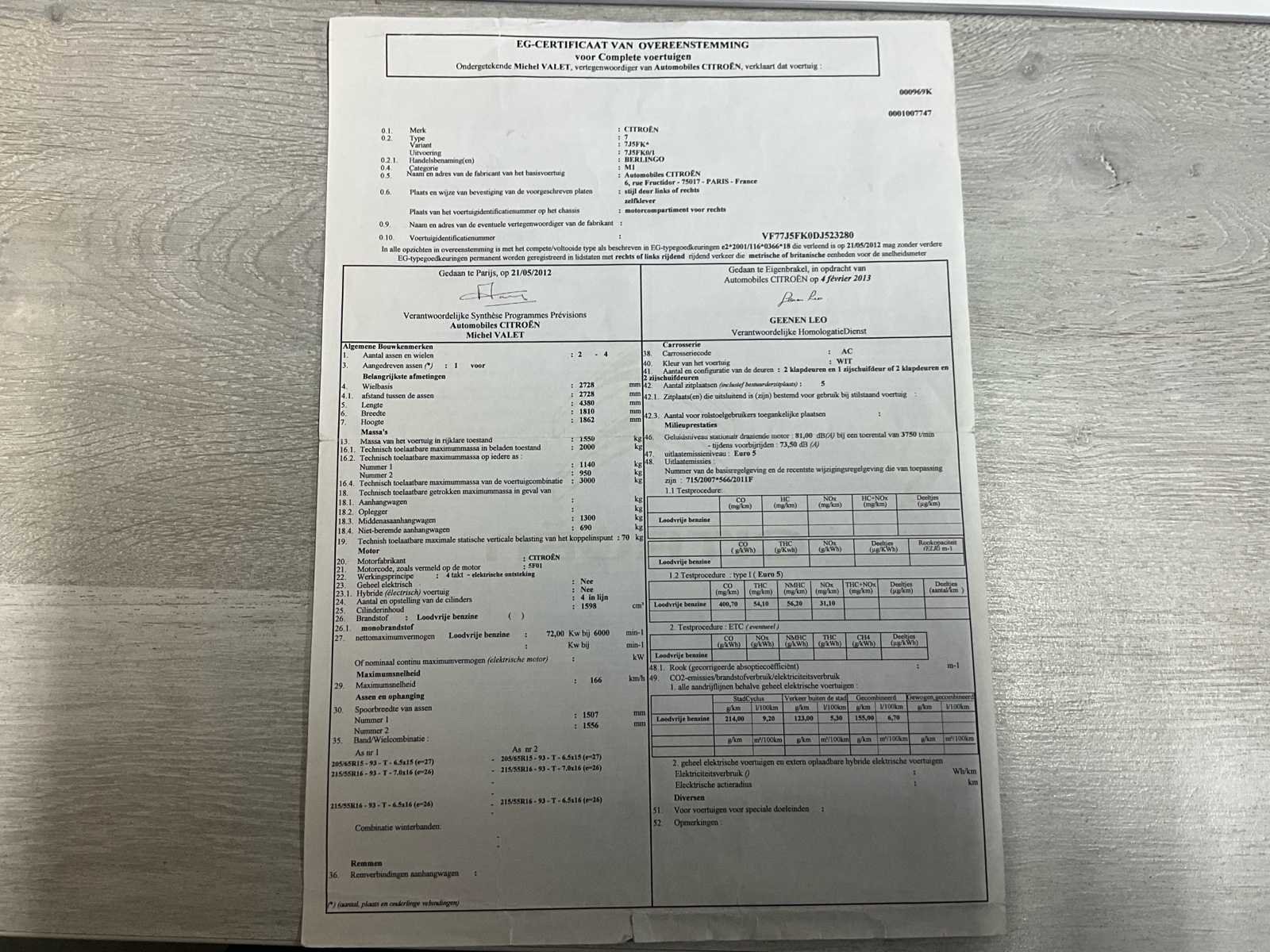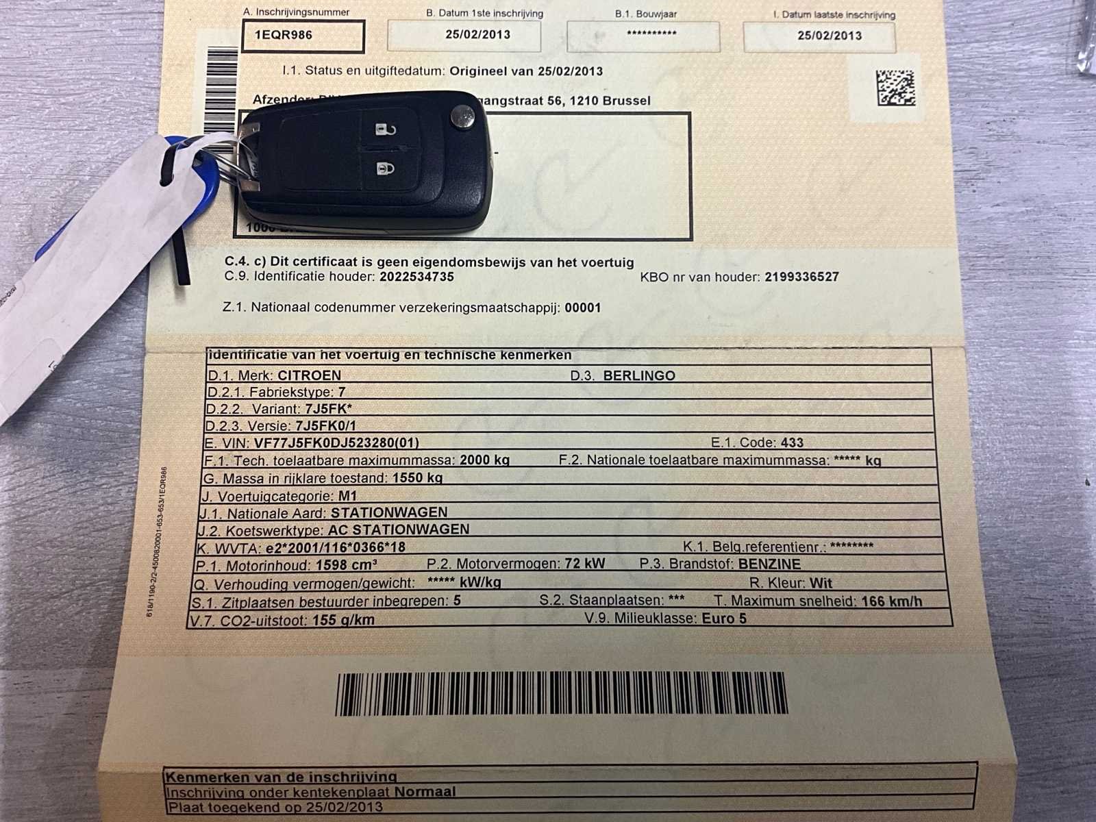 Zeer nette staat, buitenkant paar kleine krasjes (zie foto), binnenkant zeer proper - trekhaak Merk: Citroën Model: Berlingo Type: stationwagen 137000km - benzine Bouwjaar: 2013 Afgelezen kilometerstand: 136776km Cilinderinhoud: 1598cc Vermogen (kW): 72kW Brandstof: benzine Chassisnummer: VF77J5FK0DJ523280 Laadvermogen: 450kg Datum eerste toelating: 25/2/2013 Aantal zitplaatsen: 5 Kleur: geel Transmissie: manueel, Emissieklasse: Euro 5 Aantal deuren: 6 Ledig gewicht: 1550kg Nationaliteit documenten: B Gelijkvormigheidsattest aanwezig: true Start en rijdt: ja Vavato voert geen technische keuring uit.: true Inschrijvingsbewijs - deel 1 : aanwezig Inschrijvingsbewijs - deel 2: aanwezig