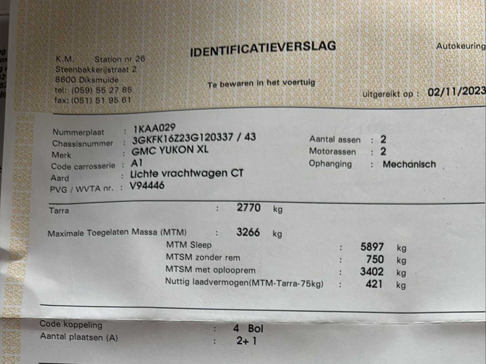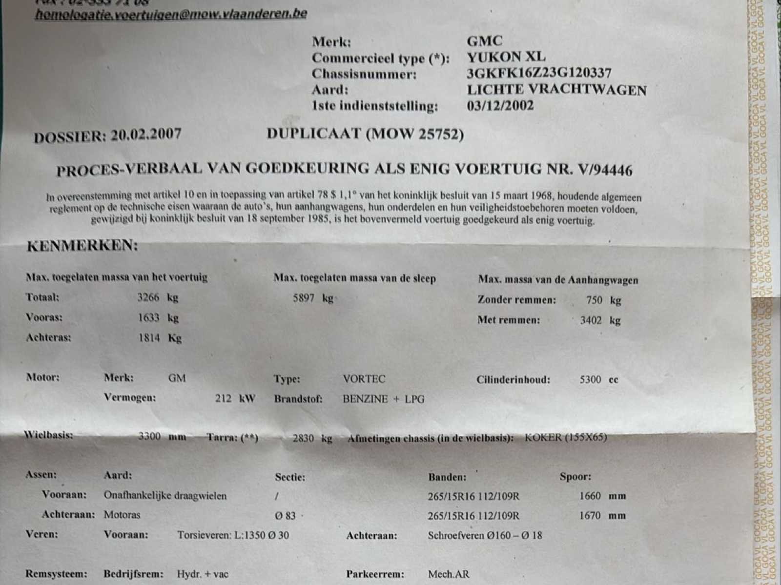 Documenten aawezig Merk: GMC Type: Yukon XL Bouwjaar: 2002 Chassisnummer: 3GKFK16Z23G120337(01) Afgelezen kilometerstand: 481000 Datum eerste inschrijving: 03/12/2002 Datum eerste toelating: 03/12/2002 Startinformatie: ja