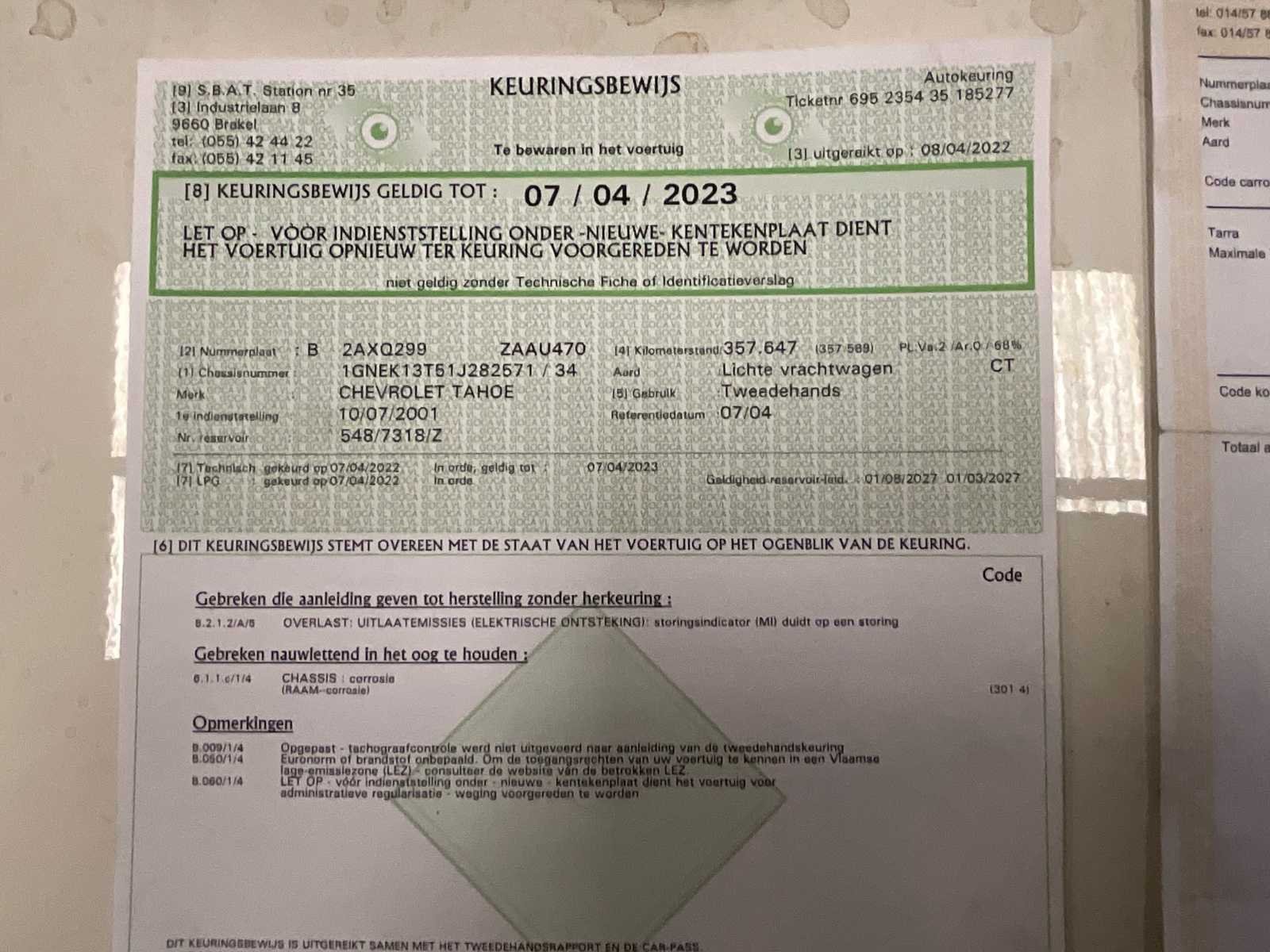 Start en rijd versnellingbak dient vernieuwd te worden documenten aanwezig Merk: Chevrolet Type: Tahoe Bouwjaar: 2001 Chassisnummer: 1GNEK13T51J282571(01) Afgelezen kilometerstand: 370000 Tellerstand niet afleesbaar: true Brandstof: Benzine + LPG Datum eerste inschrijving: 10/07/2001 Datum eerste toelating: 10/07/2001 Boorddocumenten aanwezig?: true Aantal zitplaatsen: 2 Stuurwiel: links