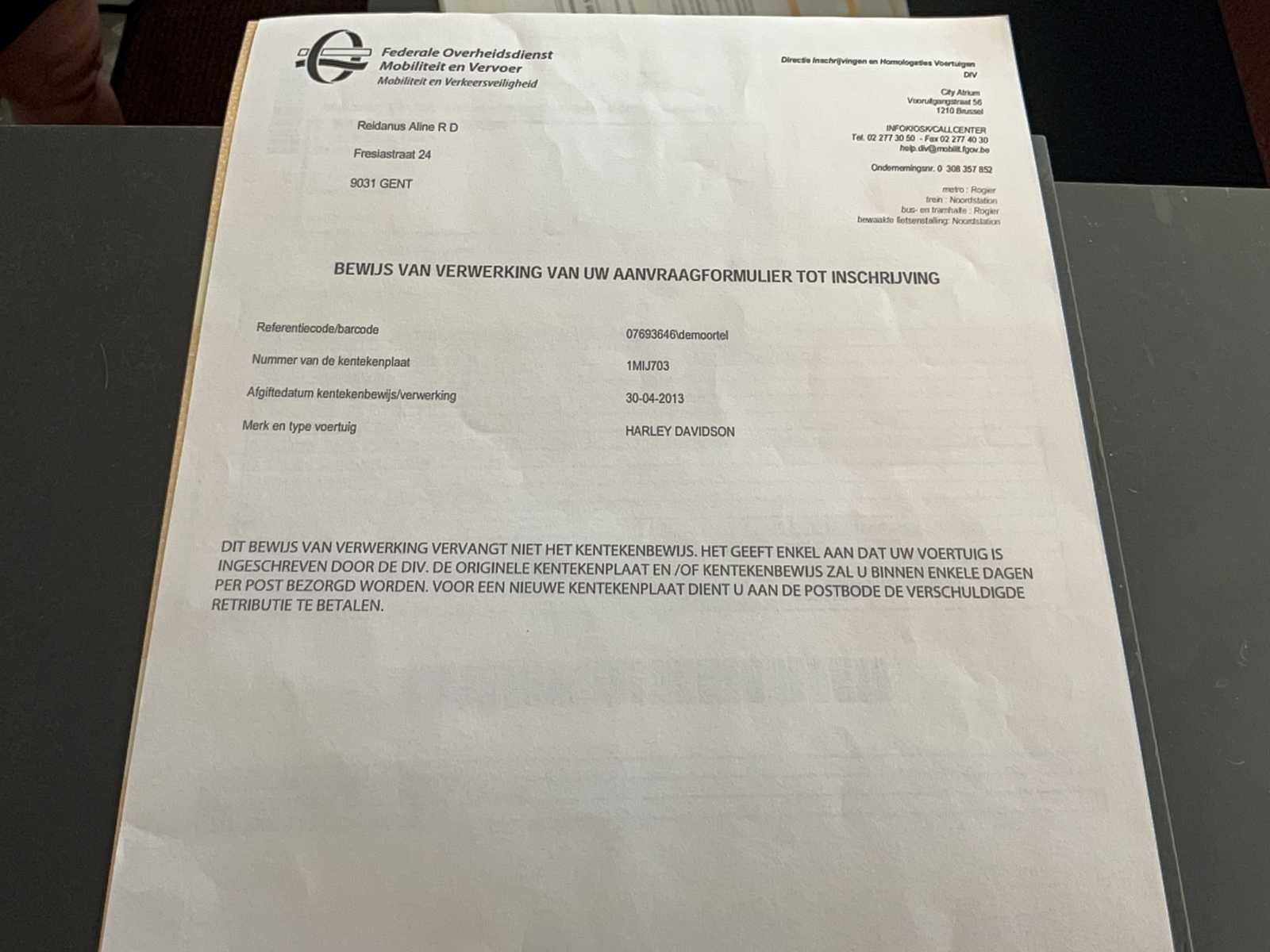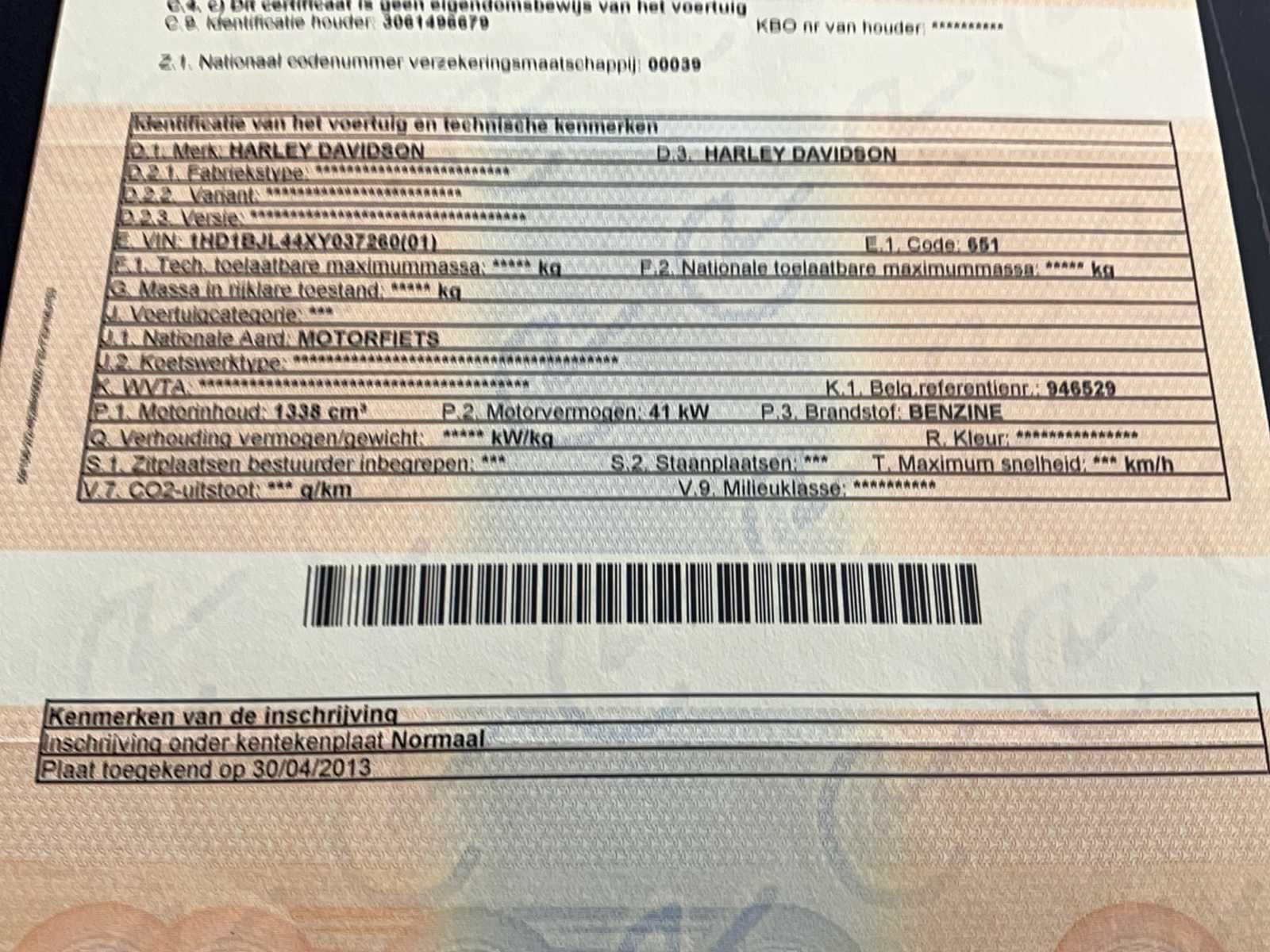• Merk: Harley-Davidson • Model / Type: FLSTC • Categorie: Motorfiets • Motorinhoud: 1338 cm³ • Motorvermogen: 41 kW (≈ 56 pk) • Brandstof: Benzine • Framenummer (VIN): 1HD1BJL14XY037260 • Belgisch referentienummer: 946529 • Aantal zitplaatsen: 2 • Inschrijvingsdatum (plaat toegekend): 30/04/2013 Bijzonderheden: • Origineel Gelijkvormigheidsattest (COC) aanwezig. • Ingeschreven onder normale kentekenplaat. • Kleur en maximumsnelheid niet ingevuld op het k Merk: Harley-Davidson Model: FLSTC Chassisnummer: 1HD1BJL14XY037260 Cilinderinhoud: 1398cc Datum eerste toelating: 30042013 Vermogen (kW): 41kW Afgelezen kilometerstand: 5865km Boorddocumenten aanwezig?: true Bouwjaar: 2013