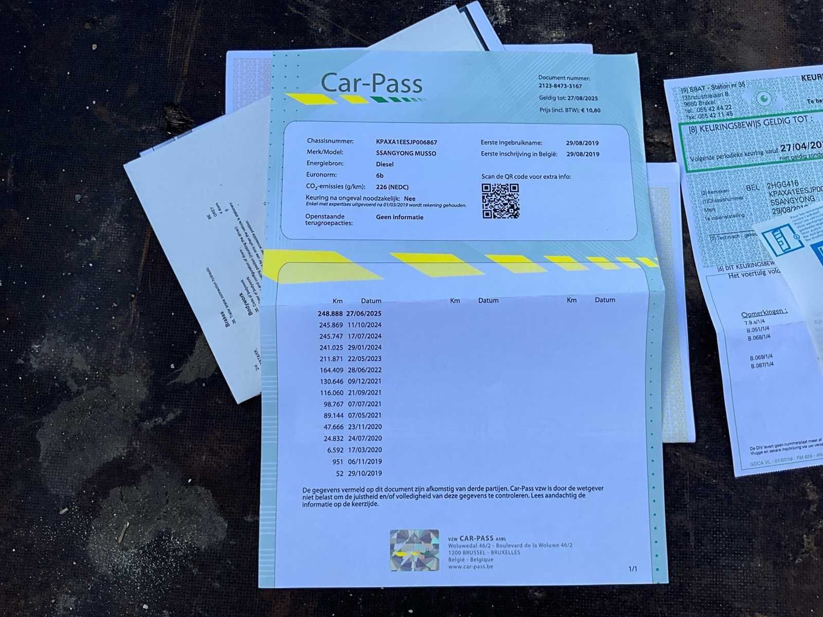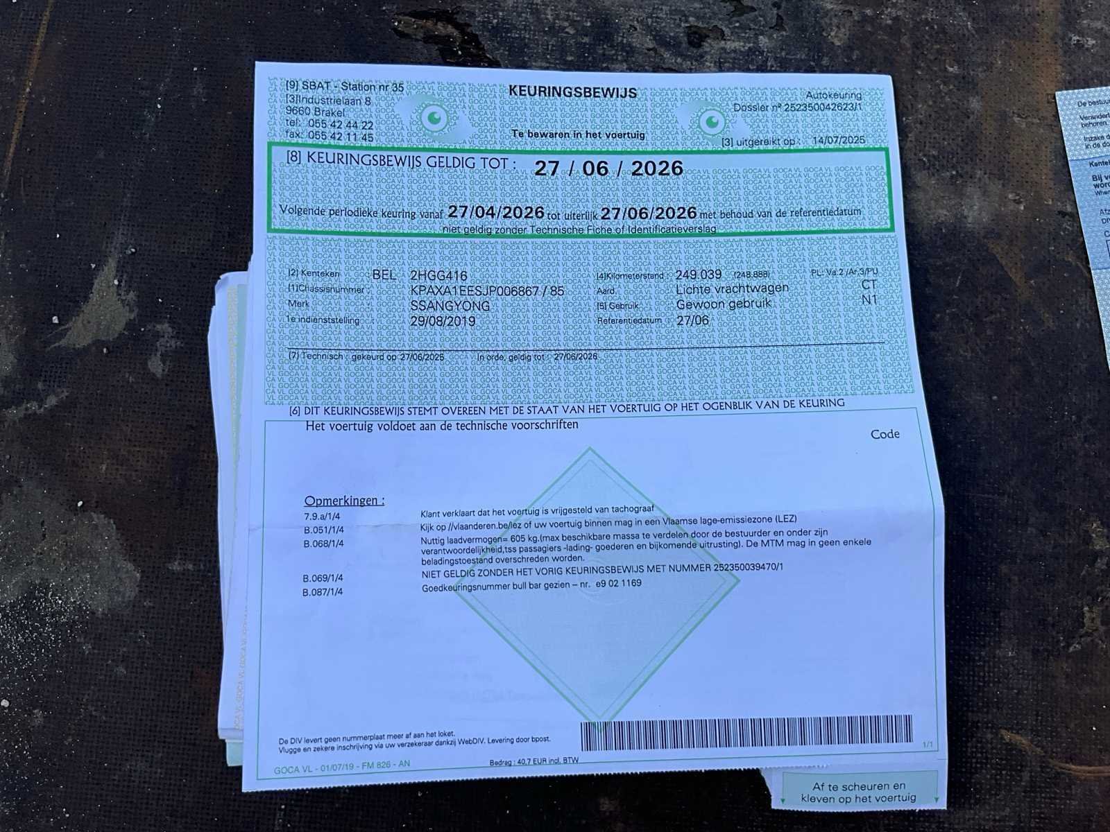 Merk: SsangYong Model: Musso Bouwjaar: 2019 Afgelezen kilometerstand: 250000km Cilinderinhoud: 2157cc Vermogen (kW): 133kW Brandstof: Diesel Chassisnummer: KPAXA1EESJP006867 Datum eerste toelating: 29/08/2019 Aantal zitplaatsen: 5 Maximaal trekgewicht ongeremd: 750kg Maximaal trekgewicht geremd: 3000kg Transmissie: Automaat Emissieklasse: Euro 6b Aantal sleutels: 2 Ledig gewicht: 2200kg Carrosserie: SUV Nationaliteit documenten: BE Gelijkvormigheidsattest aanwezig: true Start en rijdt: Ja Keuringsrapport geldig tot: 27/06/2026 startinformatie : Start, rijdt, remt Vavato voert geen technische keuring uit.: true Inschrijvingsbewijs - deel 1 : Ok Inschrijvingsbewijs - deel 2: Ok