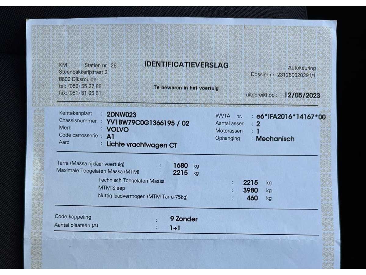 Lichte vracht op papier, achterbank aanwezig bij verkoop. (zie fotos) - Moet wel nog herkeurd worden indien gebruikt wordt als personenwagen! Merk: Volvo Model: V70 Bouwjaar: 2016 Afgelezen kilometerstand: 280540km Cilinderinhoud: 1969cc Vermogen (kW): 110kW Brandstof: Diesel Chassisnummer: YV1BW79C0G1366195 Laadvermogen: 460kg Datum eerste toelating: 13/01/2016 Vermogen (pk): 150hp Aantal zitplaatsen: 2 Transmissie: Automaat Emissieklasse: euro 6 Aantal deuren: 5 Ledig gewicht: 1680kg Aantal cilinders: 4 Nationaliteit documenten: BE Gelijkvormigheidsattest aanwezig: true Start en rijdt: Ja Keuringsrapport geldig tot: 22/04/2026 startinformatie : Start, rijdt, remt Vavato voert geen technische keuring uit.: true Inschrijvingsbewijs - deel 1 : ok Inschrijvingsbewijs - deel 2: ok