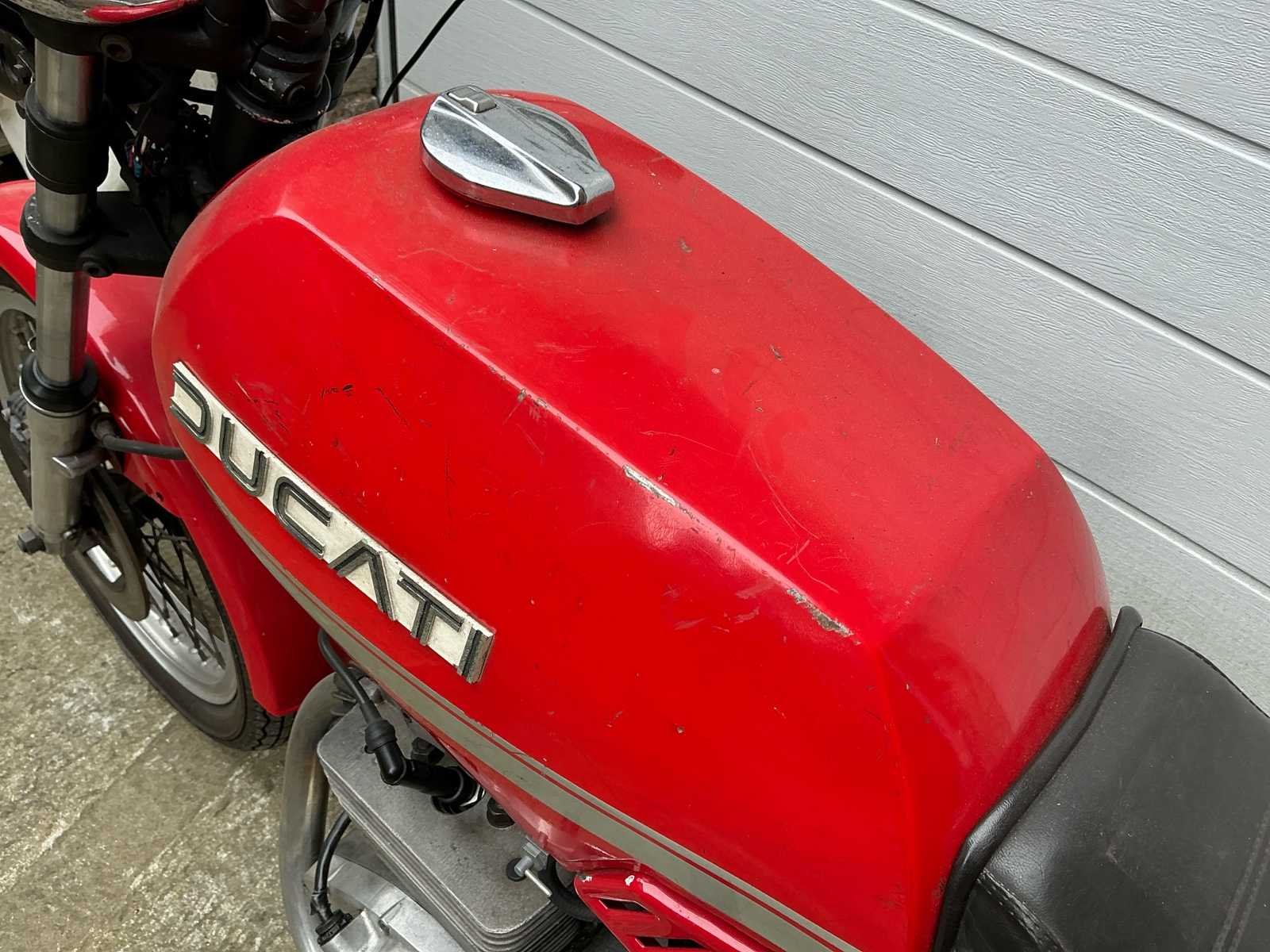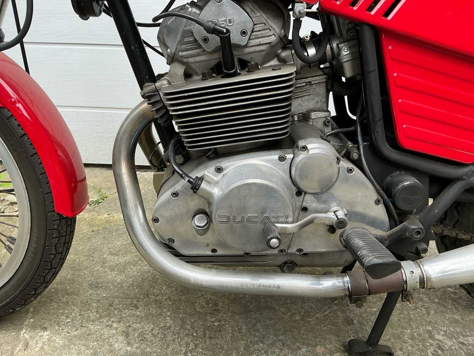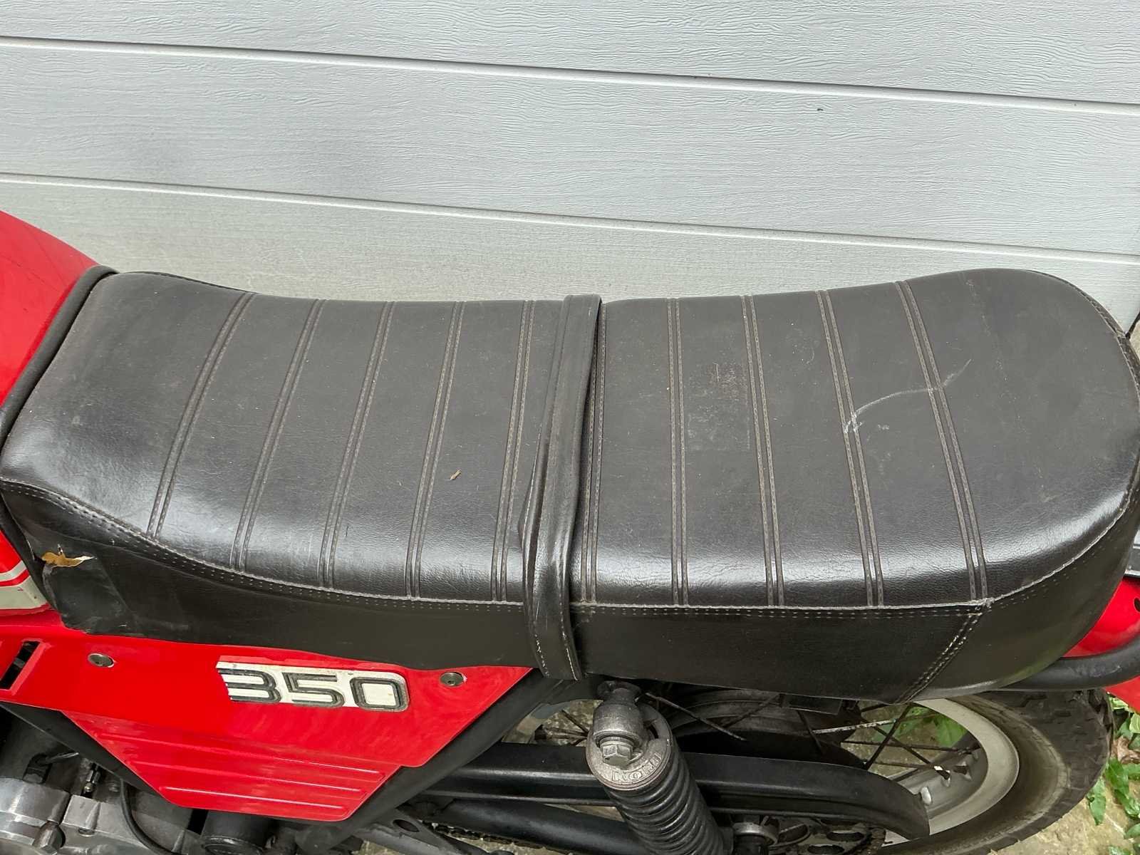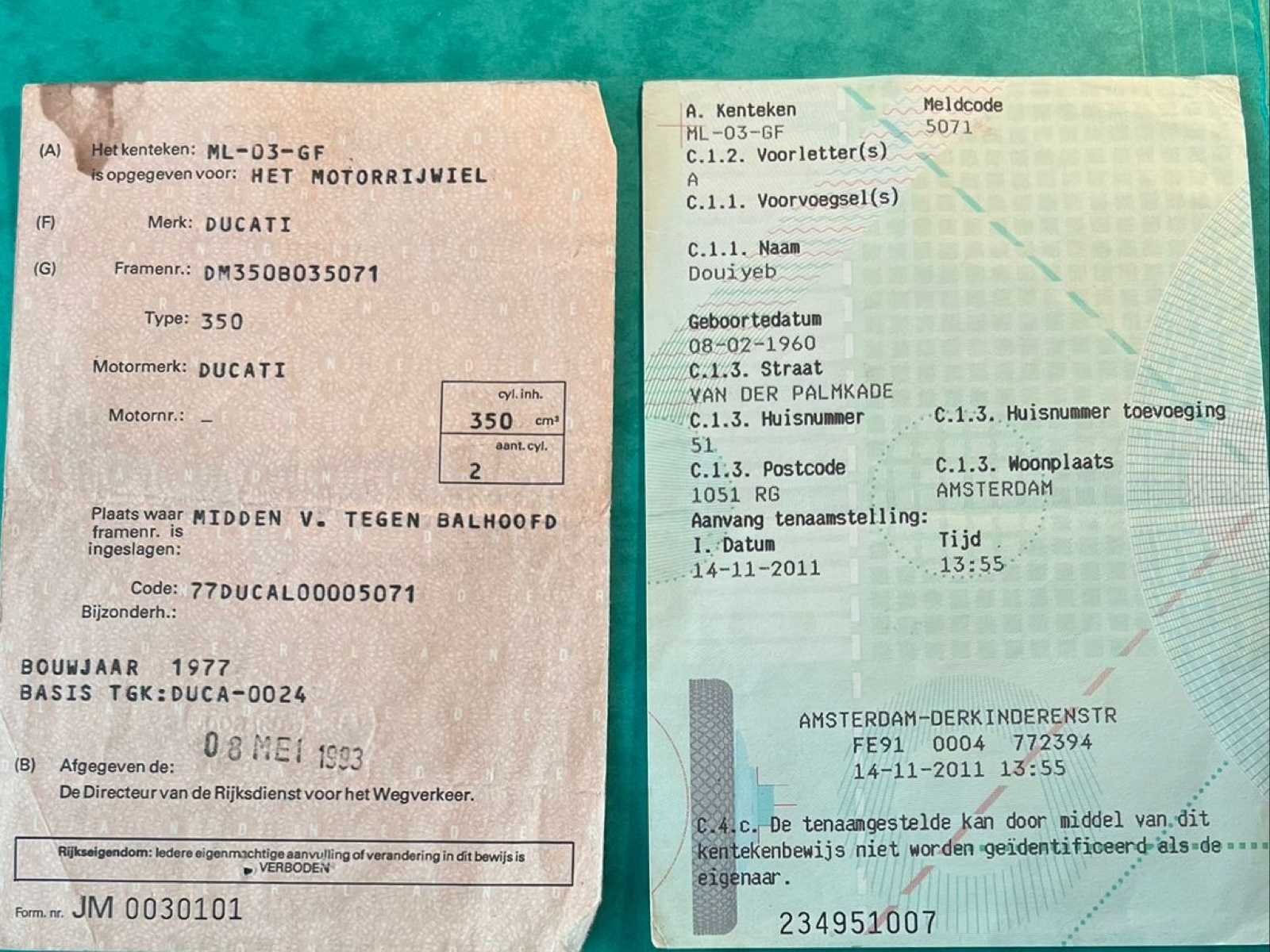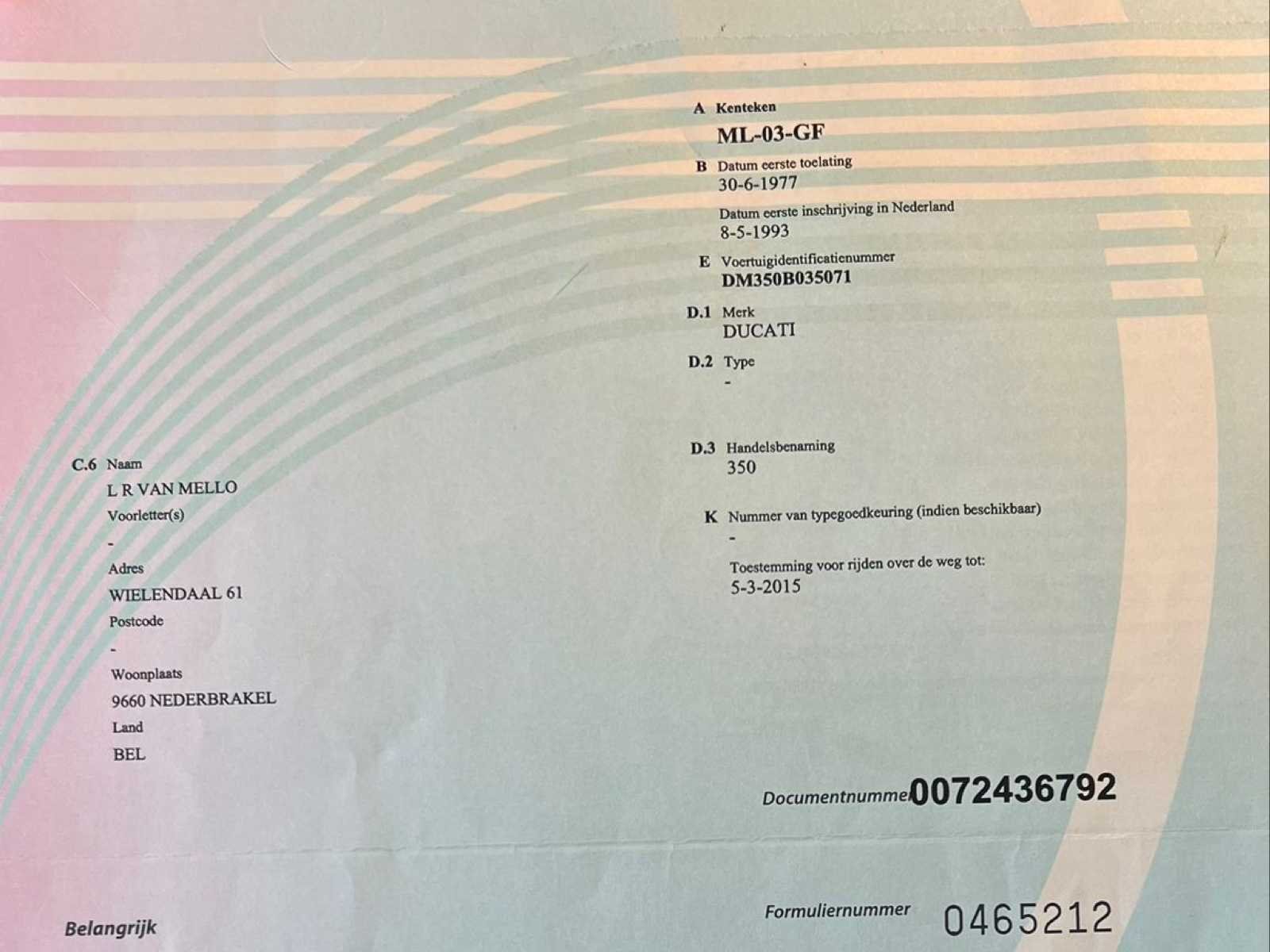 Rijdend weggezet. Check-up nodig. Ducati 350 klassieke motorfiets, eerste toelating op 30/06/1977. Dit exemplaar wordt aangeboden in een aantrekkelijke rode uitvoering met zwarte buddyseat en spaakwielen en heeft de typische lijnvoering van de Ducati-modellen uit de jaren zeventig. Op de teller staat een afgelezen kilometerstand van 15.207 km. Het chassisnummer volgens de voorgelegde documenten is DM350B035071. Er zijn diverse documenten aanwezig, waaronder een ouder Nederlands kentekenbewijs, een Belgisch inschrijvingsdocument en een getuigschrift. De motor vertoont een verzorgde en complete algemene indruk, met onder meer tankbadges, zijpanelen met “350”-aanduiding, uitlaat, vering, tellerpartij en remcomponenten aanwezig. De lak en de carrosseriedelen tonen normale gebruiks- en ouderdomssporen. Ook op metalen delen, tellers, velgen, banden en afwerking zijn zichtbare sporen van leeftijd, gebruik en stilstand aanwezig. De banden vertonen veroudering en slijtage en dienen door de koper beoordeeld te worden met het oog op verder gebruik. Dit betreft een interessante basis voor de liefhebber van klassieke Italiaanse motorfietsen, verzamelaars of kandidaat-restaurateurs. Dankzij zijn herkenbare Ducati-uitstraling en aanwezige documentatie is dit een aantrekkelijk verzamelobject met potentieel. Merk: Ducati Model: 350 Chassisnummer: DM350B035071 Cilinderinhoud: 350cc Datum eerste toelating: 3/06/1977 Kleur: Rood Afgelezen kilometerstand: 15207km Nationaliteit documenten: Nederland Startinformatie: Moet opgestart worden Bouwjaar: 1077