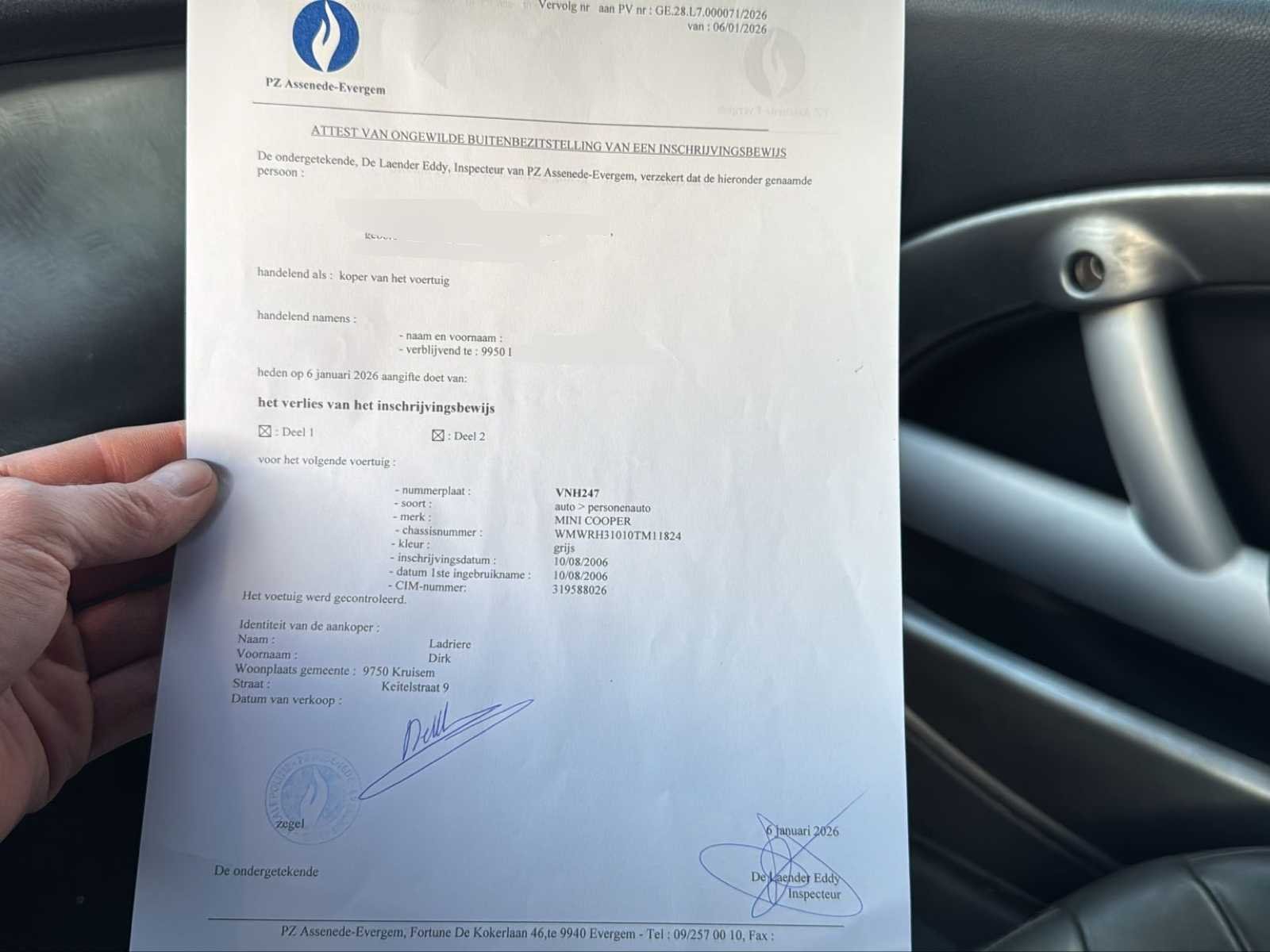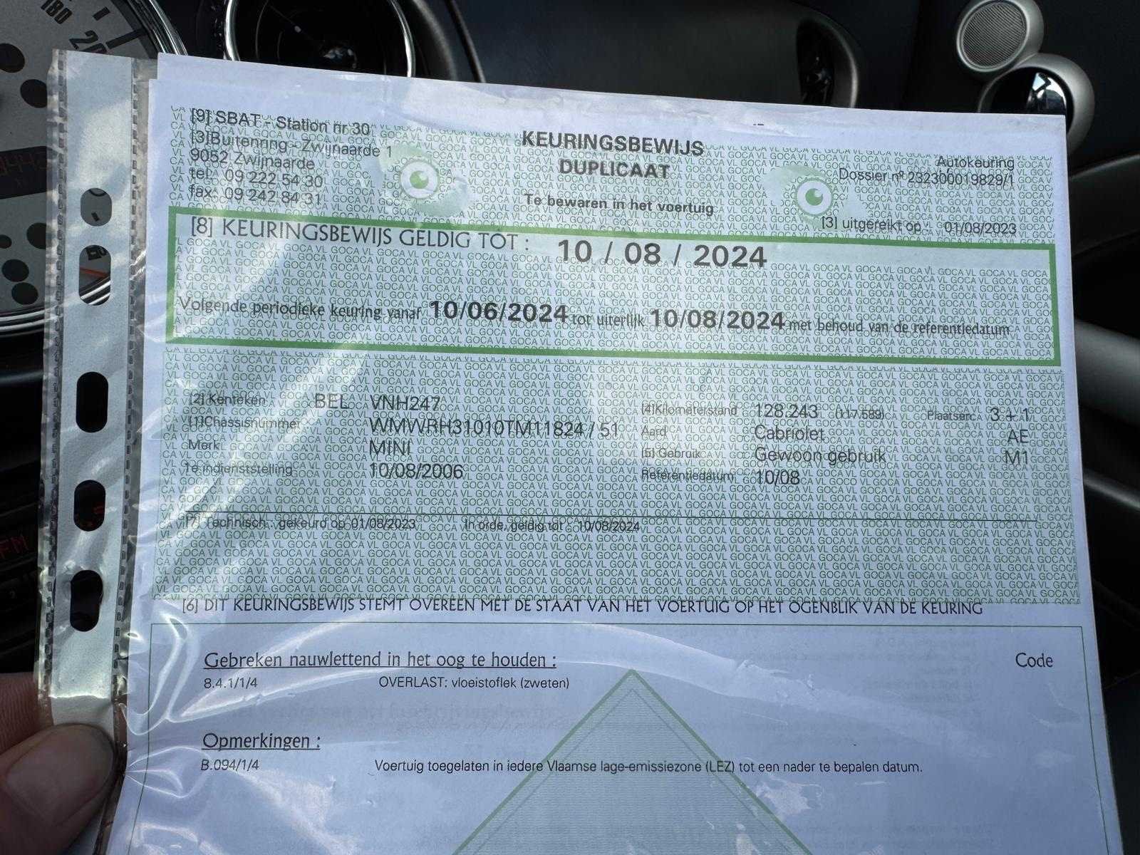 Merk: Mini Cooper Model: S Type: Cabriolet Bouwjaar: 2006 Afgelezen kilometerstand: 129442km Cilinderinhoud: 1600cc Vermogen (kW): 120kW Brandstof: Benzine Chassisnummer: WMWRH31010TM11824 Datum eerste toelating: 10/08/2006 Transmissie: Handgeschakeld Aantal sleutels: 1 Nationaliteit documenten: Belgische Start en rijdt: Ja Keuringsrapport geldig tot: 10/08/2024 Vavato voert geen technische keuring uit.: true
