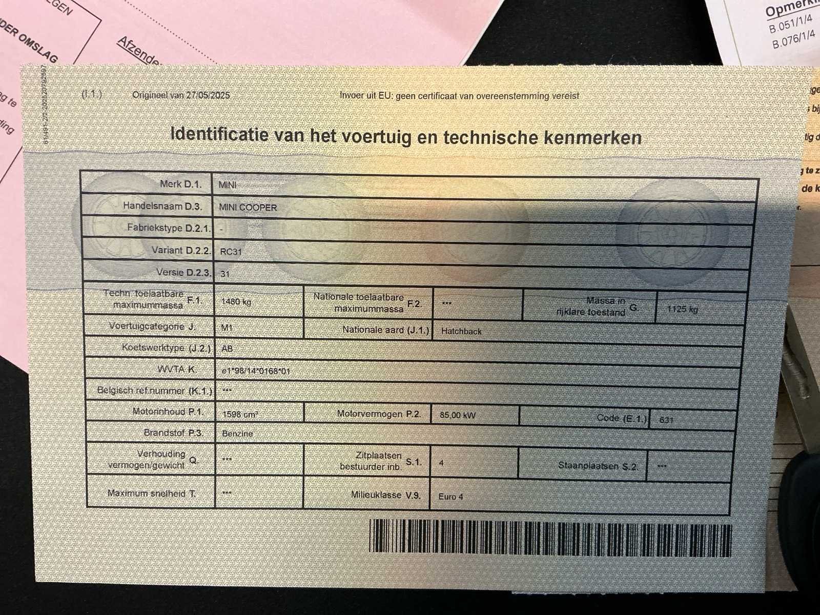 Merk: Mini Model: Cooper Type: R50 Bouwjaar: 2002 Afgelezen kilometerstand: 220946km Cilinderinhoud: 1598cc Vermogen (kW): 85kW Brandstof: Benzine Chassisnummer: WMWRC31090TB45745 Laadvermogen: 280kg Datum eerste toelating: 15/2/2002 Vermogen (pk): 115hp Energielabel: Euro 4 Aandrijving: FWD Aantal zitplaatsen: 4 Kleur: Zwart Transmissie: Manueel USA titel: Neen Stuurwiel: Links Emissieklasse: Euro 4 Aantal deuren: 3 Aantal sleutels: 2 Ledig gewicht: 1125kg Aantal cilinders: 4 Carrosserie: Hatchback Nationaliteit documenten: Belgische Start en rijdt: Ja Keuringsrapport geldig tot: 19/05/2026 Technische fiche: true startinformatie : Start en rijdt Zichtbare schade: Gebruikssporen Self drive export possible : true Vavato voert geen technische keuring uit.: true Airconditioning: true Leder bekleed: true Inschrijvingsbewijs - deel 1 : Aanwezig Inschrijvingsbewijs - deel 2: Aanwezig
