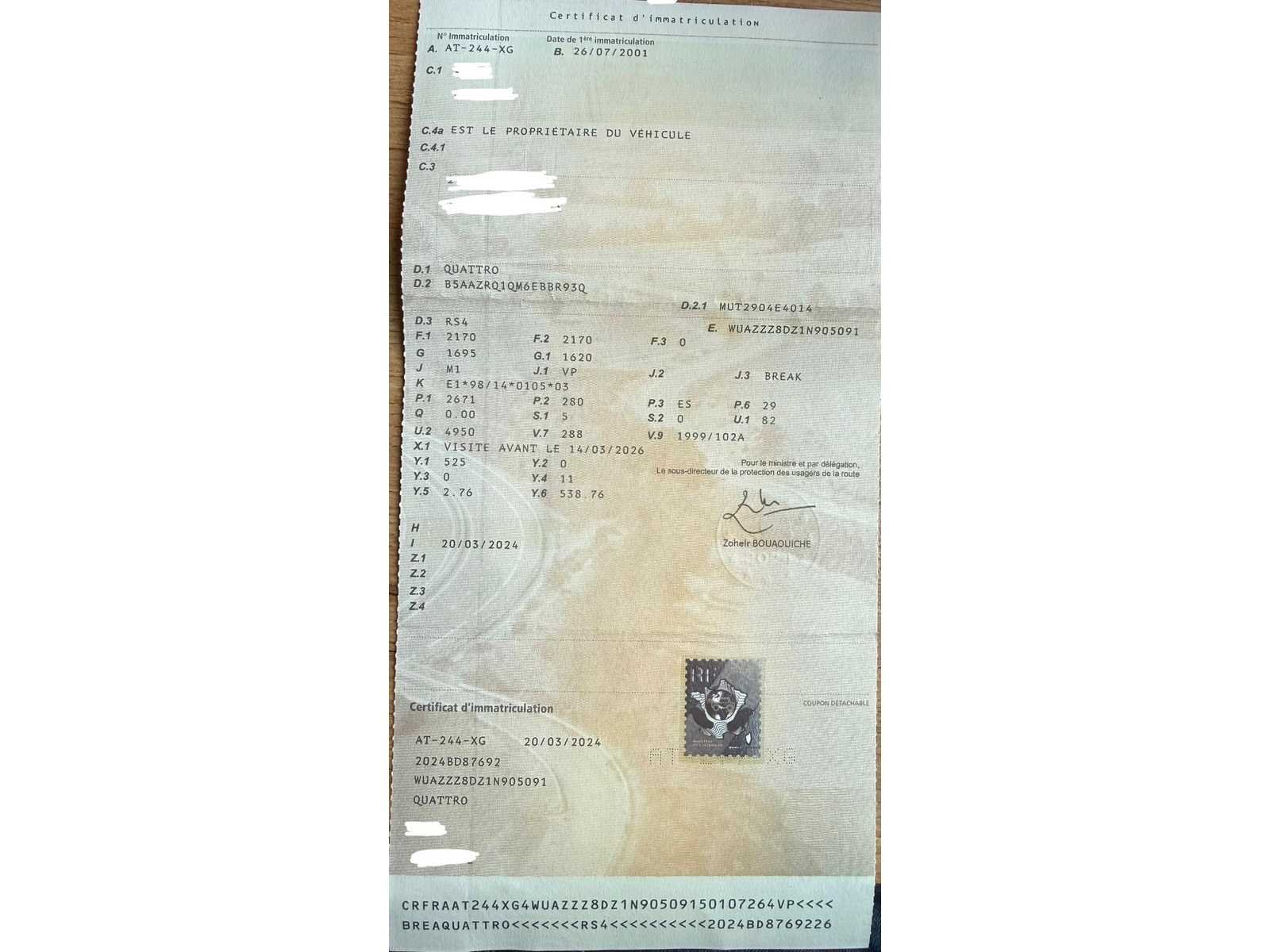 Audi RS4 B5 Avant Quattro – 2,7 V6 Biturbo – 380 pk – 2001 Originele Audi RS4 (type B5) voertuig, emblematisch model van de Audi Sport-reeks, uitgerust met de V6 biturbomotor die 380 pk levert, gecombineerd met Quattro vierwielaandrijving en een handgeschakelde versnellingsbak. Eerste inschrijving: 26/07/2001 Kilometerstand: 181.000 km Brandstof: Benzine Vermogen: 280 kW (380 pk) Cilinderinhoud: 2.671 cc Frans kentekenbewijs Voertuig in goede algemene staat, met een configuratie overeenkomstig het origineel (motor, Recaro RS4 interieur, uitrusting). Ongewijzigd model. Interieur: Recaro RS4 leren bekleding in goede staat met normale slijtage, vooral op de bestuurdersstoel. Volledig en conform interieur. Buiten: De carrosserie is in goede algehele staat met enkele kleine gebruiksfouten (micro-krassen en zichtbare imperfecties). RS4-type aluminium velgen met sporen van slijtage. Motorcompartiment: V6 biturbomotor in standaardconfiguratie. Schone compartiment. Hoofdapparatuur: * Quattro vierwielaandrijving * Recaro RS4 leren bekleding * Automatische klimaatregeling * Audi Concert autoradio met cd-lader * RS aluminium wielen Aanvullende informatie: * Audi Sport chassisnummer (WUA...) bevestigt het originele RS4-model * Volgens de verkoper zijn er geen directe kosten te verwachten * Voertuig direct beschikbaar Let op: * Esthetische gebreken gerelateerd aan het gebruik * Normale slijtage van het interieur Zeldzaam en gewild model, ideaal voor hobbyist, verzamelaar of investering. Chassisnummer: WUAZZZ8DZ1N905091 Merk: Audi Model: RS4 avant B5 Type: 2.7 V6 Biturbo Afgelezen kilometerstand: 181000km Brandstof: Benzine Datum eerste toelating: 2001 Nationaliteit documenten: Engels Carrosserie: Landgoed Aandrijving: Links Transmissie: Handboek Vermogen (pk): 380 Vermogen (kW): 280 Aantal deuren: 5 Aantal zitplaatsen: 5 Aantal sleutels: 1 Kleur: Zwart Cilinderinhoud: 2671 Aantal cilinders: 6