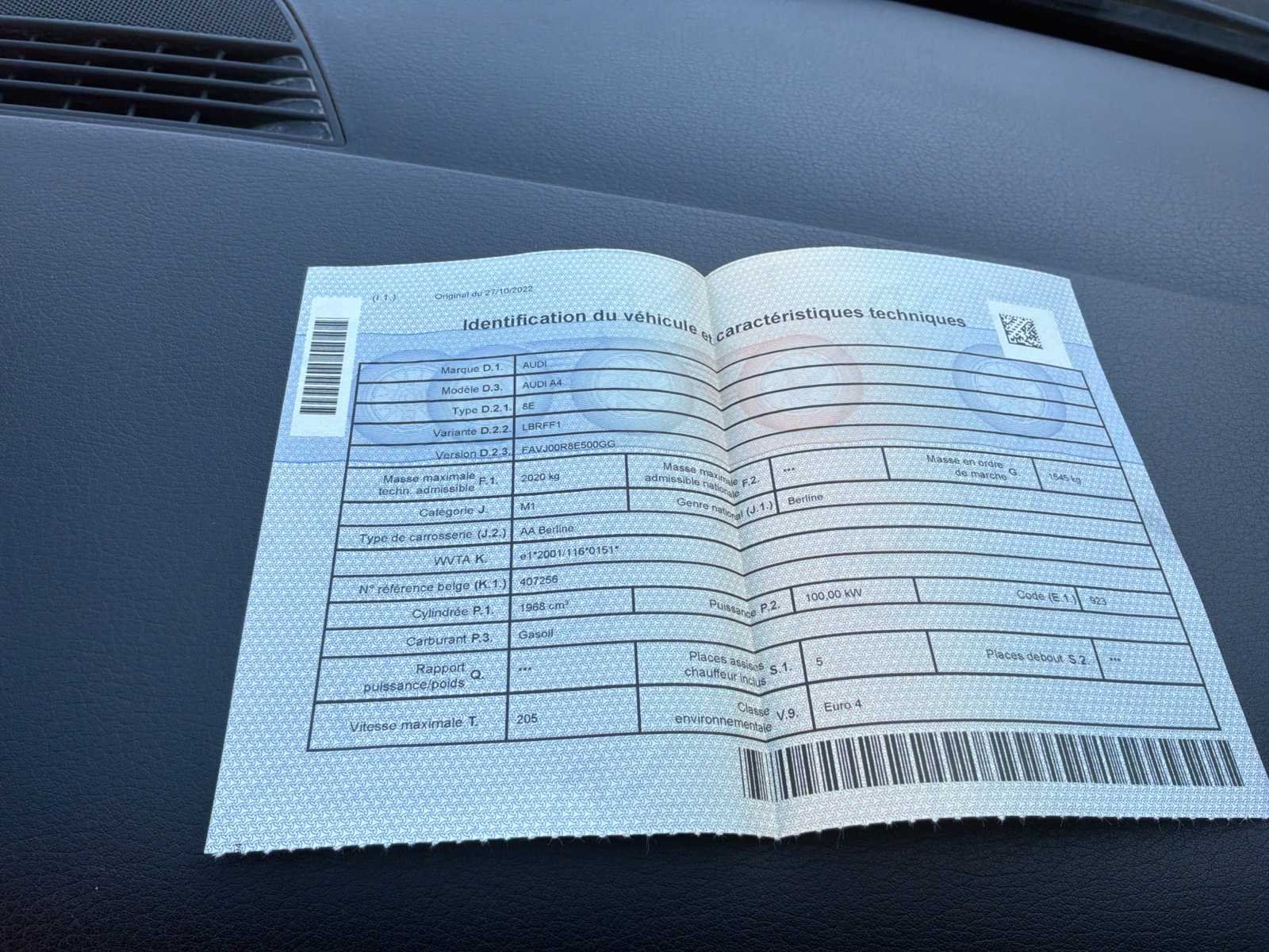 Merk: Audi Model: A4 Type: 8E Bouwjaar: 2007 Afgelezen kilometerstand: 299153km Cilinderinhoud: 1968cc Vermogen (kW): 100kW Brandstof: Diesel Chassisnummer: WAUZZZ8E78A086010 Datum eerste toelating: 12/10/2017 APK vervaldatum: 26/10/2026 Aantal zitplaatsen: 5 Kleur: Zwart Stuurwiel: Links Aantal deuren: 4 Aantal sleutels: 2 Carrosserie: Sedan Nationaliteit documenten: België Gelijkvormigheidsattest aanwezig: true Vavato voert geen technische keuring uit.: true Airconditioning: true Navigatie: true Inschrijvingsbewijs - deel 1 : Oké Inschrijvingsbewijs - deel 2: Oké