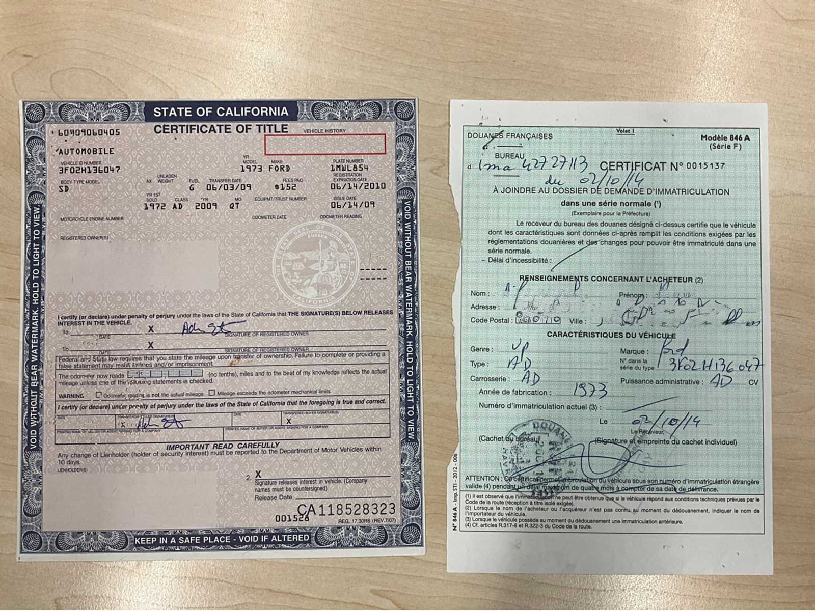 Non Chassisnummer: 3F02H136047 Merk: Ford Model: Mustang Type: Mach 1 Brandstof: Benzine Nationaliteit documenten: Frankrijk Aandrijving: Ja Transmissie: Automatisch Vermogen (pk): 177 Stuurwiel: Links USA titel: Oui Kleur: Rood Cilinderinhoud: 5800 Aantal cilinders: 8 Bouwjaar: 1973