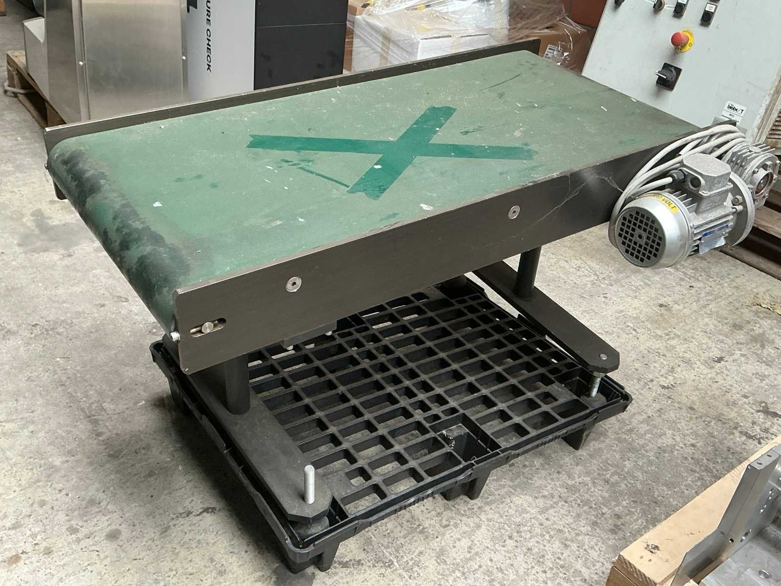Werkbreedte: 480mm, lengte transportband circa 1025mm, 380V, Reeds gedemonteerd Bouwjaar: 2001 Band afm. b: 480mm Totale afmeting L: 1050mm Totale afmeting Breedte: 680mm Totale afmeting Hoogte: 600mm