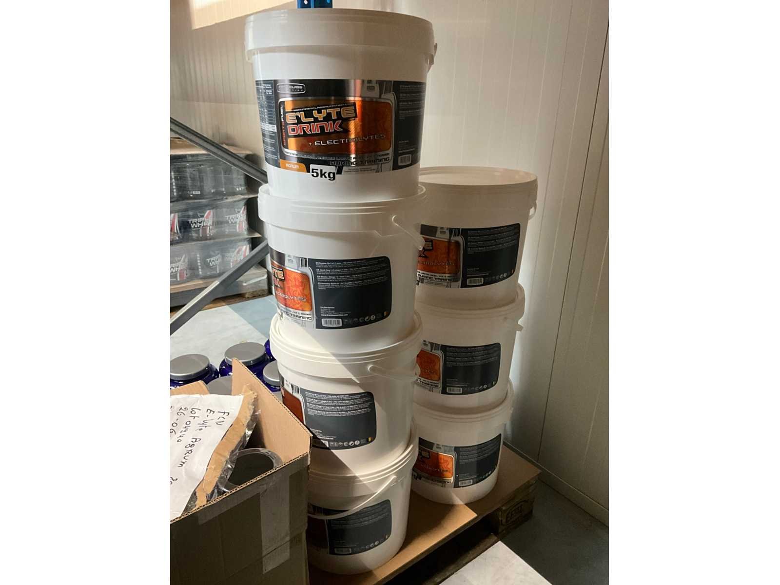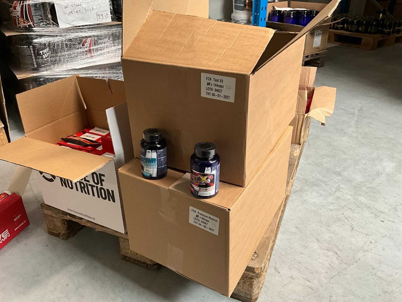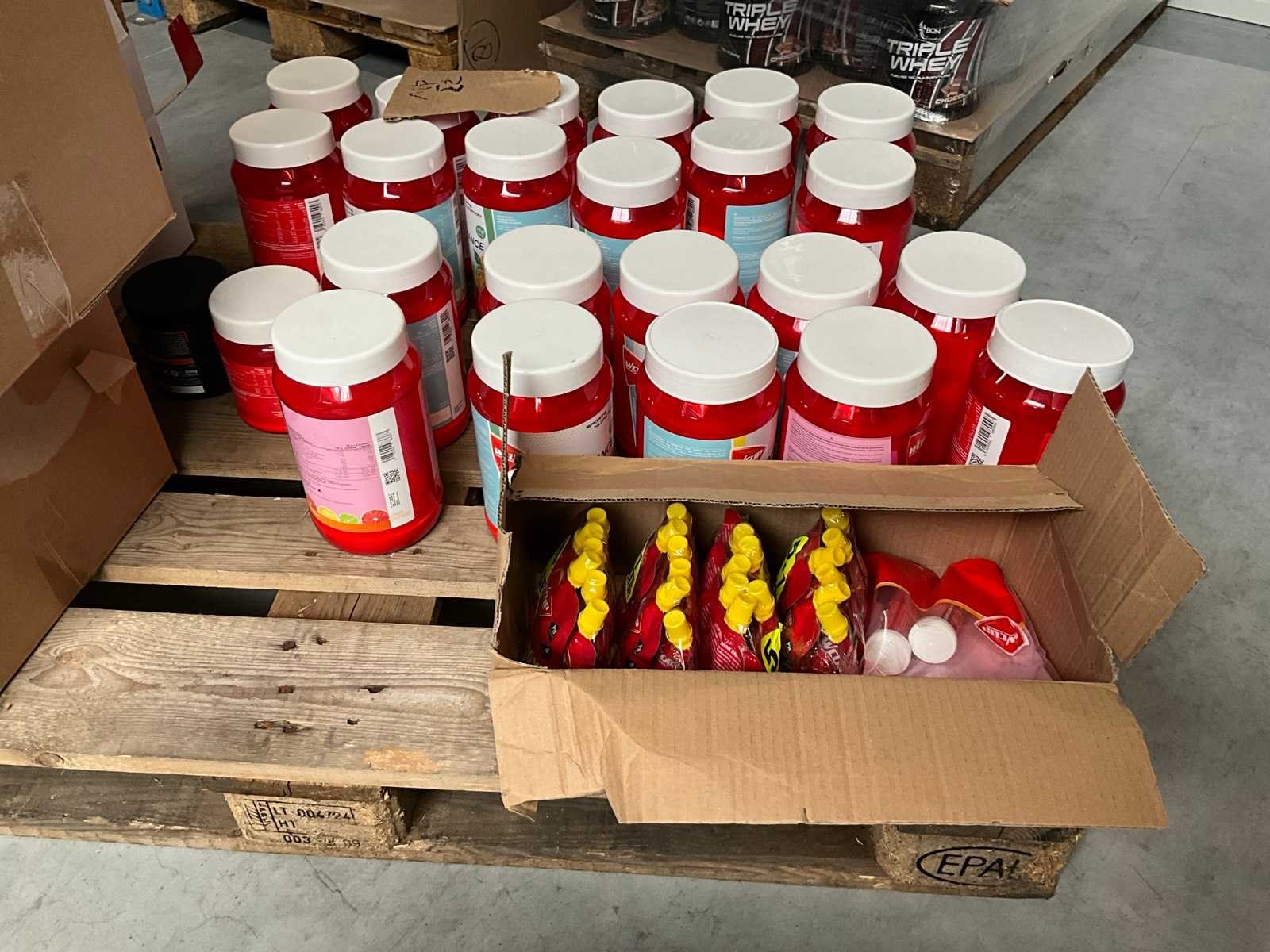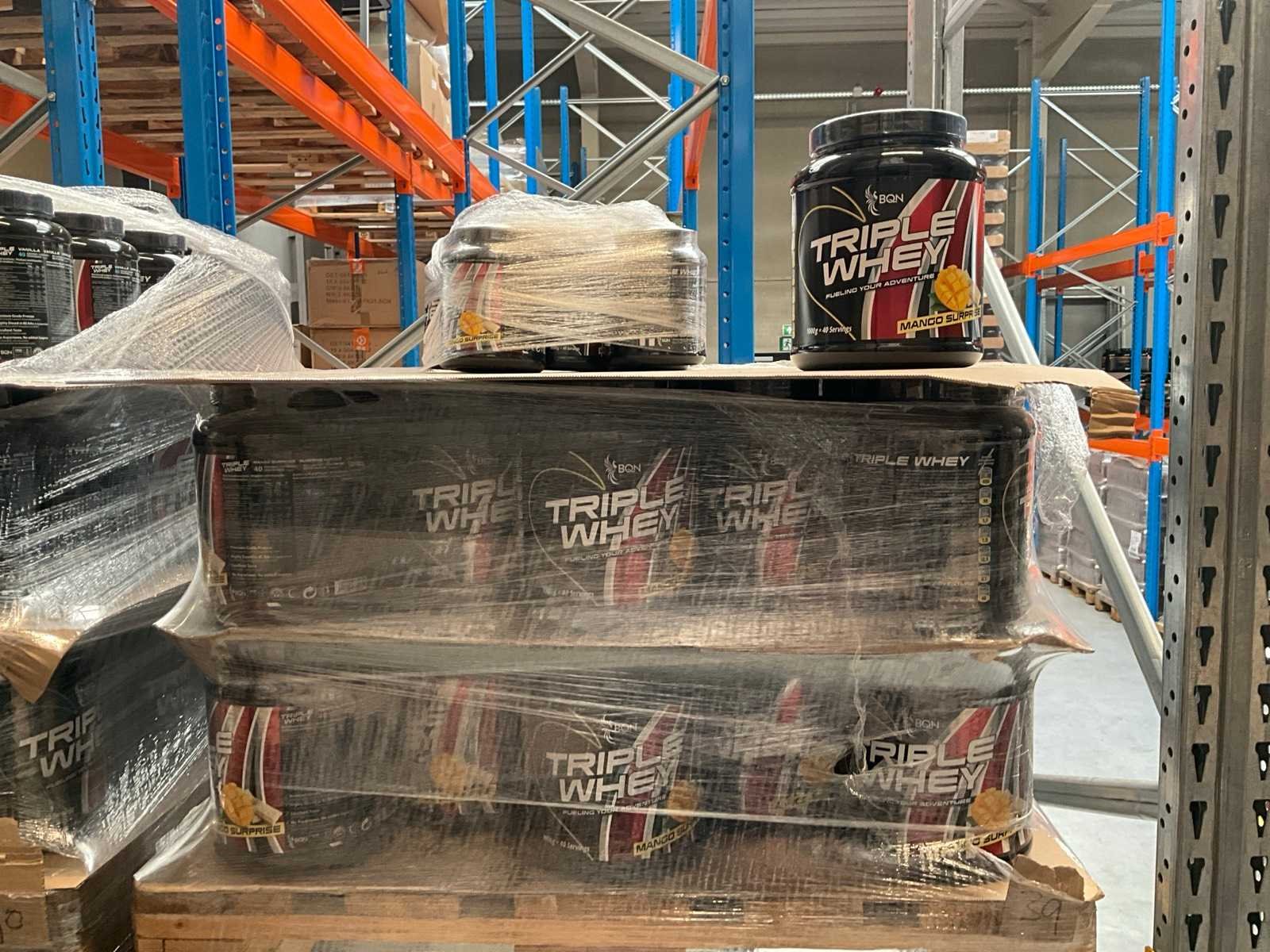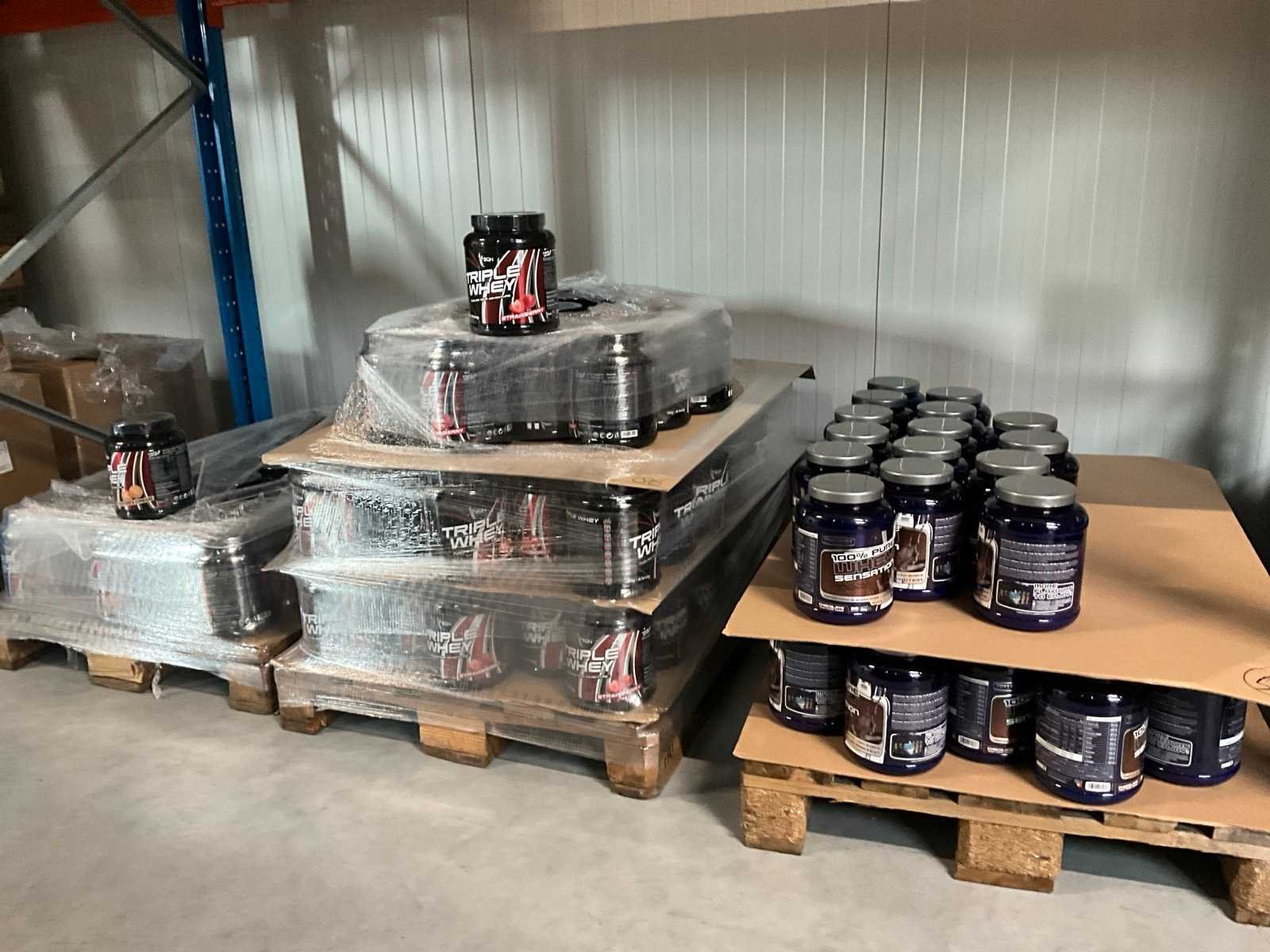 Circa 190 stuks, waaronder: 34x BQN Triple Whey 1000g cookies & cream 86x BQN Triple Whey 1000g strawberry 90x BQN Triple Whey 1000g vanilla 39x BQN Triple Whey 1000g mango surprise 50x First Class Nutrition 900g chocolate 18x First Class Nutrition 2000g chocolate 113x BQN Triple Whey 1000g chocolate 45x M Double You 360g Glutamine powder 23x diverse WCUP sports drinks 19x First Class Nutrition Elyte Drink 2000g 16x First Class Nutrition Elyte Drink 800g zonder etiket 37x First Class Nutrition Test-X 144 capsules 30x First Class Nutrition Premium Multivit 60 capsules 6x 12x 40ml diverse WCUP gels 3x 12 electrolyte tablets ( 12stuks ) waaronder 1 aangesproken 1x 20 x 30g WCUP sport nougat 7x First Class Nutrition Elyte Drink 5kg 207 x Bèta Alaline 120 caps 109x M Double You Whey Amino 400 tablets Liggende op 10 pallets Gewicht: 1000g
