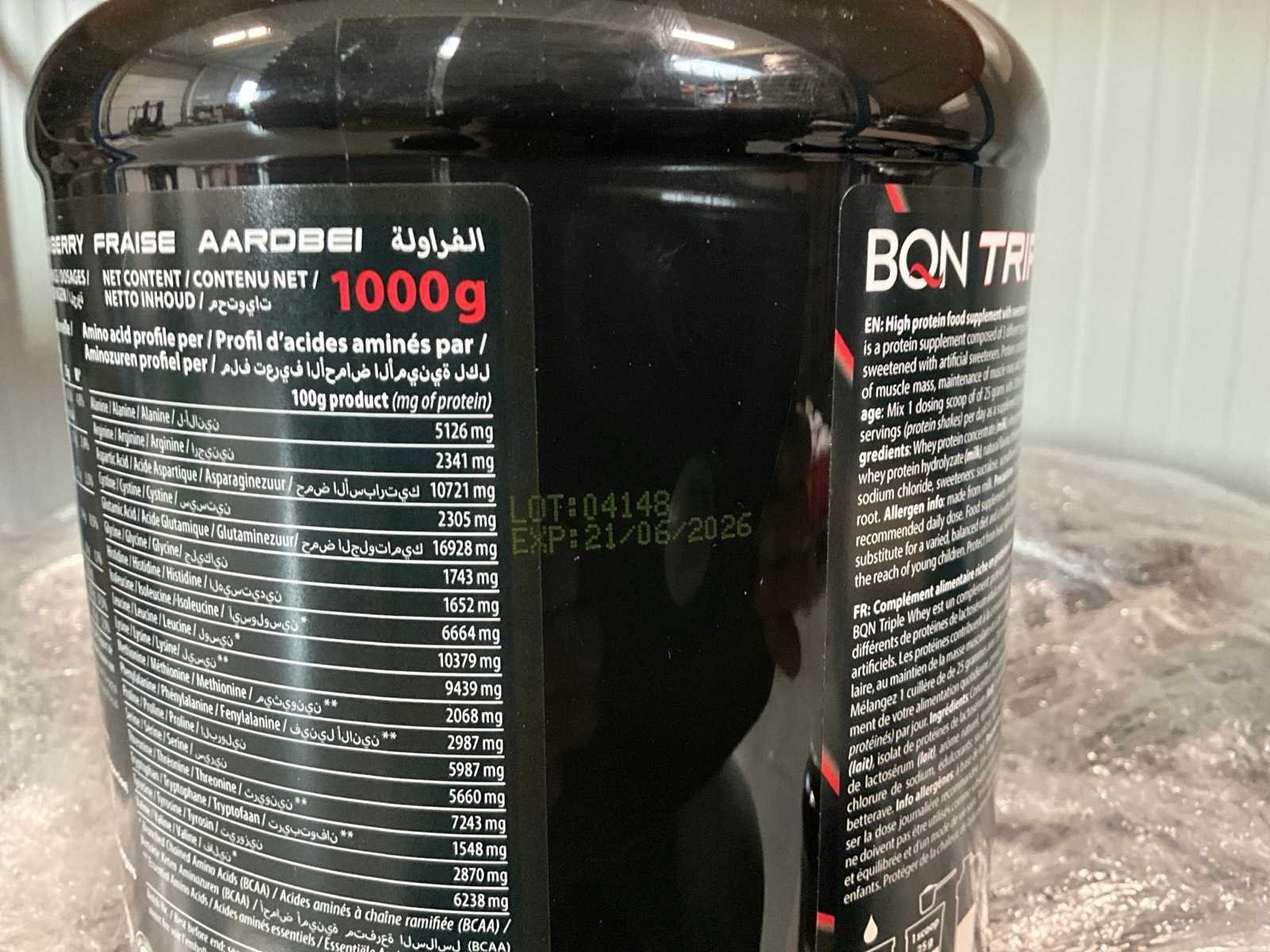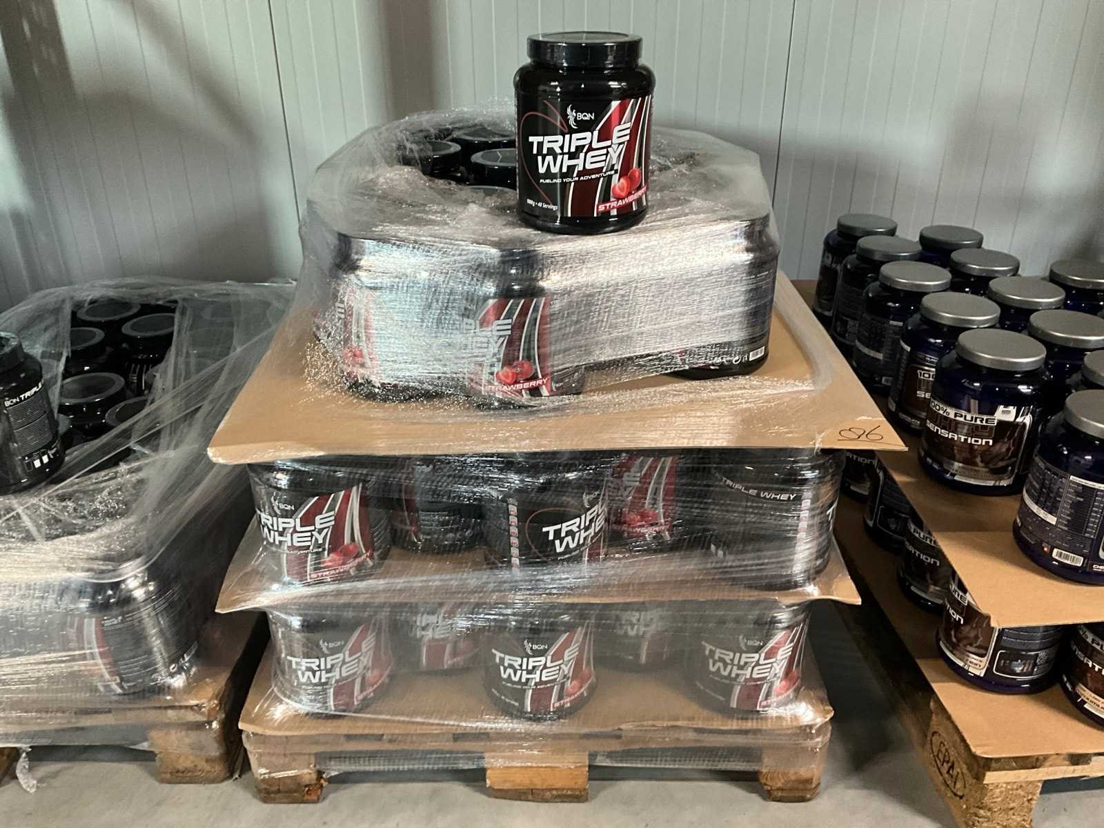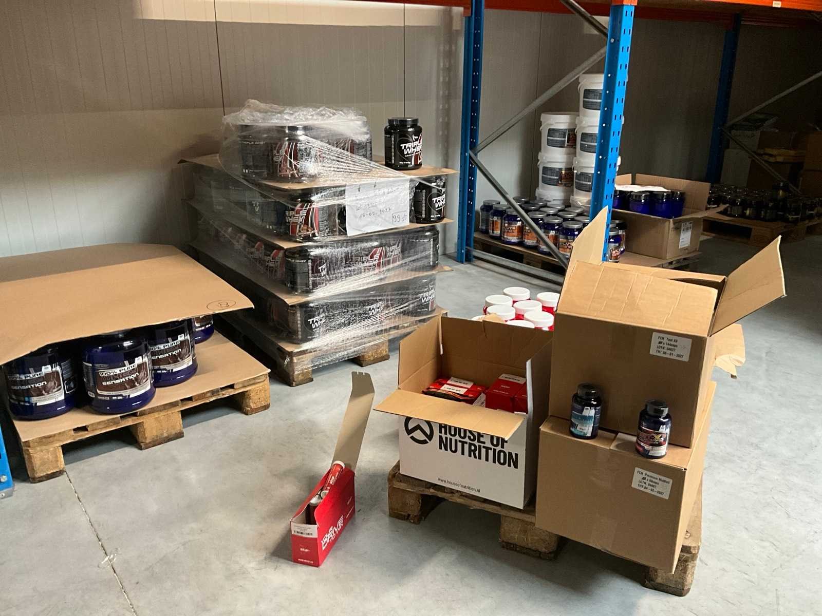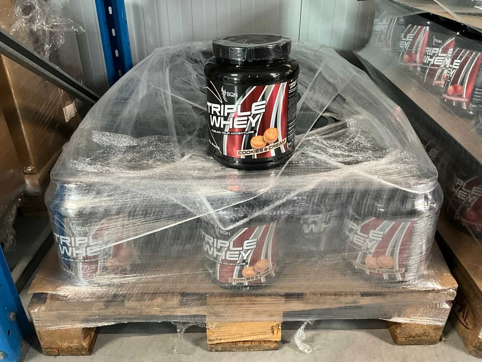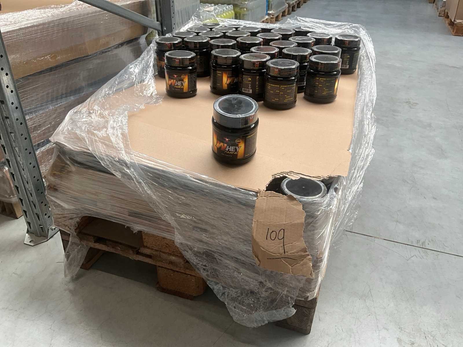 Circa 190 stuks, waaronder: 34x BQN Triple Whey 1000g cookies & cream 86x BQN Triple Whey 1000g strawberry 90x BQN Triple Whey 1000g vanilla 39x BQN Triple Whey 1000g mango surprise 50x First Class Nutrition 900g chocolate 18x First Class Nutrition 2000g chocolate 113x BQN Triple Whey 1000g chocolate 45x M Double You 360g Glutamine powder 23x diverse WCUP sports drinks 19x First Class Nutrition Elyte Drink 2000g 16x First Class Nutrition Elyte Drink 800g zonder etiket 37x First Class Nutrition Test-X 144 capsules 30x First Class Nutrition Premium Multivit 60 capsules 6x 12x 40ml diverse WCUP gels 3x 12 electrolyte tablets ( 12stuks ) waaronder 1 aangesproken 1x 20 x 30g WCUP sport nougat 7x First Class Nutrition Elyte Drink 5kg 207 x Bèta Alaline 120 caps 109x M Double You Whey Amino 400 tablets Liggende op 10 pallets Gewicht: 1000g