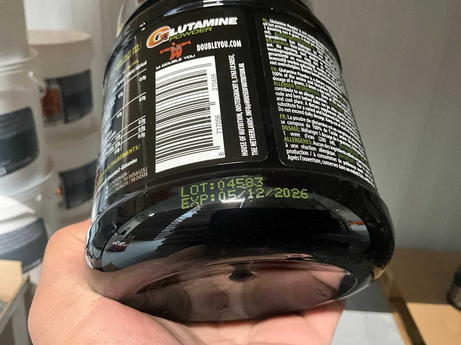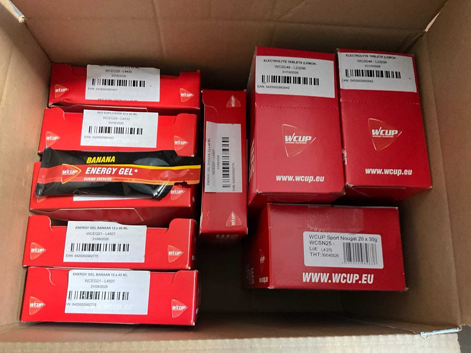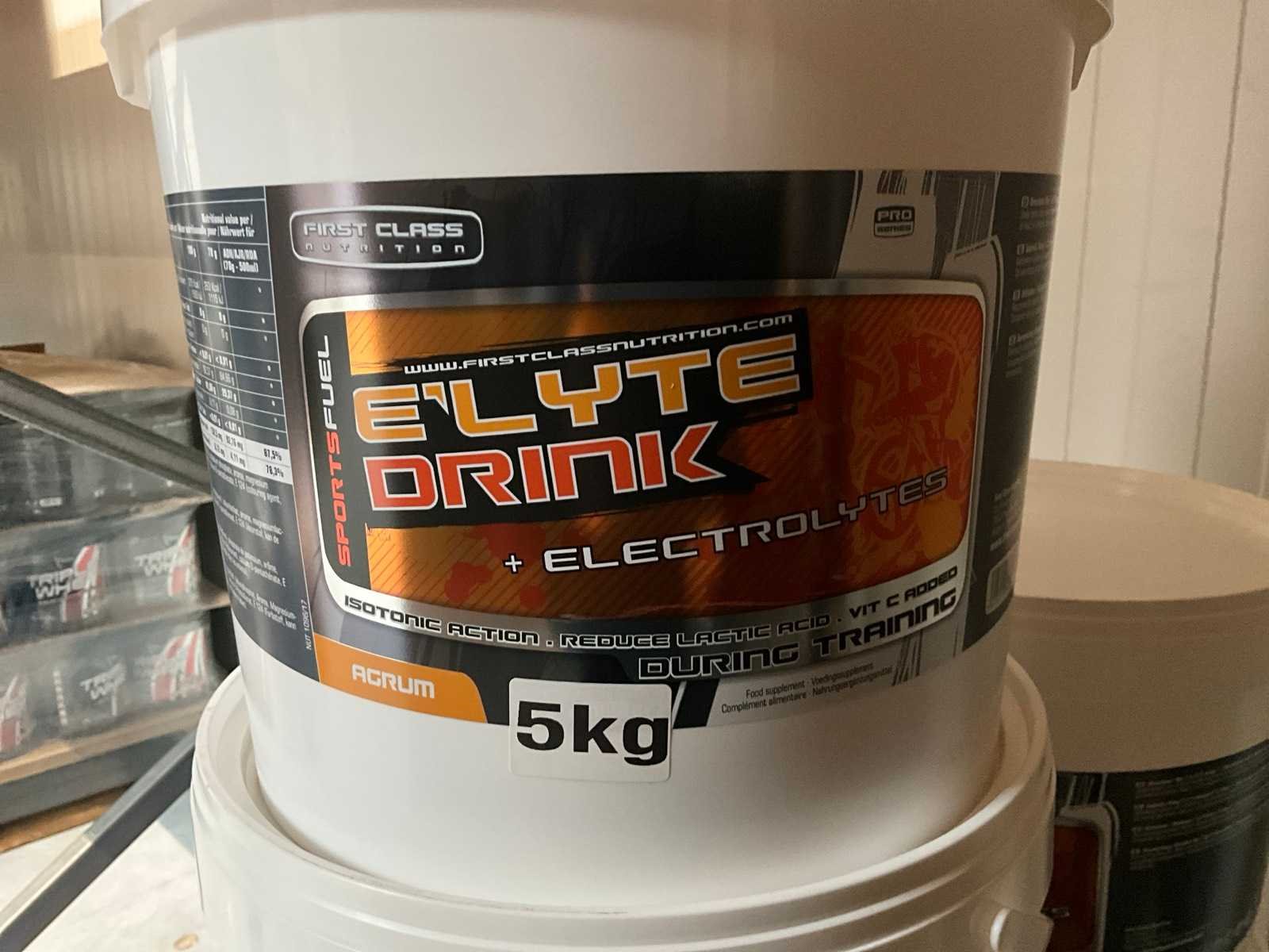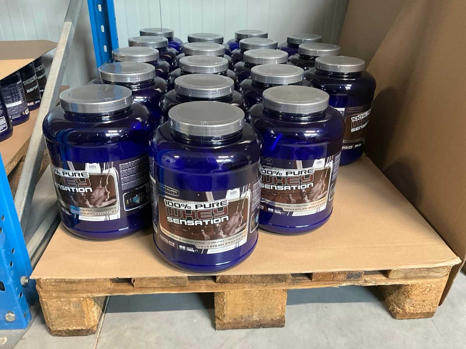 Circa 190 stuks, waaronder: 34x BQN Triple Whey 1000g cookies & cream 86x BQN Triple Whey 1000g strawberry 90x BQN Triple Whey 1000g vanilla 39x BQN Triple Whey 1000g mango surprise 50x First Class Nutrition 900g chocolate 18x First Class Nutrition 2000g chocolate 113x BQN Triple Whey 1000g chocolate 45x M Double You 360g Glutamine powder 23x diverse WCUP sports drinks 19x First Class Nutrition Elyte Drink 2000g 16x First Class Nutrition Elyte Drink 800g zonder etiket 37x First Class Nutrition Test-X 144 capsules 30x First Class Nutrition Premium Multivit 60 capsules 6x 12x 40ml diverse WCUP gels 3x 12 electrolyte tablets ( 12stuks ) waaronder 1 aangesproken 1x 20 x 30g WCUP sport nougat 7x First Class Nutrition Elyte Drink 5kg 207 x Bèta Alaline 120 caps 109x M Double You Whey Amino 400 tablets Liggende op 10 pallets Gewicht: 1000g