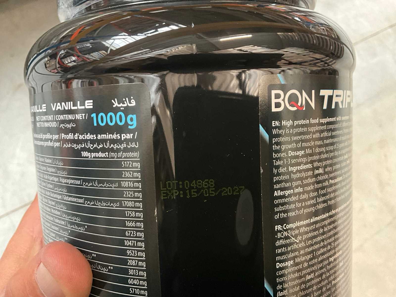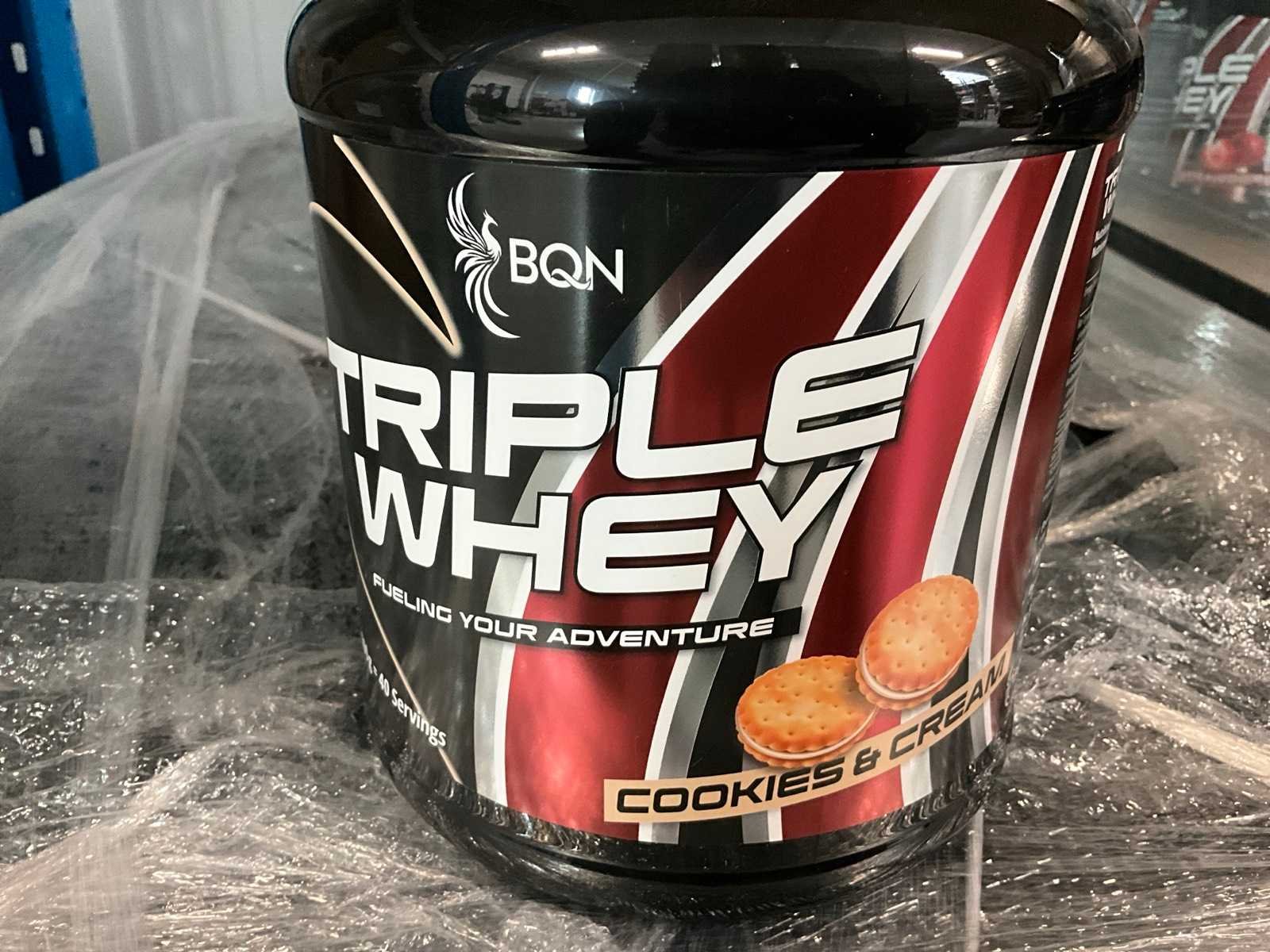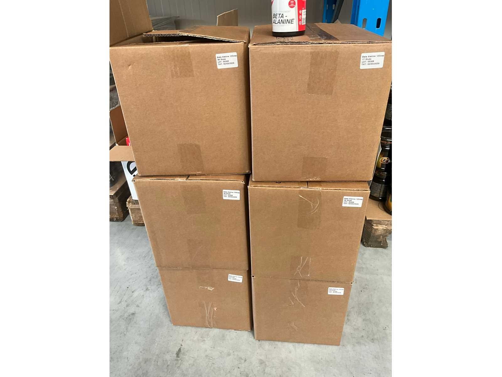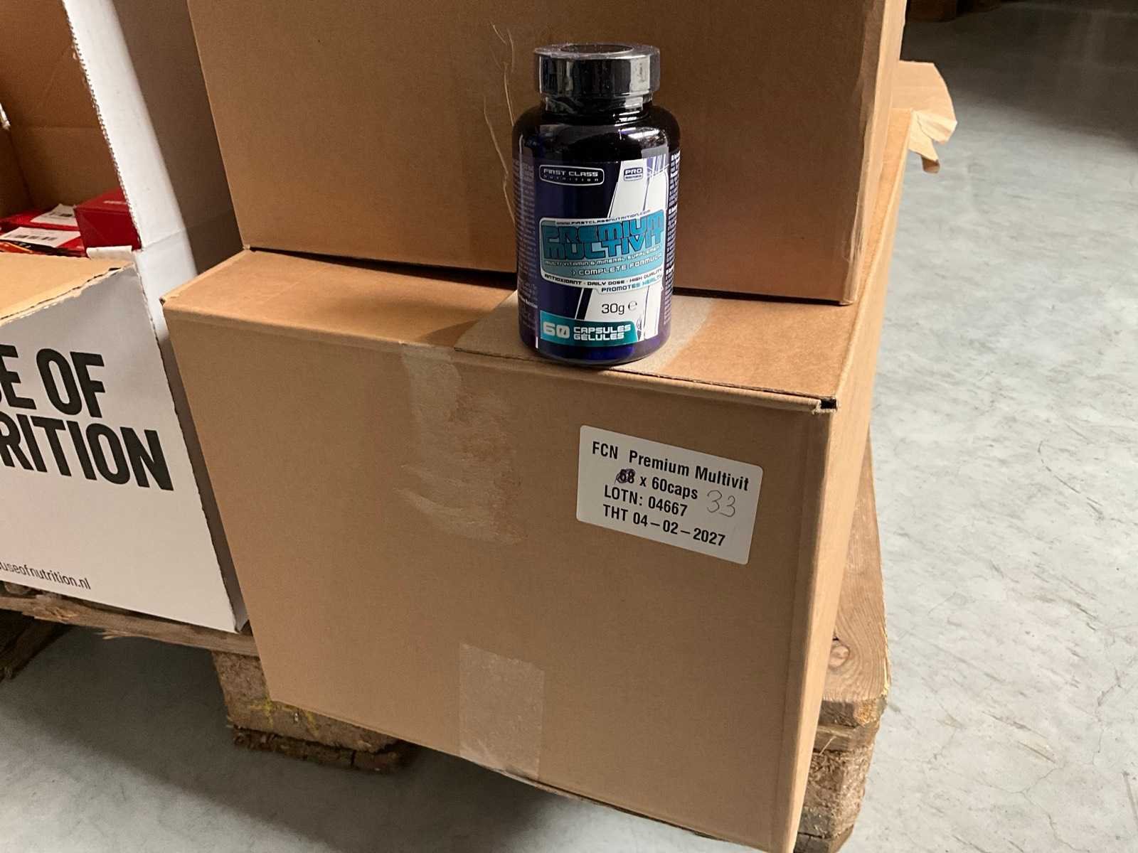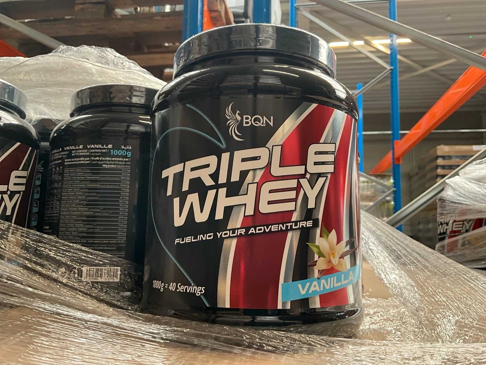 Circa 190 stuks, waaronder: 34x BQN Triple Whey 1000g cookies & cream 86x BQN Triple Whey 1000g strawberry 90x BQN Triple Whey 1000g vanilla 39x BQN Triple Whey 1000g mango surprise 50x First Class Nutrition 900g chocolate 18x First Class Nutrition 2000g chocolate 113x BQN Triple Whey 1000g chocolate 45x M Double You 360g Glutamine powder 23x diverse WCUP sports drinks 19x First Class Nutrition Elyte Drink 2000g 16x First Class Nutrition Elyte Drink 800g zonder etiket 37x First Class Nutrition Test-X 144 capsules 30x First Class Nutrition Premium Multivit 60 capsules 6x 12x 40ml diverse WCUP gels 3x 12 electrolyte tablets ( 12stuks ) waaronder 1 aangesproken 1x 20 x 30g WCUP sport nougat 7x First Class Nutrition Elyte Drink 5kg 207 x Bèta Alaline 120 caps 109x M Double You Whey Amino 400 tablets Liggende op 10 pallets Gewicht: 1000g