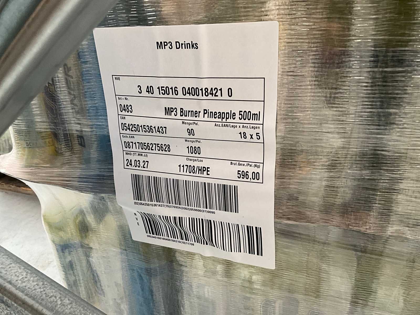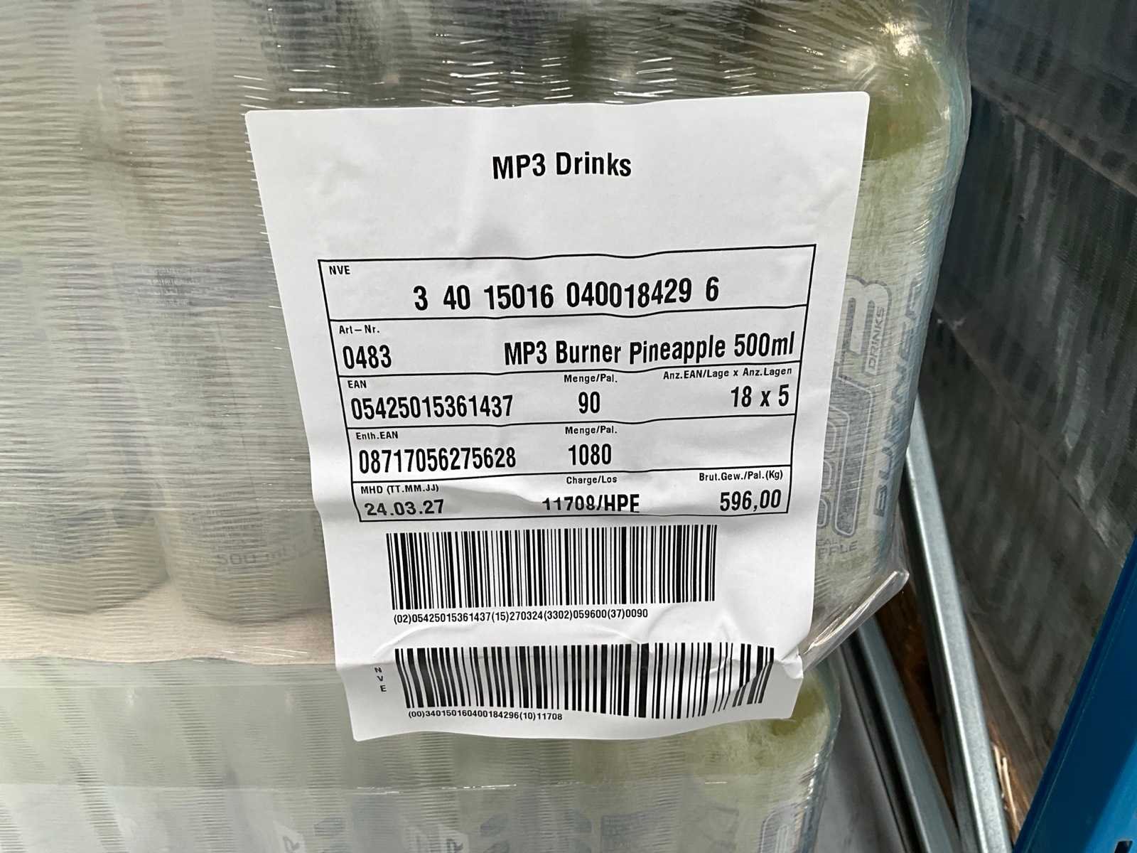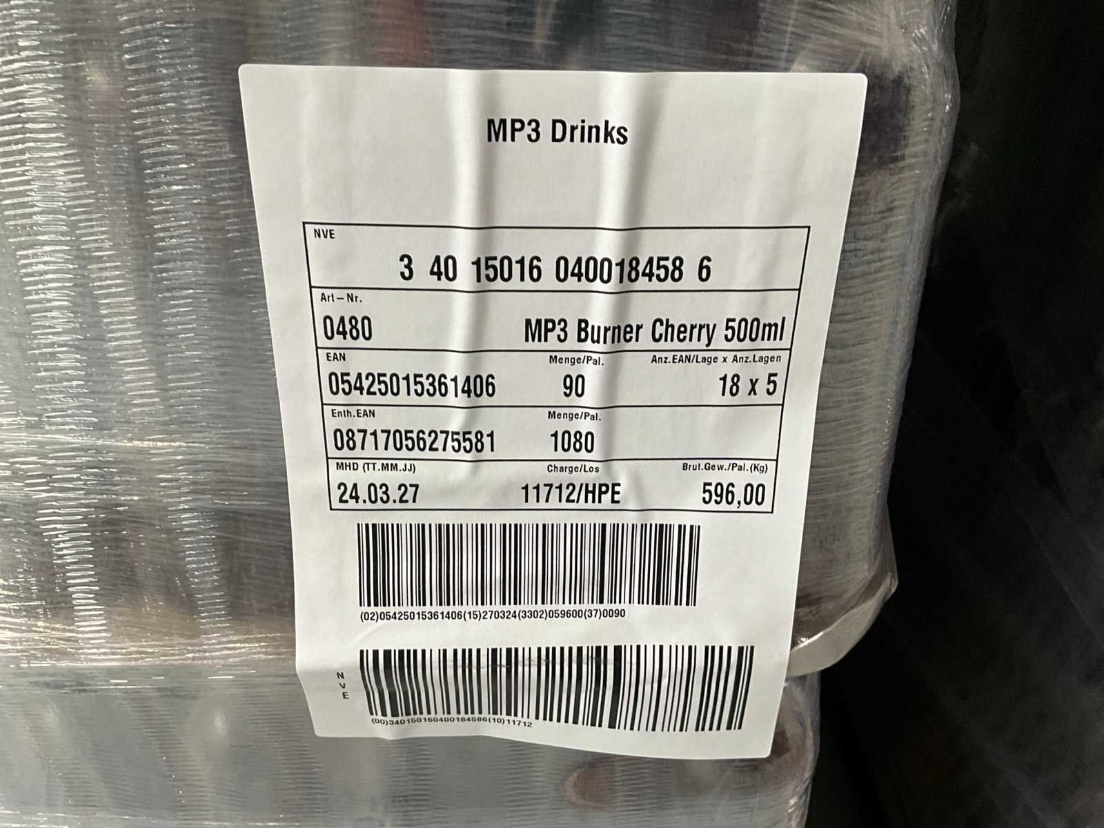 Bestaande uit: 8928x Burner Tropical Pineapple 1260x isotonic orange 3372x isotonic lemon 1080x energized blueberry 2748x Burner wild cherry Liggende op 19 pallets Merk: MP3 Drinks
