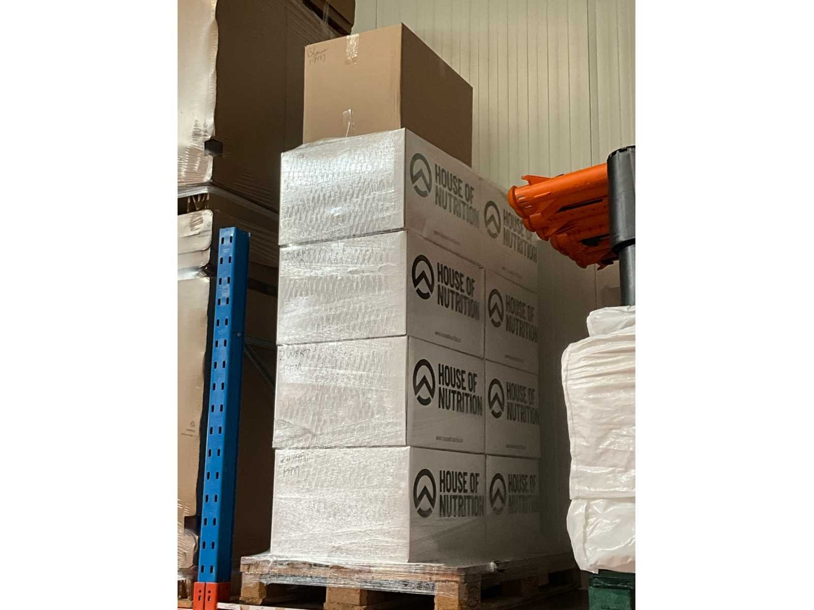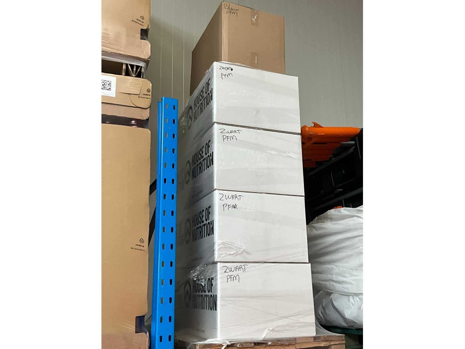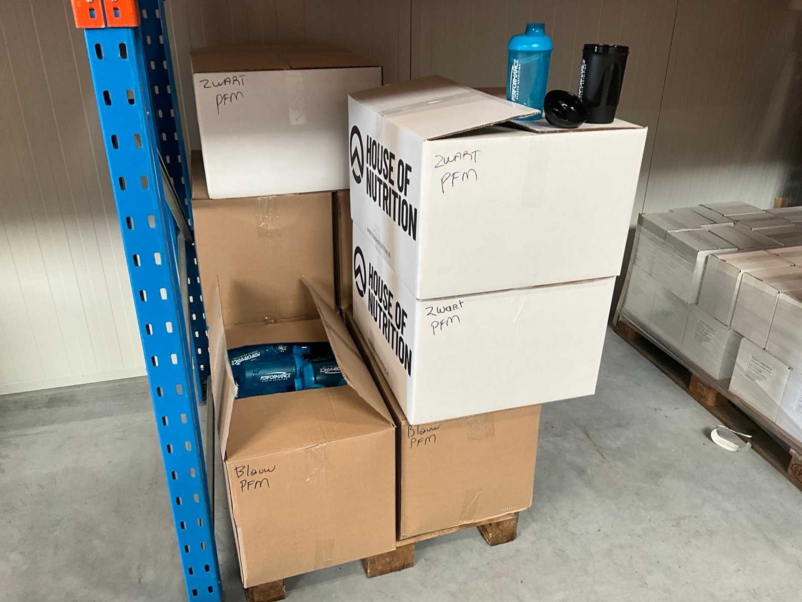Getekend Performance Sports Nutrition , in blauwe en zwarte uitvoering . Liggende in 18 dozen op 2 pallets. Merk: Wave