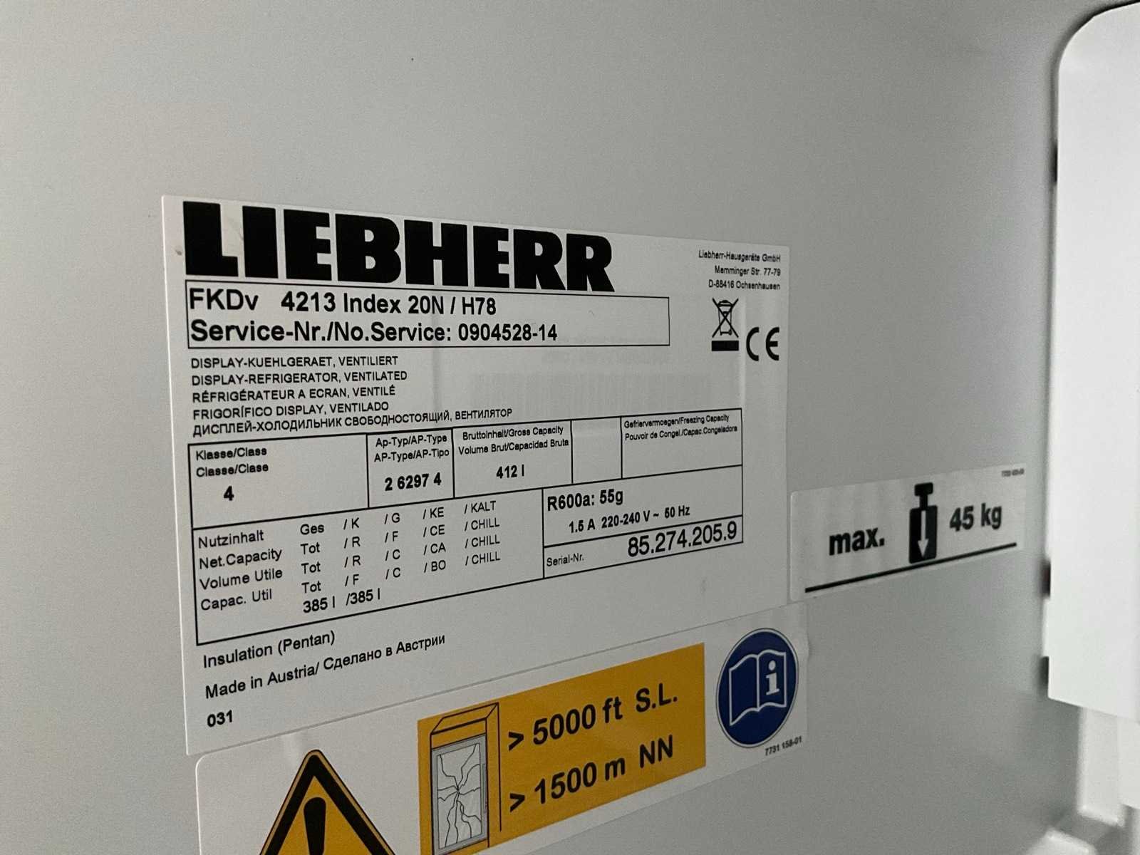 Merk: Liebherr Type: FKDv Aansluiting: 230V Capaciteit.: 412l