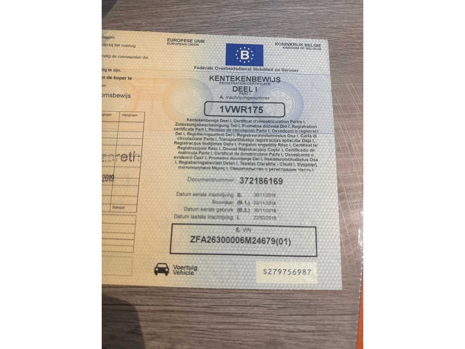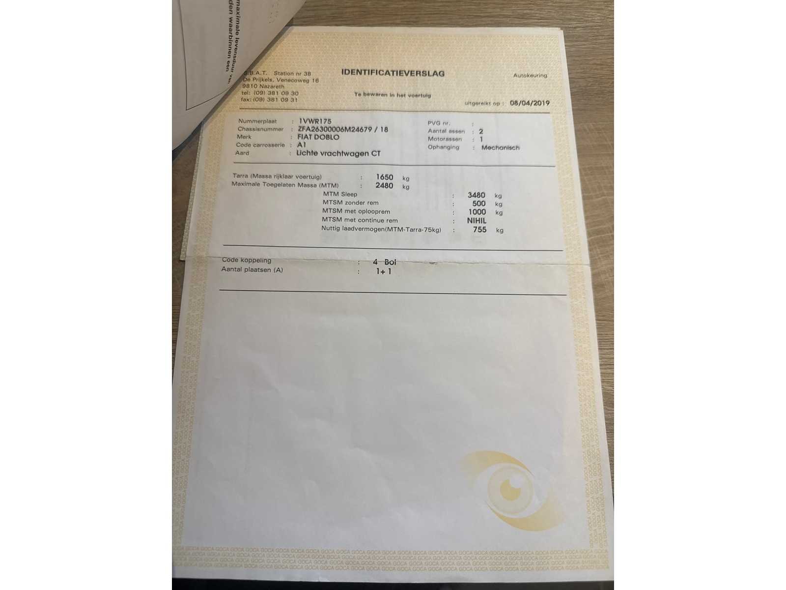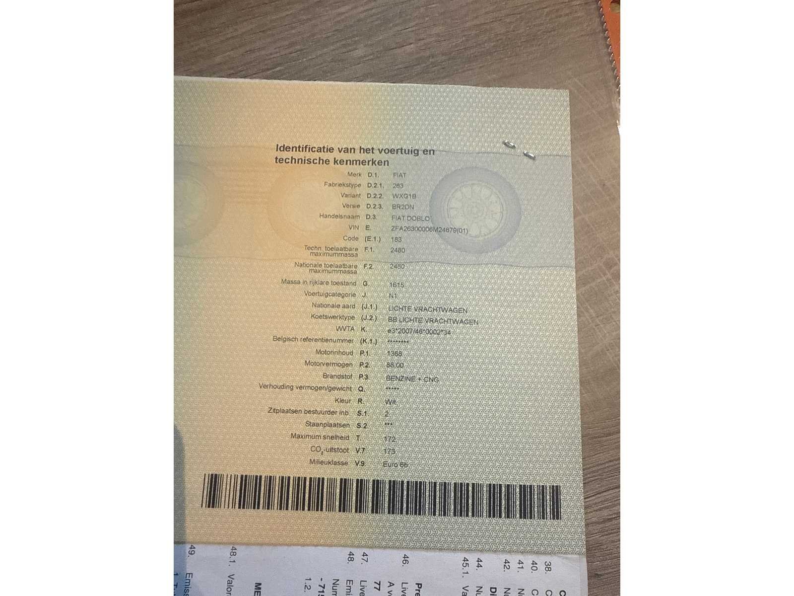 PERFECTE STAAT 1 STE EIGENAAR GROOT ONDERHOUD GEHAD FACTUUR AANWEZIG BOORDDOCUMENTEN AANWEZIG Merk: FIAT Model: DOBLO Type: CNG Bouwjaar: 2018 Afgelezen kilometerstand: 53000km Cilinderinhoud: 1400cc Vermogen (kW): 88kW Brandstof: BENZINE & CNG Chassisnummer: ZFA26300006M24679 Datum eerste toelating: 30-11-2018 Kleur: WIT Transmissie: MANUEEL Emissieklasse: 6 Aantal deuren: 3 Aantal sleutels: 3 Nationaliteit documenten: BELGIE Gelijkvormigheidsattest aanwezig: true Carpass: true Start en rijdt: JA Keuringsrapport geldig tot: 30-11-2024 Andere boorddocumenten: COMPLEET startinformatie : JA Inschrijvingsbewijs - deel 1 : AANWEZIG Inschrijvingsbewijs - deel 2: AANWEZIG