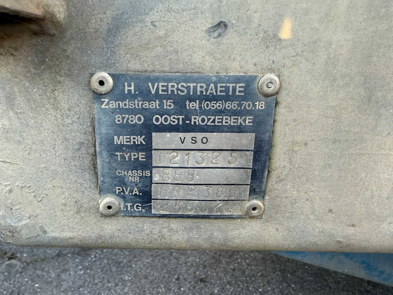 GOEDE STAAT 1 STE EIGENAAR EX GEMEENTE TRAILER Merk: VSO Type: D21325 Bouwjaar: 1991 Chassisnummer: 888-02 Aantal assen: 2 Ledig gewicht: 630kg Laadvermogen: 2500kg Kentekenpapieren compleet?: true Nationaliteit documenten: BELGIE