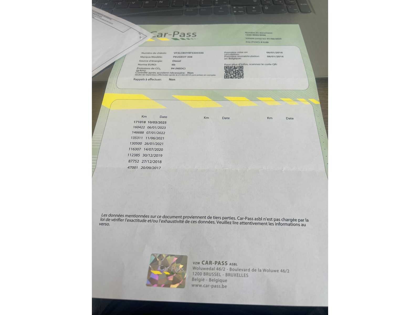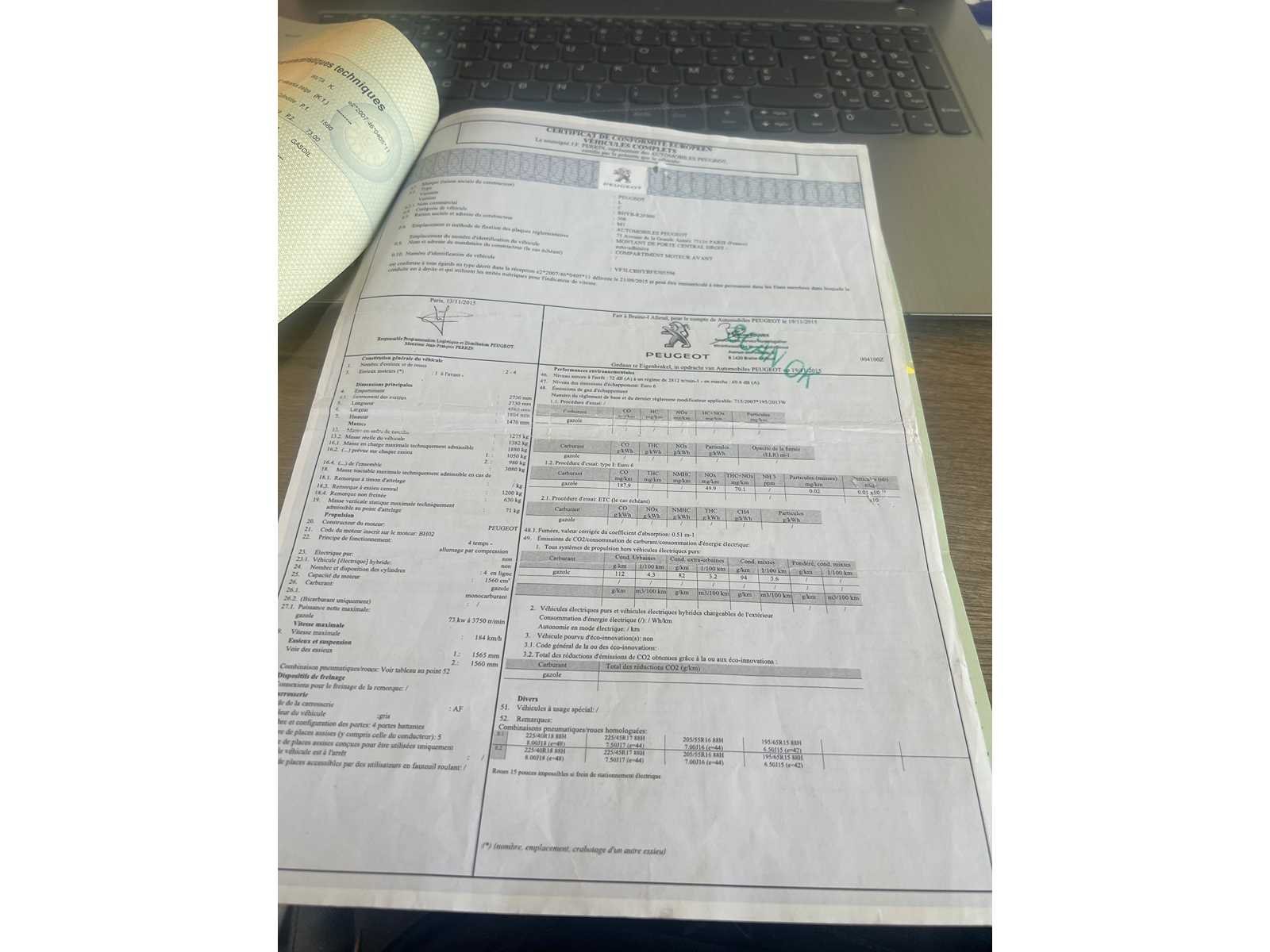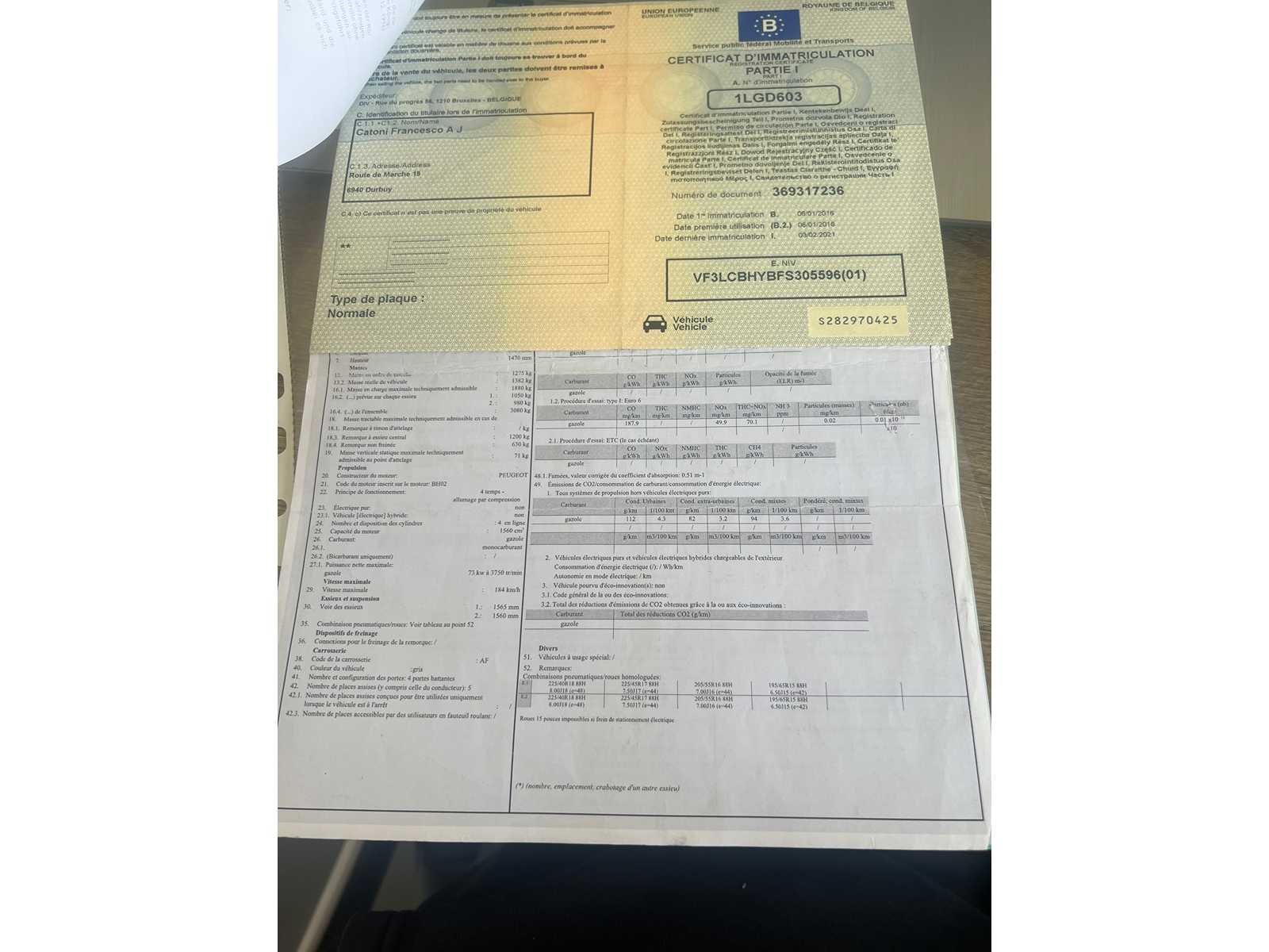 PAPIEREN AANWEZIG START NIET Merk: PEUGEOT Model: 308 Bouwjaar: 2016 Afgelezen kilometerstand: 171000km Cilinderinhoud: 1560cc Vermogen (kW): 73kW Brandstof: DIESEL Chassisnummer: VF3LCBHYBFS305596 Datum eerste toelating: 06-01-2016 Aantal zitplaatsen: 5 Kleur: GRIJS Transmissie: MANUEEL Emissieklasse: 5 Aantal deuren: 5 Aantal sleutels: 2 Nationaliteit documenten: BELGIE Gelijkvormigheidsattest aanwezig: true Carpass: true Start en rijdt: NEEN Andere boorddocumenten: AANWEZIG startinformatie : NEEN Inschrijvingsbewijs - deel 1 : AANWEZIG Inschrijvingsbewijs - deel 2: AANWEZIG