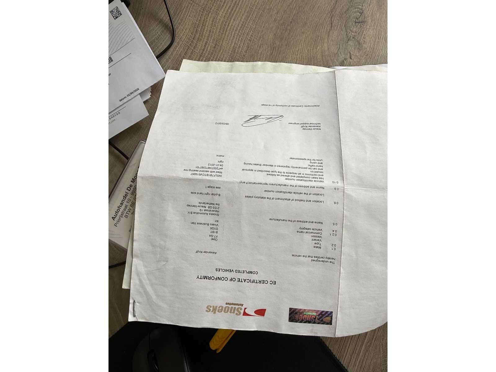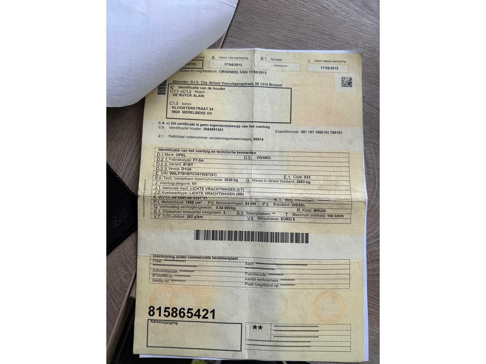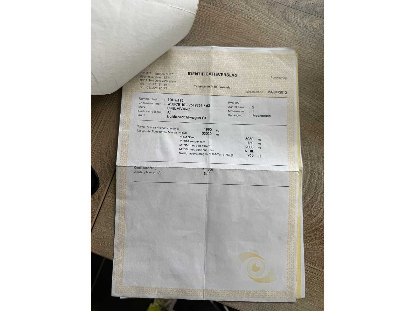 ALLE PAPIEREN AANWEZIG AUTOMAAT START EN RIJD AFKOMSTIG VAN 1 STE EIGENAAR Merk: OPEL Model: VIVARO Type: DUBBEL CABINE Bouwjaar: 2012 Afgelezen kilometerstand: 369000km Cilinderinhoud: 1998cc Vermogen (kW): 84kW Brandstof: DIESEL Chassisnummer: W0LF7B1BTCV619267 Datum eerste toelating: 17-04-2012 Aantal zitplaatsen: 6 Kleur: GRIJS Transmissie: AUTOMAAT Emissieklasse: 5 Aantal deuren: 5 Aantal sleutels: 1 Nationaliteit documenten: BELGIE Gelijkvormigheidsattest aanwezig: true Carpass: true Start en rijdt: JA Keuringsrapport geldig tot: 23-04-2026 Andere boorddocumenten: COMPLEET startinformatie : JA Zichtbare schade: ZIE FOTO Airconditioning: true Inschrijvingsbewijs - deel 1 : AANWEZIG Inschrijvingsbewijs - deel 2: AANWEZIG