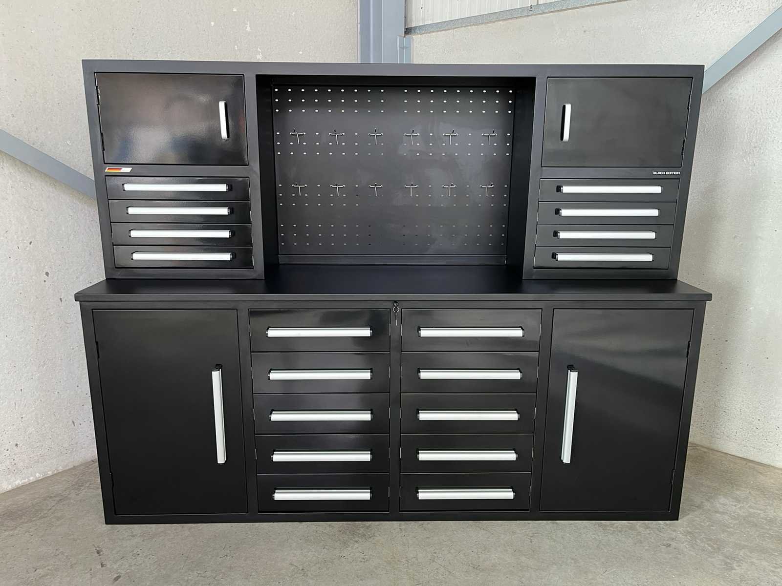 <ul> <li><strong>metalen werkbank</strong></li> <li><strong>afmetingen:</strong> 2210 x 580 x 1700 mm</li> <li><strong>laden:</strong> 18 laden</li> <li><strong>afmetingen laden onderaan:</strong> 450 x 480 x 120 mm</li> <li><strong>afmetingen laden bovenaan:</strong> 465 x 275 x 65 mm</li> <li><strong>capaciteit per lade:</strong> 40 kg</li> <li><strong>deuren:</strong> 4 deuren</li> <li><strong>afmetingen deuren onderaan:</strong> 500 x 800 mm</li> <li><strong>afmetingen deuren bovenaan:</strong> 520 x 310 mm</li> <li><strong>handgrepen:</strong> aluminium handgrepen</li> <li><strong>hoogte werkblad:</strong> 910 mm</li> <li><strong>werkblad:</strong> 30 mm dik werkblad</li> <li><strong>capaciteit werkblad:</strong> 750 kg</li> <li><strong>kleur:</strong> zwart</li> <li><strong>frame:</strong> gepoedercoat frame</li> <li><strong>fronten:</strong> gelakte fronten</li> <li><strong>gewicht:</strong> 300 kg</li> </ul>