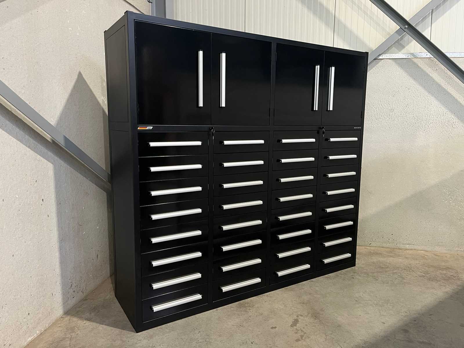 <ul> <li><strong>metalen werkplaatskast</strong></li> <li><strong>afmetingen:</strong> 2210 x 600 x 2050 mm</li> <li><strong>laden:</strong> 32 laden</li> <li><strong>afmetingen laden:</strong> 450 x 480 x 120 mm</li> <li><strong>capaciteit per lade:</strong> 40 kg</li> <li><strong>sluiting:</strong> laden afsluitbaar</li> <li><strong>deuren:</strong> 4 deuren</li> <li><strong>afmetingen deuren:</strong> 520 x 620 mm</li> <li><strong>handgrepen:</strong> aluminium handgrepen</li> <li><strong>kleur:</strong> zwart</li> <li><strong>frame:</strong> gepoedercoat frame</li> <li><strong>fronten:</strong> gelakte fronten</li> <li><strong>gewicht:</strong> 395 kg</li> <li><strong>staat:</strong> ongebruikt</li> </ul>