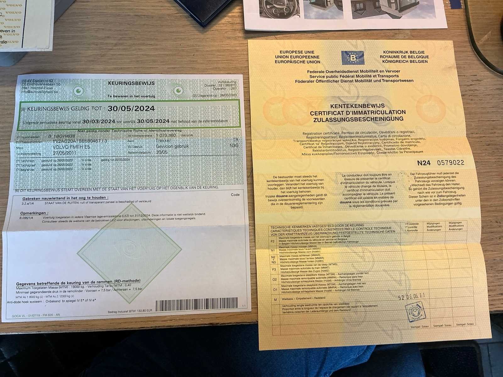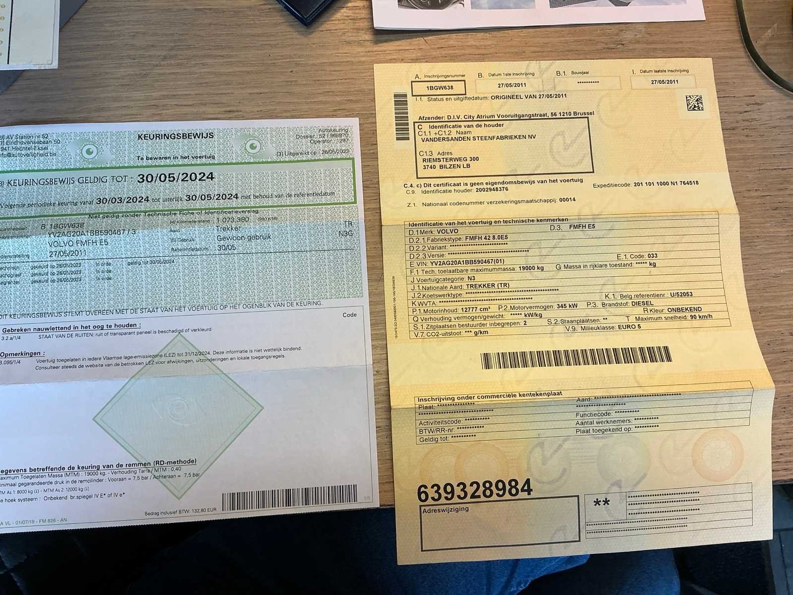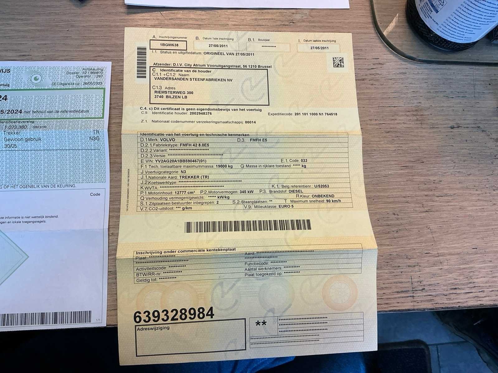 Voorzien van inschrijvingsbewijs aanwezig, gelijkvormigheidsattest, identificatieverslag en keuringsbewijs aanwezig Bestuurders raam sluit niet Merk: Volvo Type: FMFH E5 Bouwjaar: 2011 Chassisnummer VIN: YV2AG20A1BB590467 Cilinderinhoud: 12777cc Kilometerstand bij opname: 1117067.04km Datum eerste toelating: 27/05/2011 Emissieklasse: EURO 5 Nationaliteit documenten: Belgisch Kentekenpapieren compleet?: true