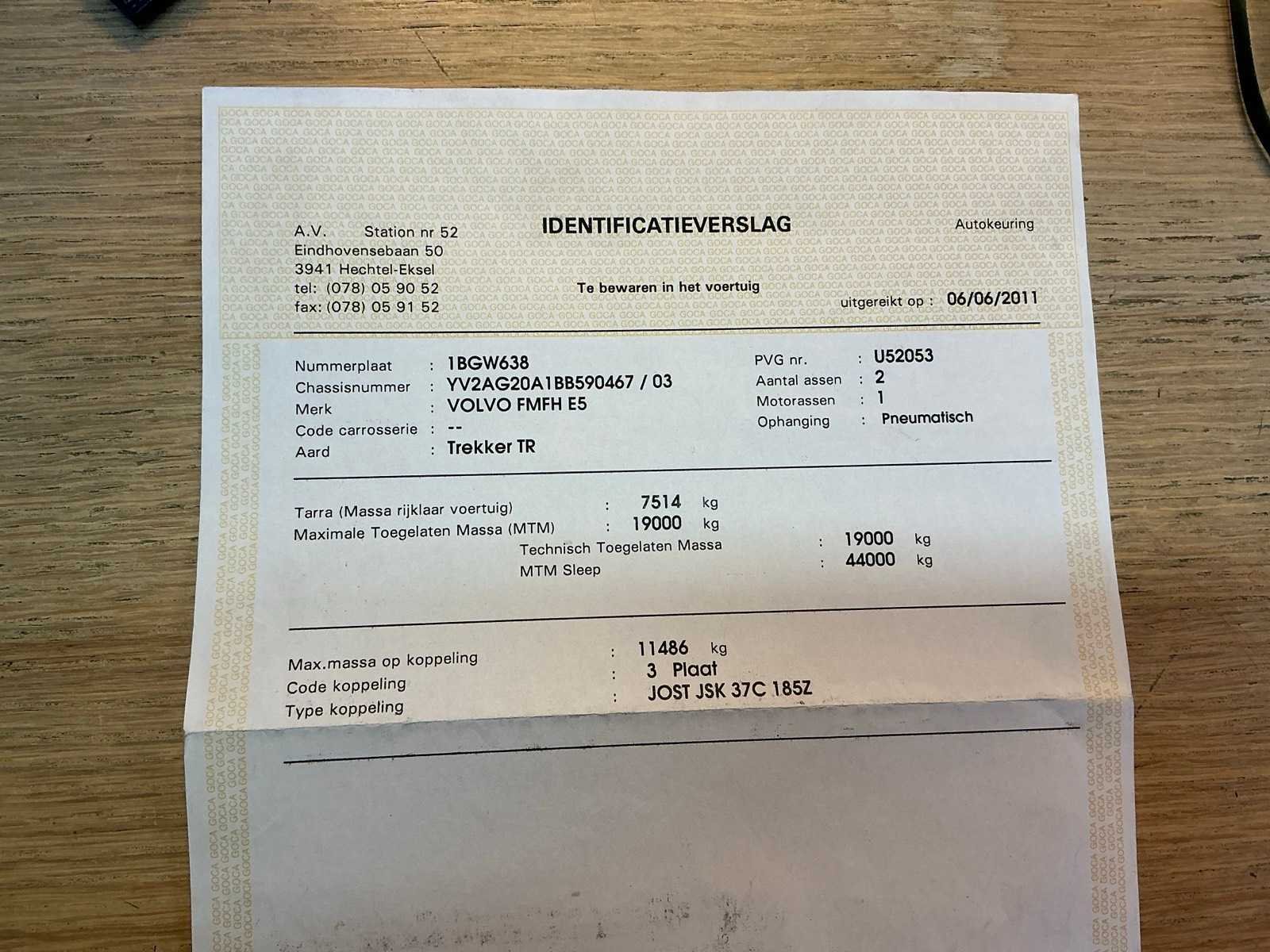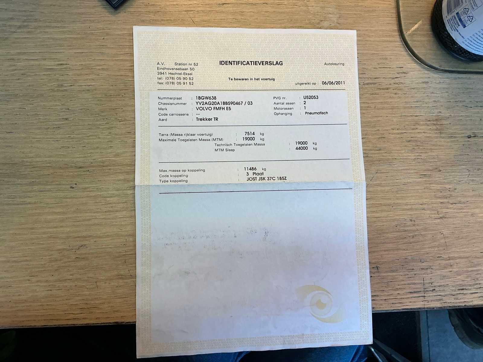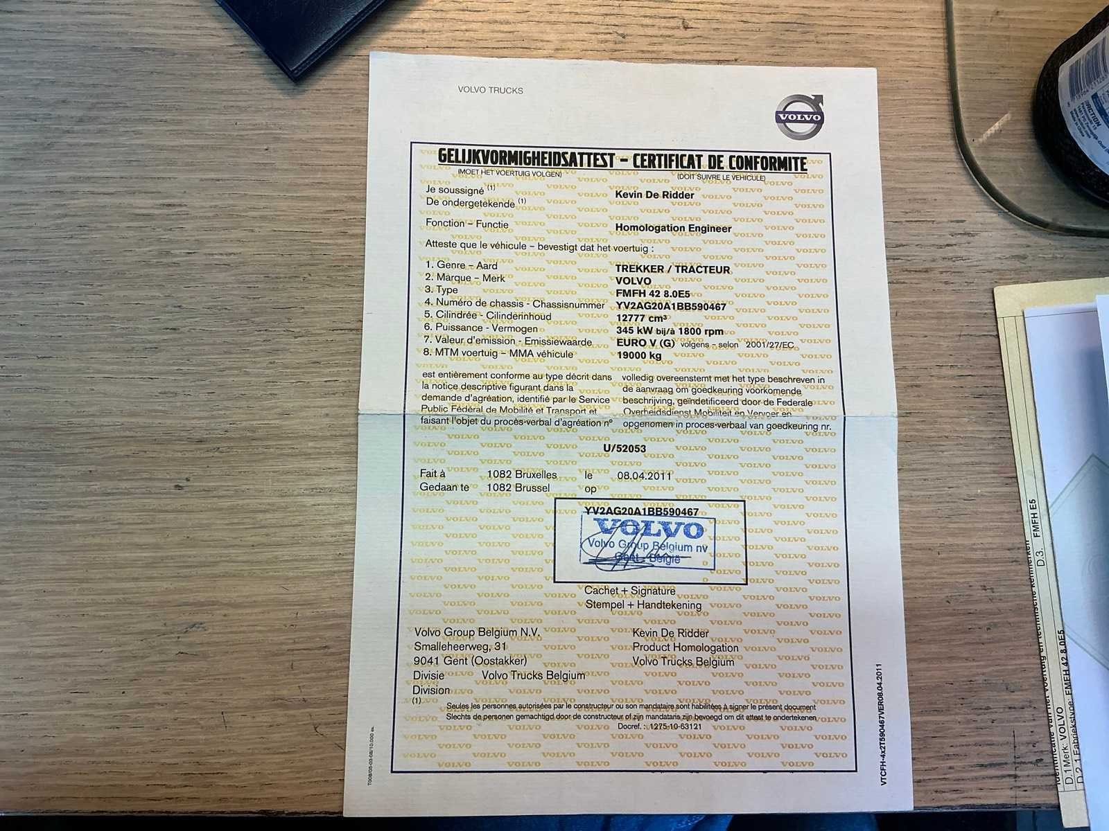 Voorzien van inschrijvingsbewijs aanwezig, gelijkvormigheidsattest, identificatieverslag en keuringsbewijs aanwezig Bestuurders raam sluit niet Merk: Volvo Type: FMFH E5 Bouwjaar: 2011 Chassisnummer VIN: YV2AG20A1BB590467 Cilinderinhoud: 12777cc Kilometerstand bij opname: 1117067.04km Datum eerste toelating: 27/05/2011 Emissieklasse: EURO 5 Nationaliteit documenten: Belgisch Kentekenpapieren compleet?: true