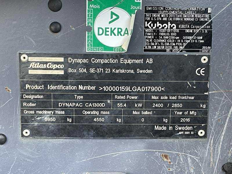 Trench roller - single drum 1350mm - CE gekeurd Merk: Dynapac Model: CA1300D Bouwjaar: 2016 Serienummer: GA17900 Merk motor: Kubota V3307 Motorvermogen (kW): 55kW Aantal cilinders: 4 Brandstof: Diesel Trommelbreedte: 1350 Werkbreedte: 1350 Afgelezen urenstand: 1424 Eigen gewicht: 4500kg Totale afmeting L: 4000mm Totale afmeting Breedte: 1400mm Totale afmeting Hoogte: 2500mm