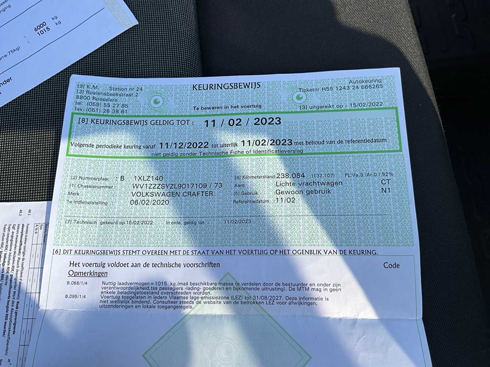 Merk: Volkswagen Model: Crafter Bouwjaar: 2020 Afgelezen kilometerstand: 259055km Cilinderinhoud: 1968cc Vermogen (kW): 130kW Brandstof: Diesel Chassisnummer: WV1ZZZSYZL9017109 Datum eerste toelating: 06/02/2020 Aantal zitplaatsen: 3 Transmissie: Automaat Emissieklasse: Euro 6d Aantal deuren: 4 Aantal sleutels: 2 Nationaliteit documenten: Belgisch Start en rijdt: Ja startinformatie : Start & rijdt Vavato voert geen technische keuring uit.: true Airconditioning: true Navigatie: true Inschrijvingsbewijs - deel 1 : Aanwezig Inschrijvingsbewijs - deel 2: Aanwezig
