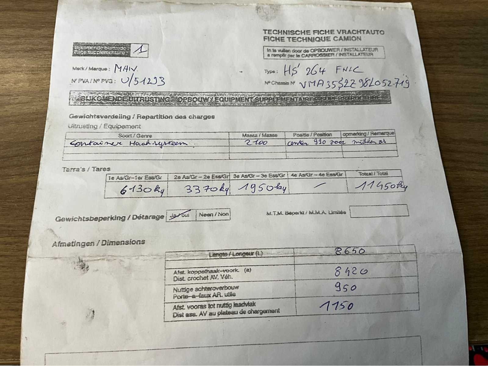 Gebruikssporen en oppervlakteroest (zie foto’s) - haaksysteem functioneel - km kan niet afgelezen worden (taxograaf defect), op basis van laatste controle vermoedelijk ca. 700000km - airco Merk: MAN Type: TGS26.360 Bouwjaar: 2008 Chassisnummer VIN: WMA35SZZ98L052719 Cilinderinhoud: 10518cc Datum eerste toelating: 11/4/2008 Aantal assen: 3 Laadvermogen: 14550kg Emissieklasse: Euro 4 Totale afmeting L: 10225mm Nationaliteit documenten: B Kentekenpapieren compleet?: true