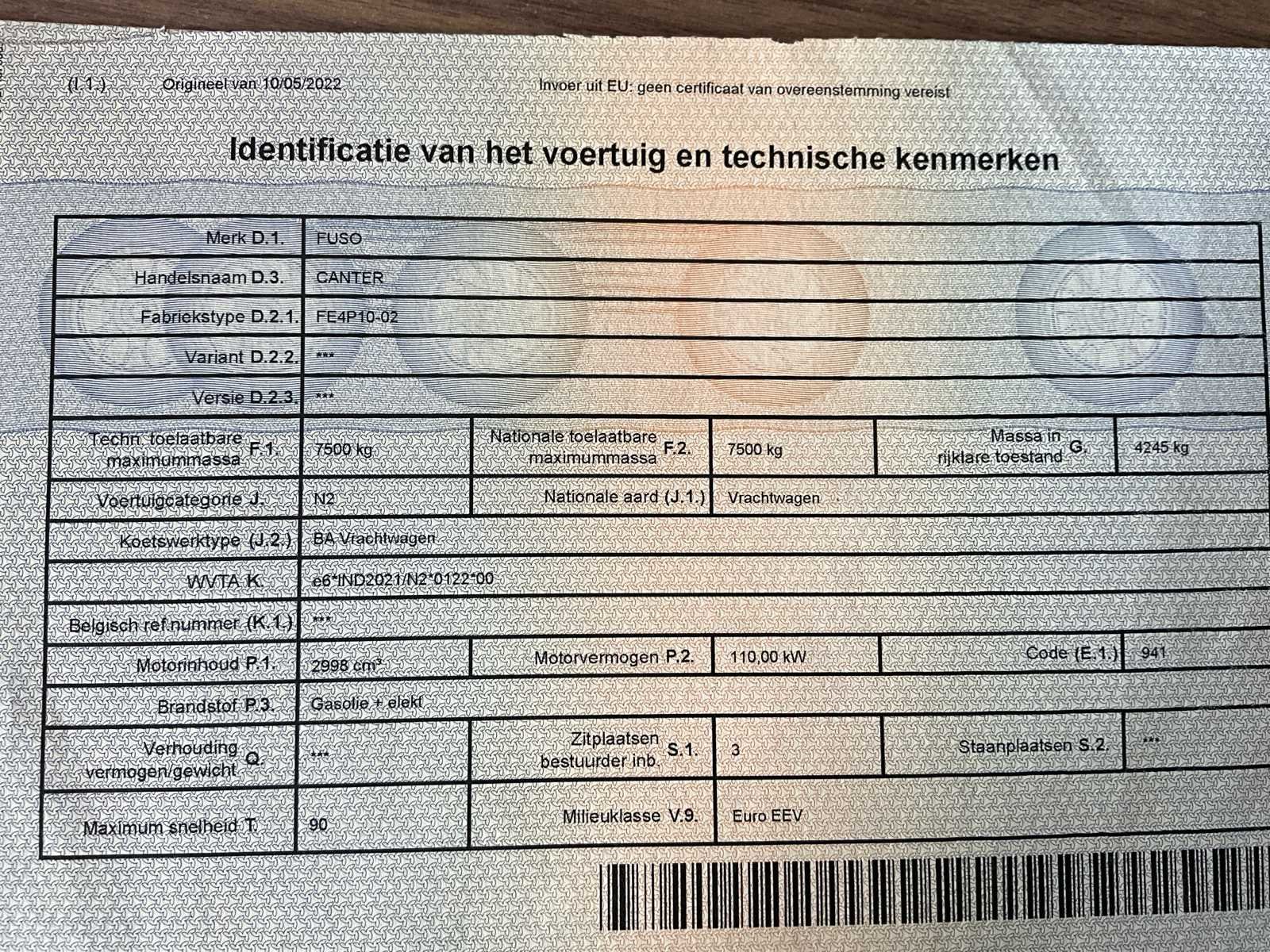 EEV (Enhanced Environmentally friendly Vehicle) - hydraulische laadklep die werkt - werkende airco - start, rijdt, remt, volledig functioneel - gebruikssporen in cabine Merk: Fuso Canter Bouwjaar: 2013 Chassisnummer VIN: TYBFEB74GLDX07140 Cilinderinhoud: 2998cc Datum eerste toelating: 26/6/2013 Aantal assen: 2 Fuel Type: Hybrid Laadvermogen: 900kg Emissieklasse: EEV Hydraulische laadklep: true Eigen gewicht: 6600kg Totale afmeting L: 7310mm Totale afmeting Breedte: 2300mm Totale afmeting Hoogte: 3100mm Afgelezen kilometerstand: 260957km Nationaliteit documenten: B Kentekenpapieren compleet?: true Aantal zitplaatsen: 3 Automaat: true