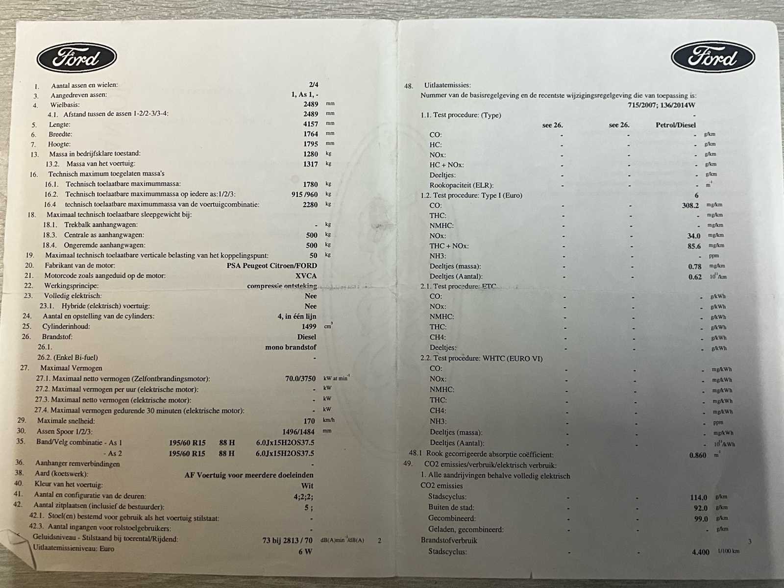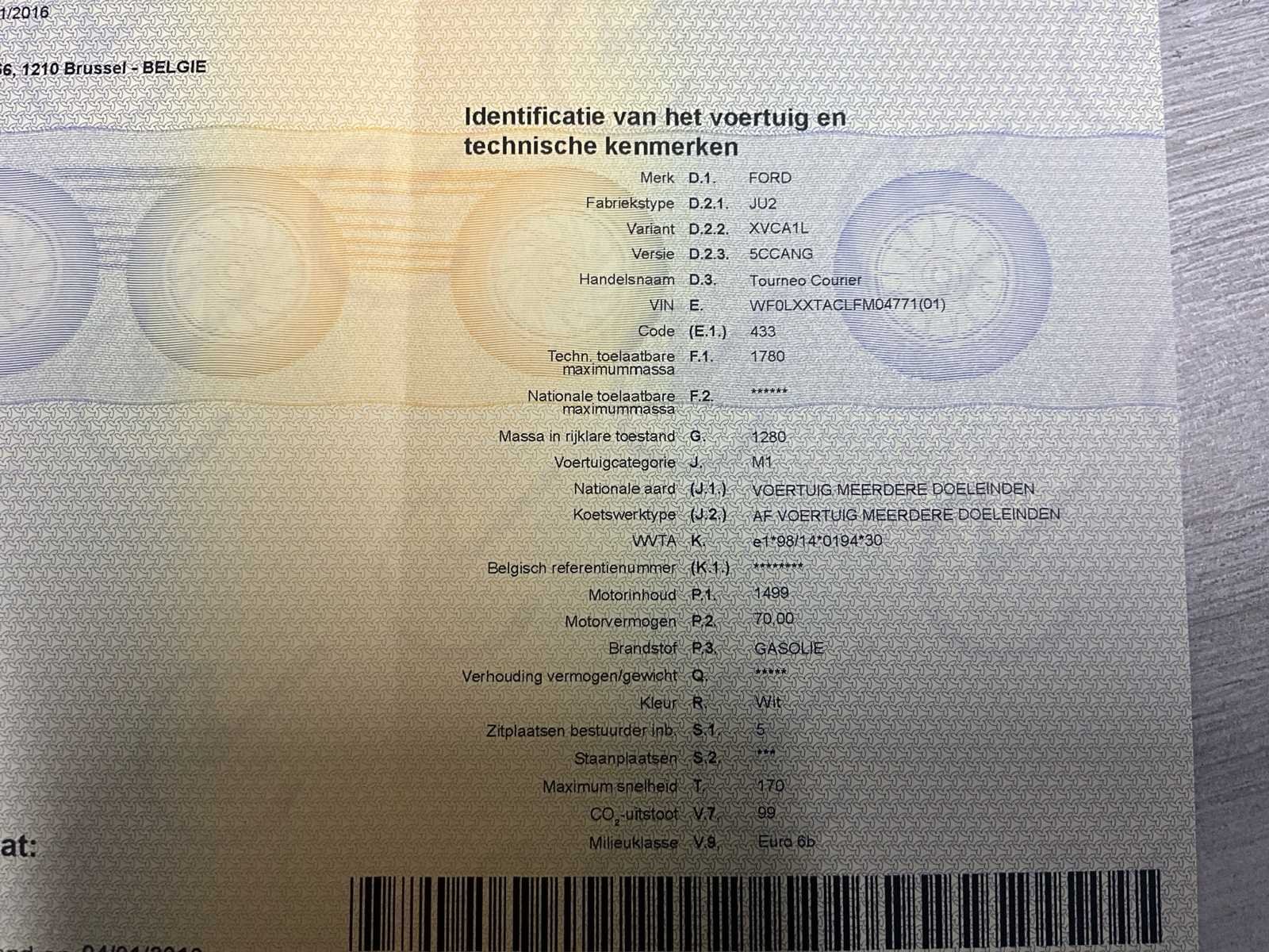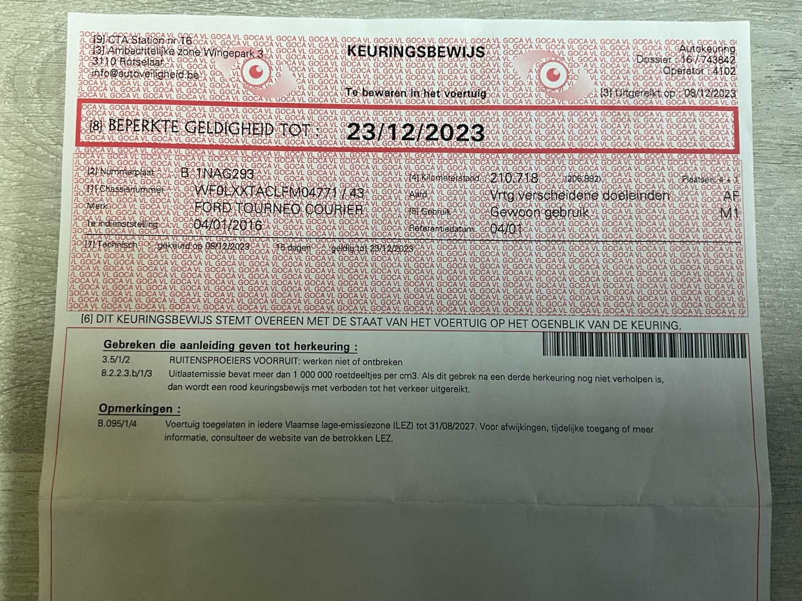 Technisch gekeurd op 210718km omwille van uitlaatemissie (roetfilter dient vervangen te worden) - wat gebruikssporen binnen en buiten (zie foto’s) maar algemeen nette staat - werkende airco Merk: Ford Model: Tourneo Courier Bouwjaar: 2016 Afgelezen kilometerstand: 210839km Cilinderinhoud: 1499cc Vermogen (kW): 70kW Brandstof: diesel Chassisnummer: WF0LXXTACLFM04771 Datum eerste toelating: 4/1/2016 Aantal zitplaatsen: 5 Kleur: wit Transmissie: manueel Emissieklasse: Euro 6b Aantal deuren: 5 Ledig gewicht: 1280kg Nationaliteit documenten: B Gelijkvormigheidsattest aanwezig: true Start en rijdt: ja Keuringsrapport geldig tot: 23/12/2023 Vavato voert geen technische keuring uit.: true Airconditioning: true Inschrijvingsbewijs - deel 1 : aanwezig Inschrijvingsbewijs - deel 2: aanwezig