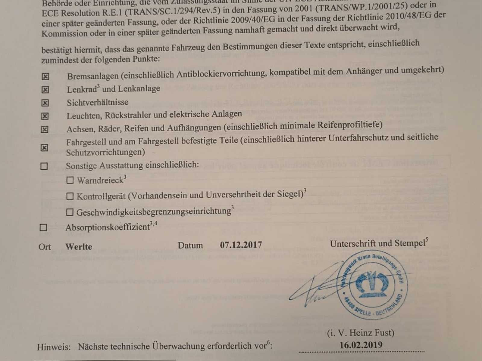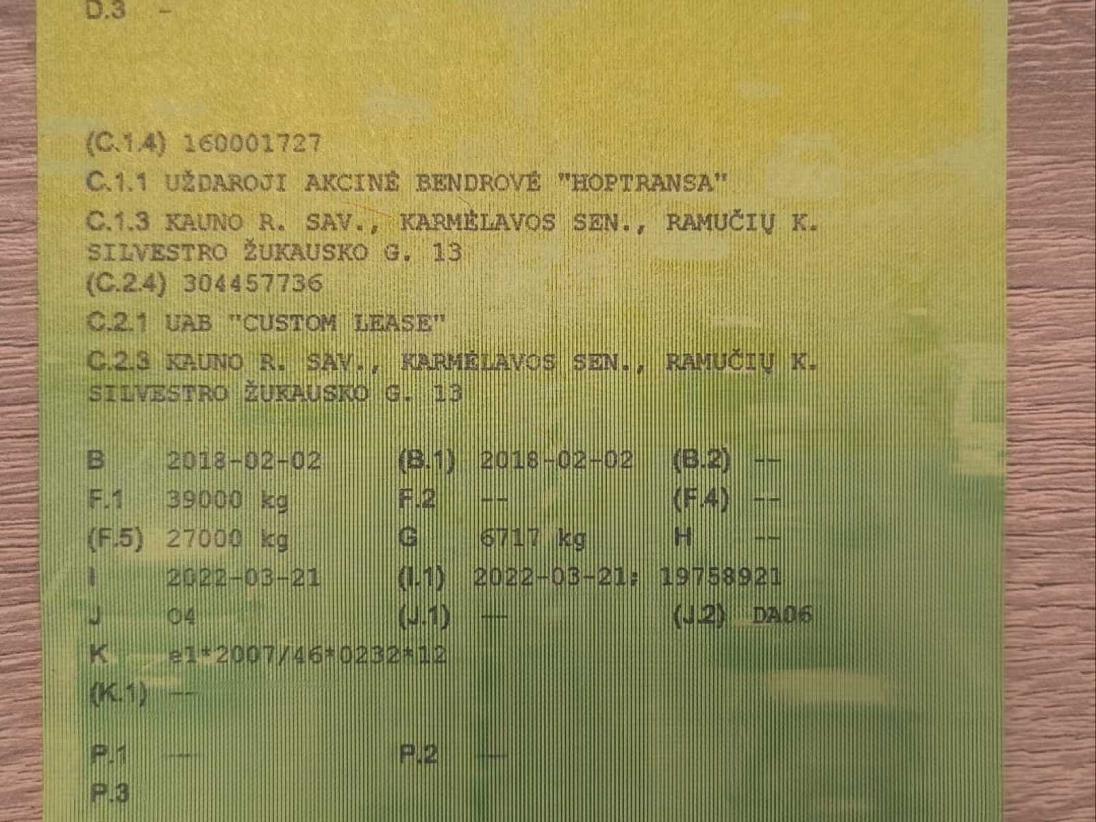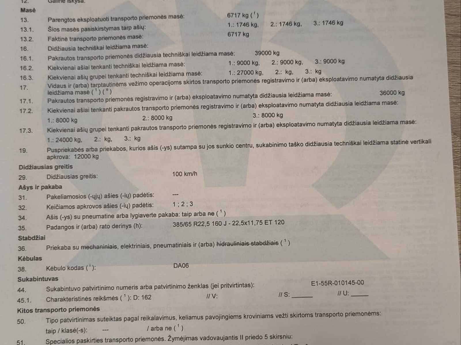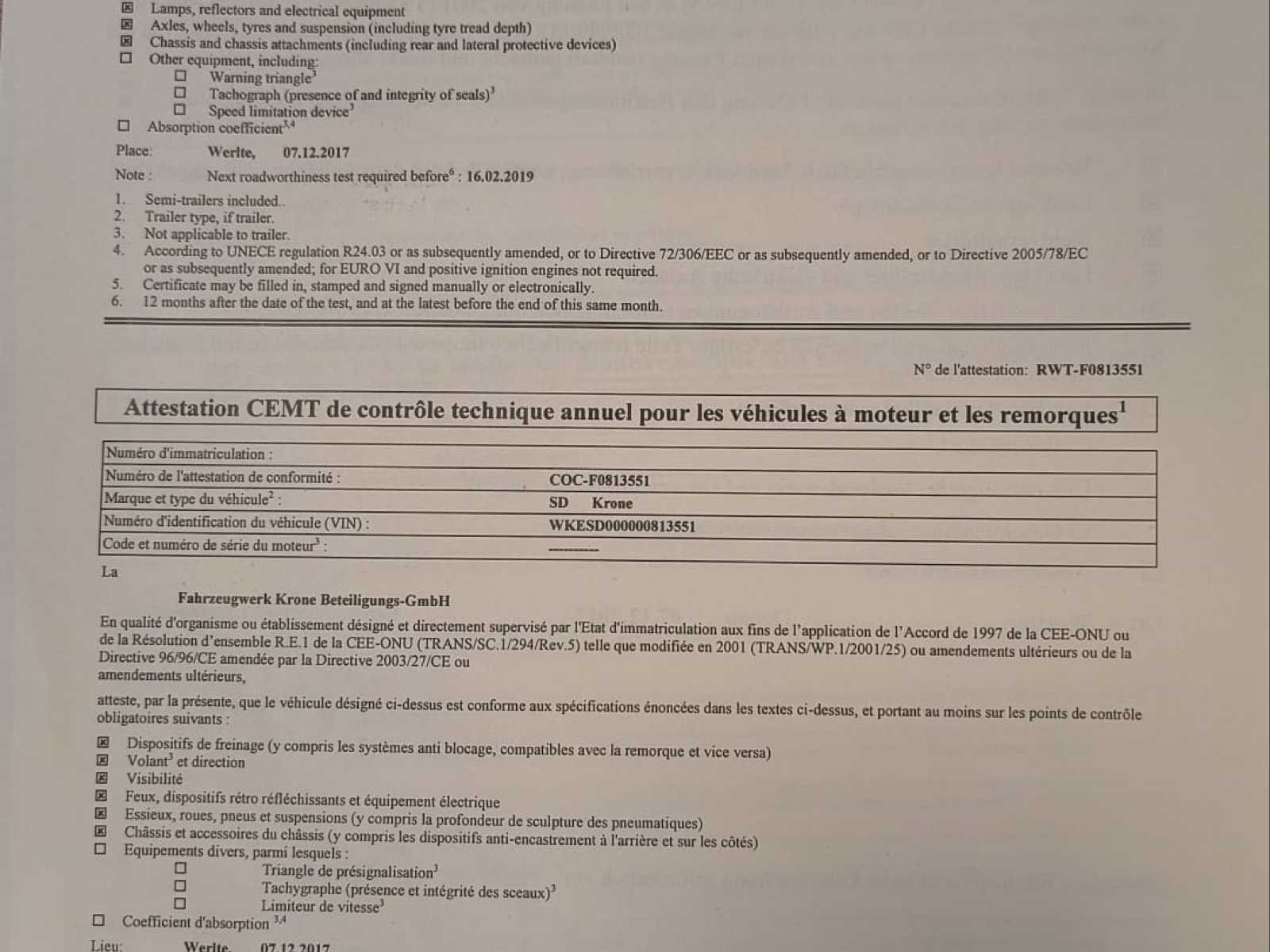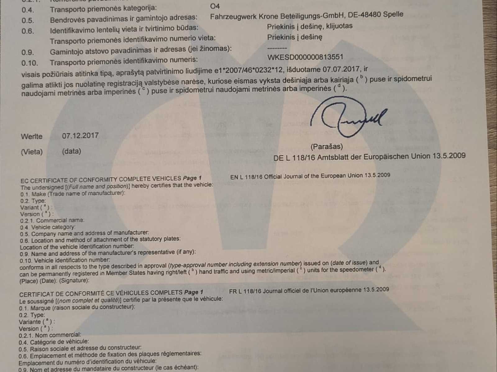 Krone SD schuifzeiloplegger uit 2018 in nette, direct inzetbare staat. Voorzien van 3 assen met luchtvering, schuifzeilen, schuifdak en dubbele achterdeuren. Europese documenten (Estland) aanwezig inclusief typegoedkeuring en ECMT certificaat. Voertuig dient door koper ingevoerd te worden in land van bestemming. Maximaal toegestaan totaalgewicht 39.000 kg. Ideaal voor internationaal transport. Normale gebruikssporen passend bij leeftijd en inzet - specificaties: Schuifzeil links en rechts, Schuifdak, Aluminium zijborden, Houten vloer geschikt voor palletvervoer, Achterdeuren (dubbele deuren), ABS / EBS remsysteem, Trommelremmen, Liftas, Reservewielhouder, Achterbumper conform EU-norm, Snelheidsstickers 60/70/80 km/u, ECMT certificaat aanwezig, Europees typegoedkeuringsdocument aanwezig, geschikt voor 33 europallets Merk: Krone Type: SD Type aanhangwagencarrosserie: Gesloten aanhangwagen Bouwjaar: 2018 Chassisnummer VIN: WKESD000000813551 Datum eerste toelating: 2/2/2018 Aantal assen: 3 Laadvermogen: 32283kg Eigen gewicht: 6717kg Totale afmeting L: 13860mm Totale afmeting Breedte: 2550mm