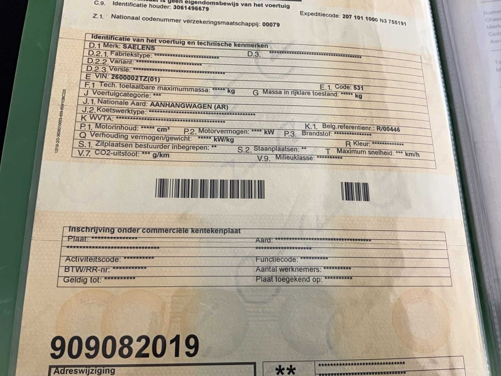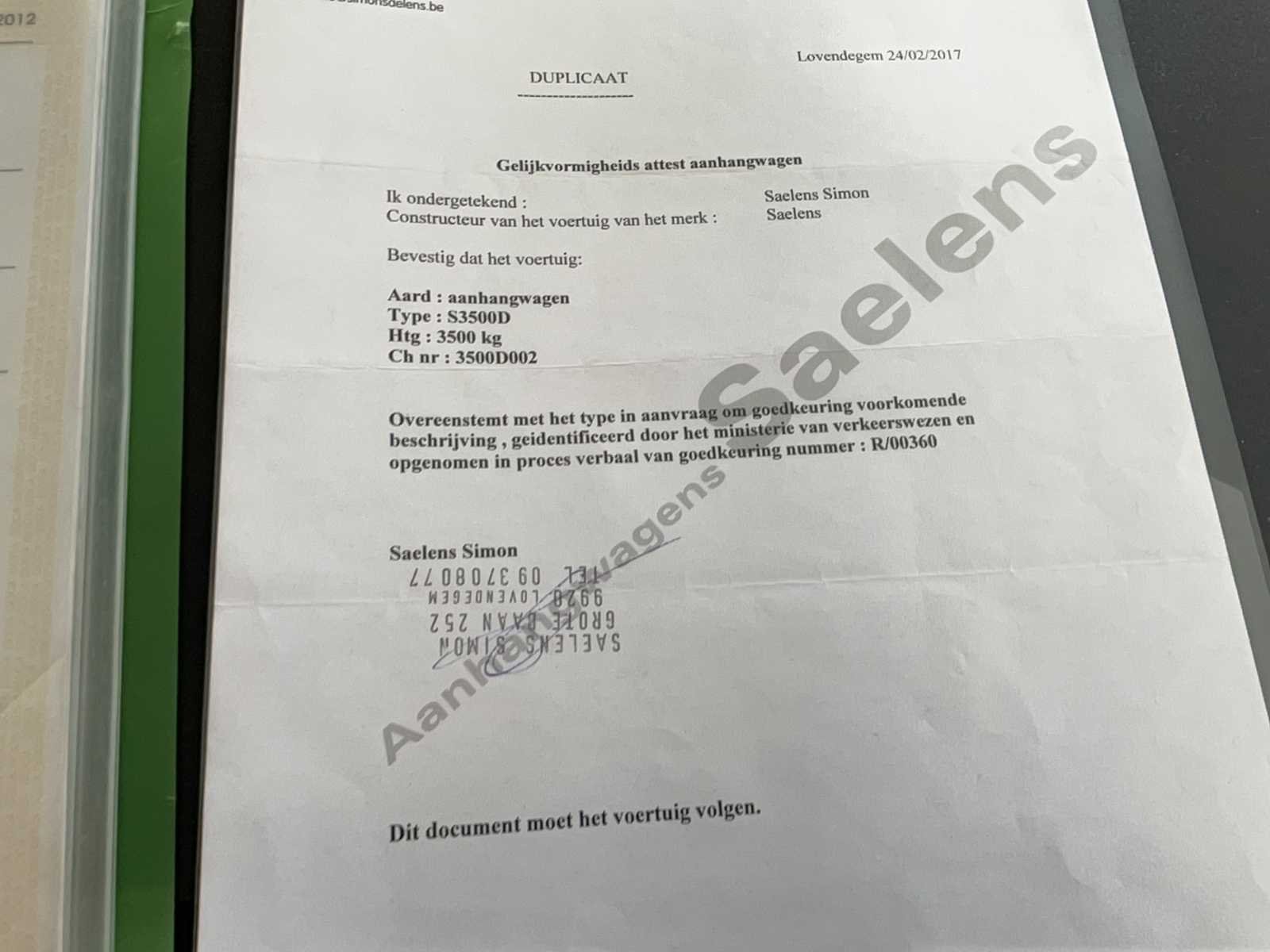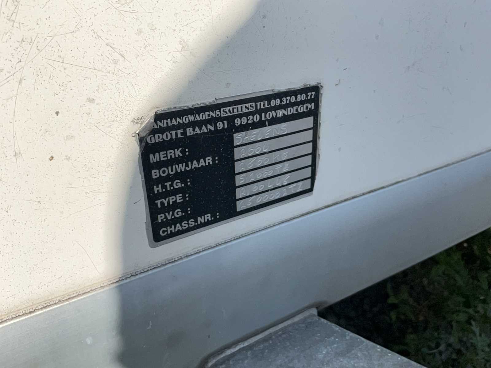 Algemene gegevens: • Merk: Saelens • Type: S3500D • Bouwjaar: 2004 • Chassisnummer: 2600002TZ / 53 • PVG-nummer: R00446 • Typegoedkeuringsnummer: R/00360 Technische specificaties: • Aantal assen: 2 • Ophanging: Mechanisch • Tarra (massa rijklaar): 1.660 kg • Maximaal Toegelaten Massa (MTM): 2.600 kg • Op het gelijkvormigheidsattest: 3.500 kg HTG • Koppeling: KNOTT K17-A (4-bolskoppeling) • Toegestane kogeldruk: 150 kg • Toegestane aslast: 2 × 1.600 kg • Remsysteem: Ongeremd in MTM 0, geremd bij hogere MTM • Kleur: Niet gespecificeerd in de documenten Inschrijvingsgegevens: • Datum eerste ingebruikneming: 02/04/2004 • Laatste inschrijving in DIV: 09/08/2011 Merk: Saelens Type: S3500D Bouwjaar: 2004 Chassisnummer: 2600002TZ Aantal assen: 2 Gesloten opbouw: true Nationaliteit documenten: Belg