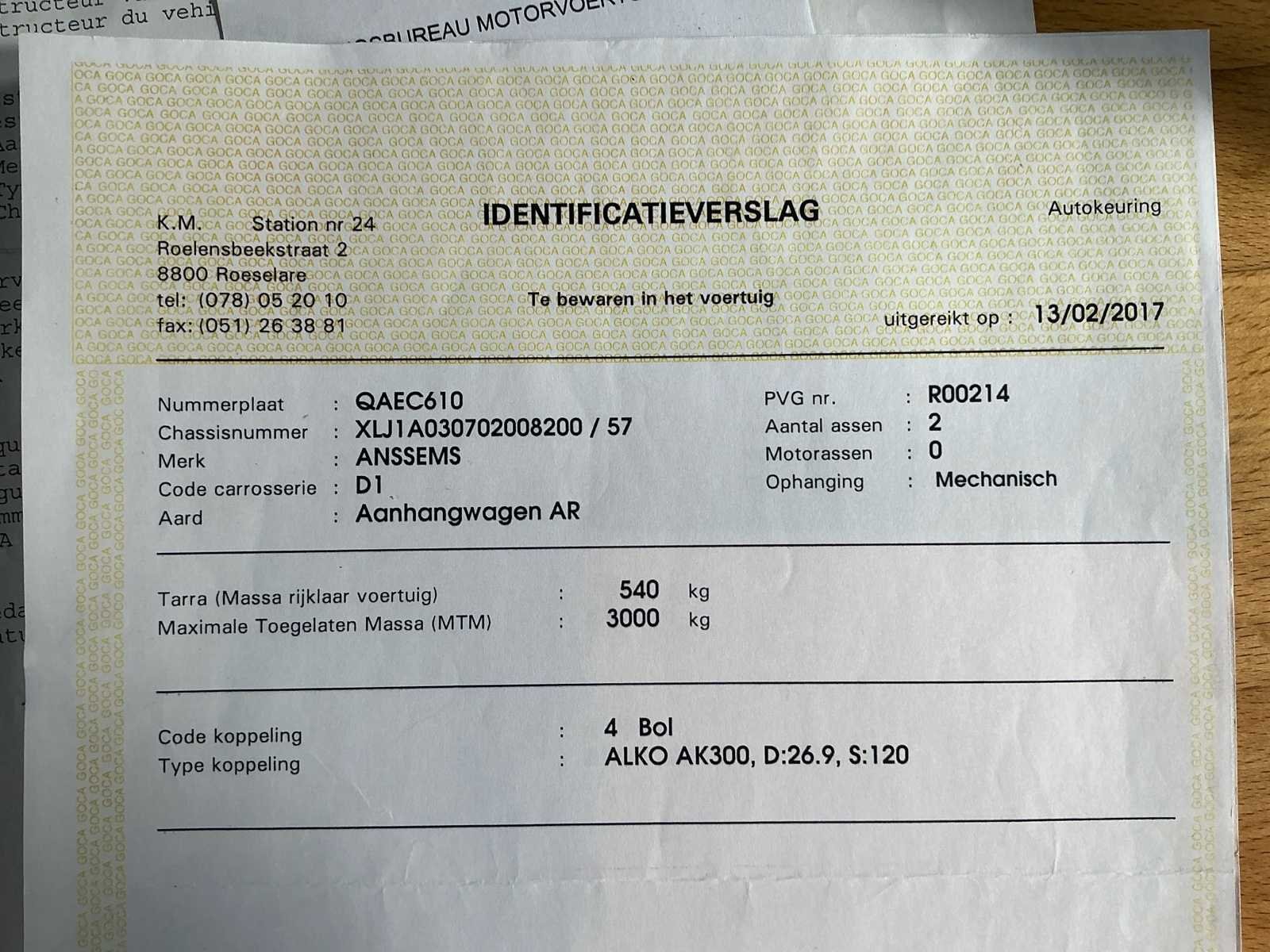 Hoogte laadbak: 30cm Merk: Anssems Type: PSX2-3000 Bouwjaar: 2003 Aantal assen: 2 Laadbak afmeting l: 330cm Laadbak afmeting b: 175cm Ledig gewicht: 540kg Laadvermogen: 2460kg Datum eerste toelating: 22/01/2003 Kentekenpapieren compleet?: true Lengte: 470cm Breedte: 175cm Nationaliteit documenten: BE