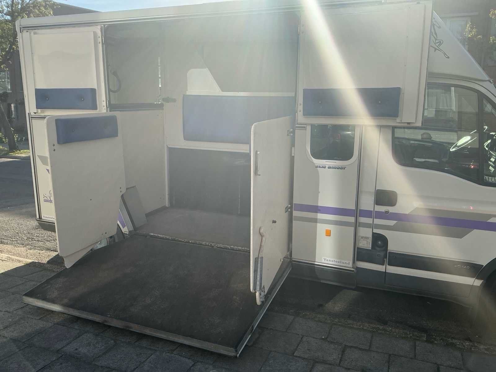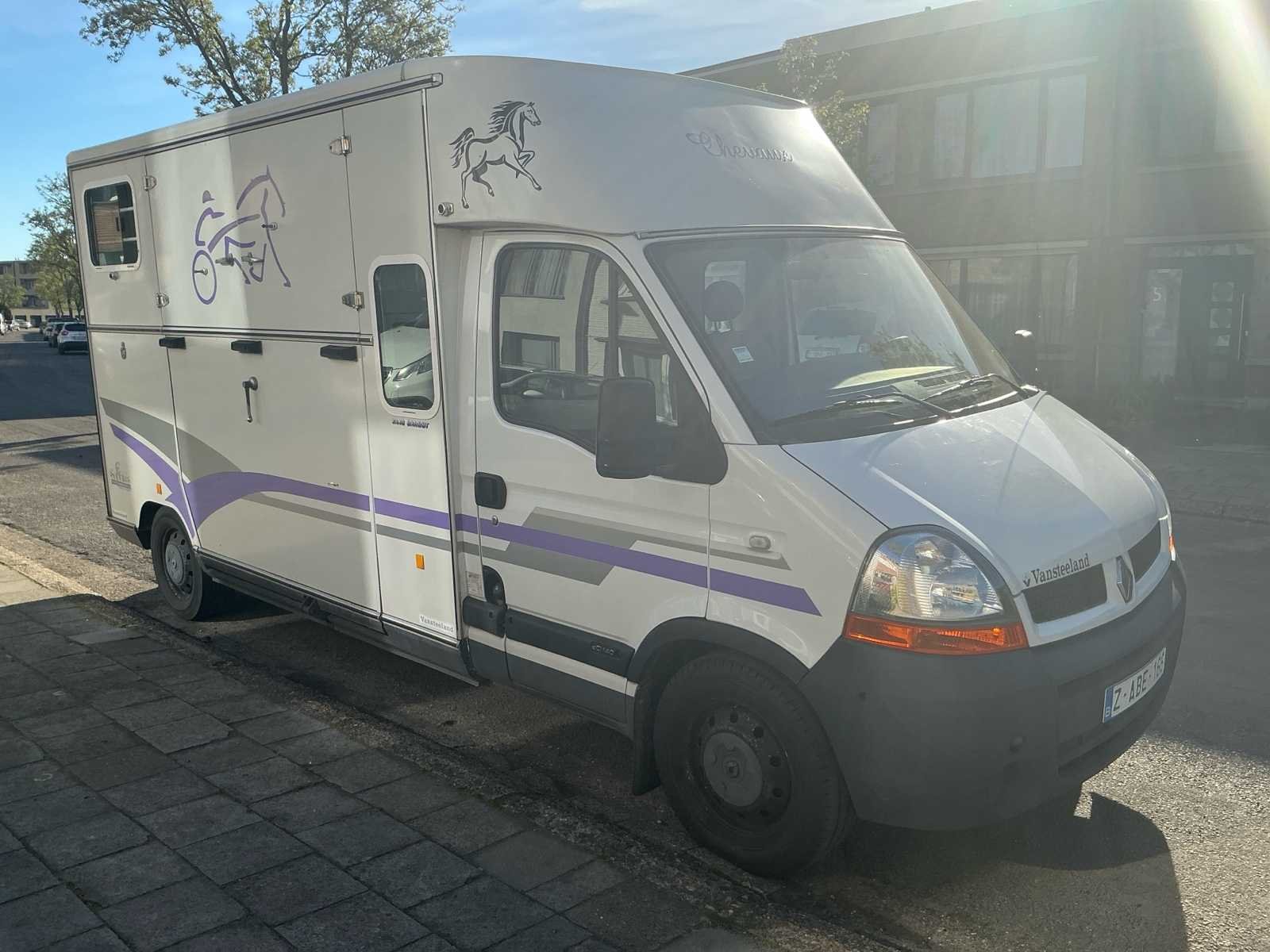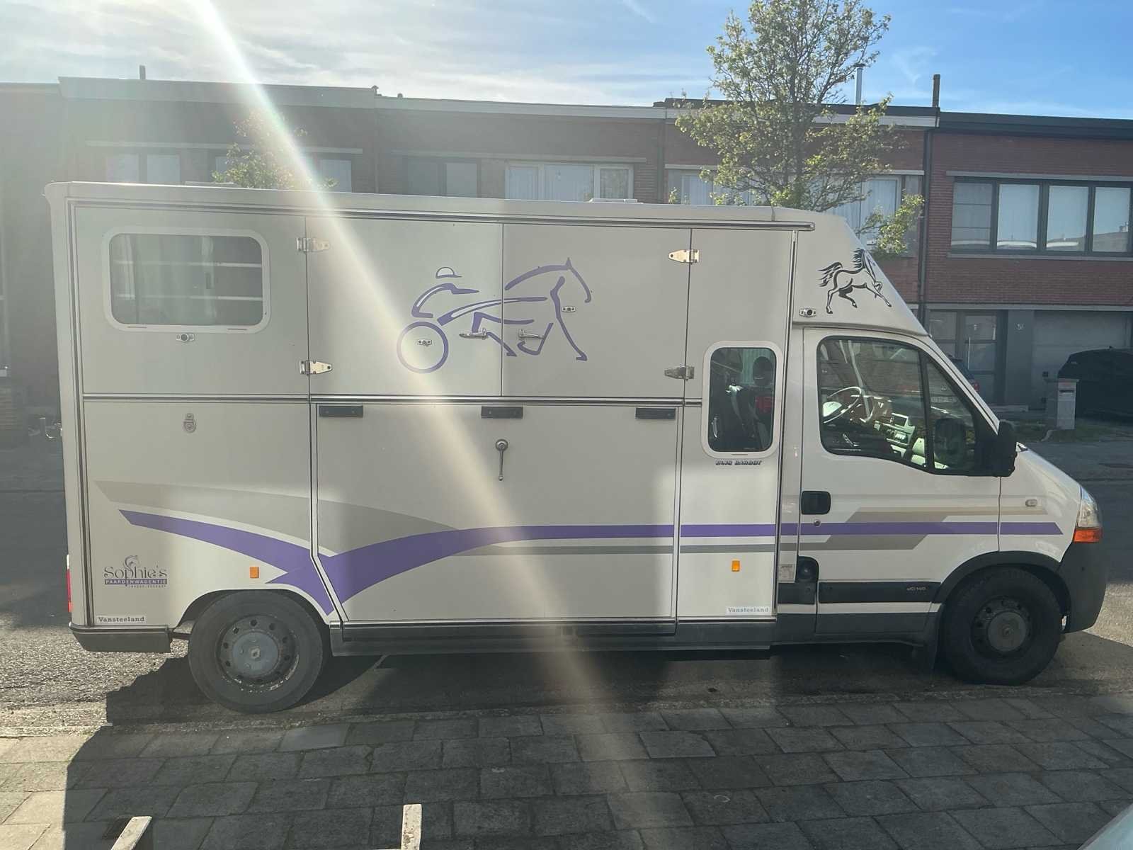 Mooie Renault Master paardenwagen te koop van de stevige en betrouwbare Franse opbouwer Barbot! Deze stevige en betrouwbare wagen is een Renault Master van 2004 met een 122××× kilometers op de teller. Cabine: - Beschikt over 5 zitplaatsen (dubbele cabine) - Nieuwe radio geiinstaleerd. - Electrische ruiten - Raampje naar het paardengedeelte. - Slaapruimte boven de cabine. - Reservewiel onder bank achteraan. Paardengedeelte: - Borstbalkuitvoering. - Grote scheidingswand zodat de paarden met hun hoofd niet aan elkaar kunnen (kan eraf gehaald worden) - 2 hekjes aan de zijkant makkelijk om alleen te kunnen laden (kan eraf gehaald worden) - Doorgang via de deurtjes van zadelkamer naar paardengedeelte. - 2 ventilatie luiken en 2 ramen aan de zijkant. - Laadvermogen 625 kg. - 2 opbergruimten in de zadelkamer. - Sulkyhaken (kan eraf gehaald worden) Super leuke stevige wagen die klaar is om op pad te gaan en leuke avonturen te beleven! De wagen is gekeurd voor verkoop en heeft een volledig onderhoud en nazicht bij de garage gekregen. Alsook voorraan 2 nieuwe banden gekregen en is er een nieuwe radio geiinstalleerd. Merk: Renautl Model: Master Bouwjaar: 2004 Afgelezen kilometerstand: 122403km Cilinderinhoud: 2953cc Vermogen (kW): 100kW Brandstof: Diesel Chassisnummer: VF1EDCSK631646732 Laadvermogen: 1262kg Datum eerste toelating: 01/06/2004 Vermogen (pk): 136hp Energielabel: Euro 3 Aandrijving: FWD Aantal zitplaatsen: 6 Kleur: Wit/paars Transmissie: Manueel Drive type: Front wheel USA titel: Neen Stuurwiel: Links Emissieklasse: Euro 3 Aantal deuren: 4 Aantal sleutels: 2 Ledig gewicht: 1738kg Carrosserie: Paardenvervoer Nationaliteit documenten: Belgische Gelijkvormigheidsattest aanwezig: true Carpass: true Start en rijdt: Ja Technische fiche: true Andere boorddocumenten: Neen startinformatie : Start en rijdt Zichtbare schade: Zie foto’s Self drive export possible : true Airconditioning: true Inschrijvingsbewijs - deel 1 : Aanwezig Inschrijvingsbewijs - deel 2: Aanwezig