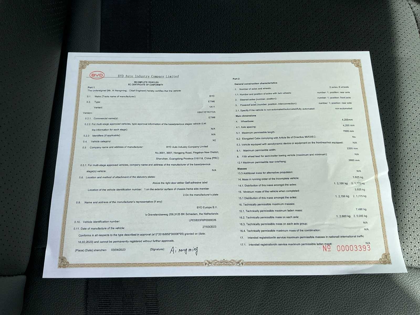 Wagen is nog nooit ingeschreven geweest en verkeert in nieuwstaat Merk: BYD Type: ETM6 Bouwjaar: 2023 Chassisnummer VIN: LPE5B33F6P0000026 Kilometerstand bij opname: 100km Type transmissie: Automatisch Aantal assen: 2 Fuel Type: Elektrisch Laadvermogen: 7400kg Aantal sleutels: 2 Elektrisch: true Navigatie: true LED-koplampen: true Eigen gewicht: 3925kg Totale afmeting L: 7995mm Totale afmeting Breedte: 2200mm Totale afmeting Hoogte: 2660mm Startinformatie: Start en rijdt Afgelezen kilometerstand: 100km Aantal zitplaatsen: 3 Zelf rijdend exporteren: Mogelijk Automaat: true