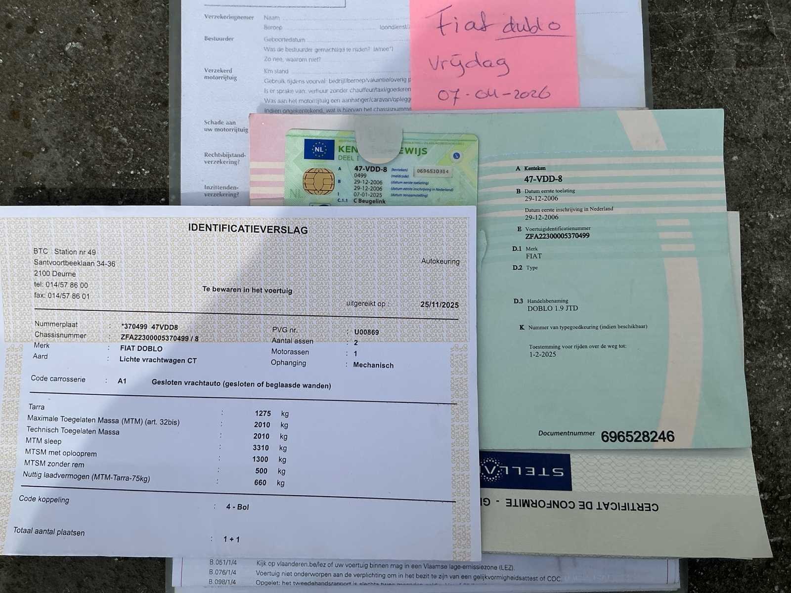 Merk: Fiat Type: Doblo Model: 1.9 JTD Bouwjaar: 2006 Chassisnummer: ZFA22300005370499 Afgelezen kilometerstand: 184261km Cilinderinhoud: 1910cc Vermogen (kW): 77kW Brandstof: Diesel Datum eerste inschrijving: 29-12-2006 Datum eerste toelating: 29-12-2006 Aandrijving: FWD Transmissie: Manueel Aantal zitplaatsen: 2 Kleur: Wit Nationaliteit documenten: NEDERLAND Stuurwiel: Links Aantal deuren: 4 Aantal sleutels: 2 Laadvermogen: 630kg Vermogen (pk): 105 Aantal cilinders: 4 Carrosserie: Bestelwagen Kentekenpapieren compleet?: true Boorddocumenten aanwezig?: true Startinformatie: Start en rijdt Self drive export possible : true