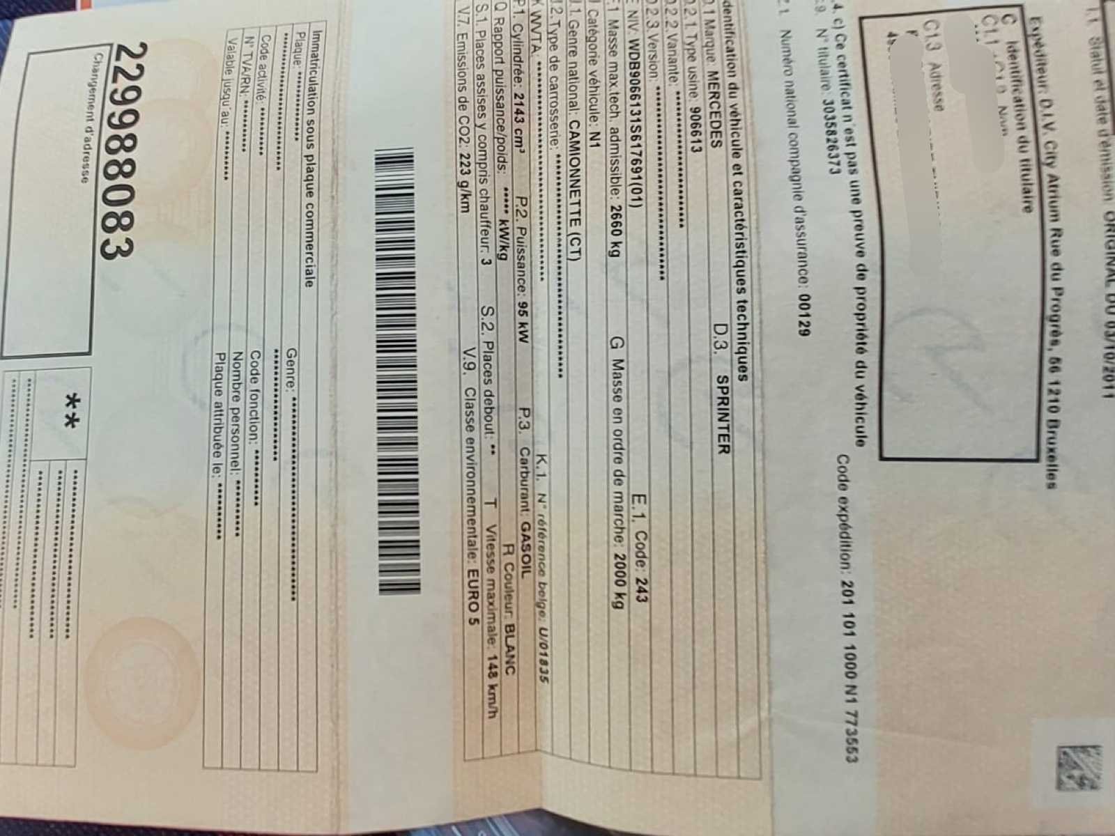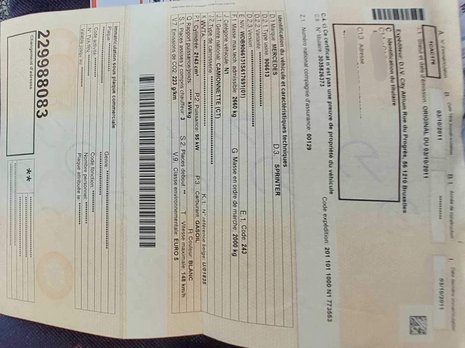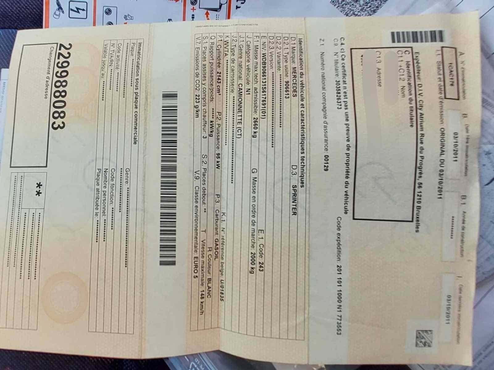 Merk: Mercedes Sprinter Type: camionnette Bouwjaar: 2011 Chassisnummer VIN: WDB9066131S617691 Cilinderinhoud: 2143cc Kilometerstand bij opname: 225350km Laadvermogen: 2660kg Aantal sleutels: 1 Eigen gewicht: 2660kg Afgelezen kilometerstand: 225350km Nationaliteit documenten: België Aantal zitplaatsen: 3