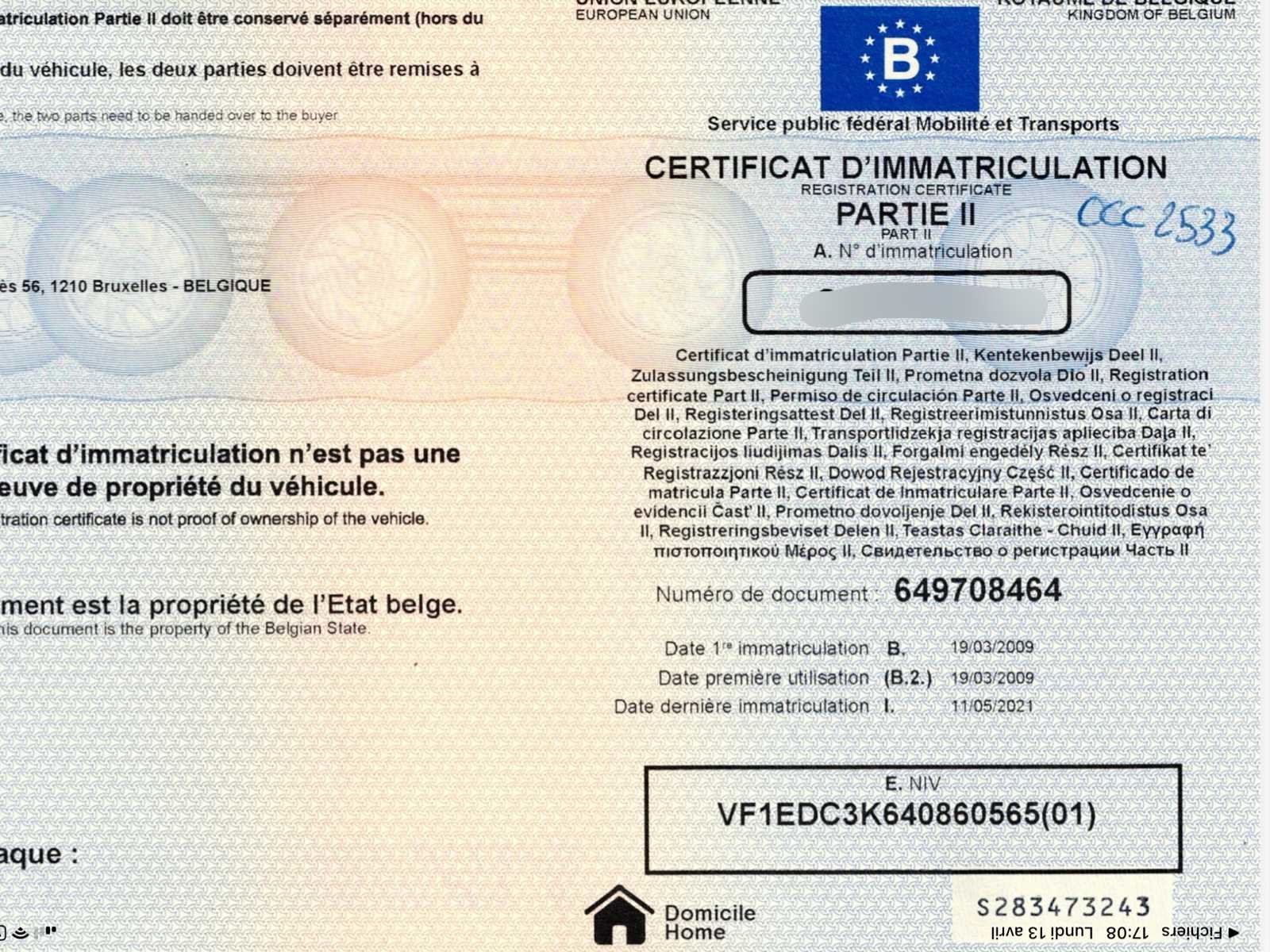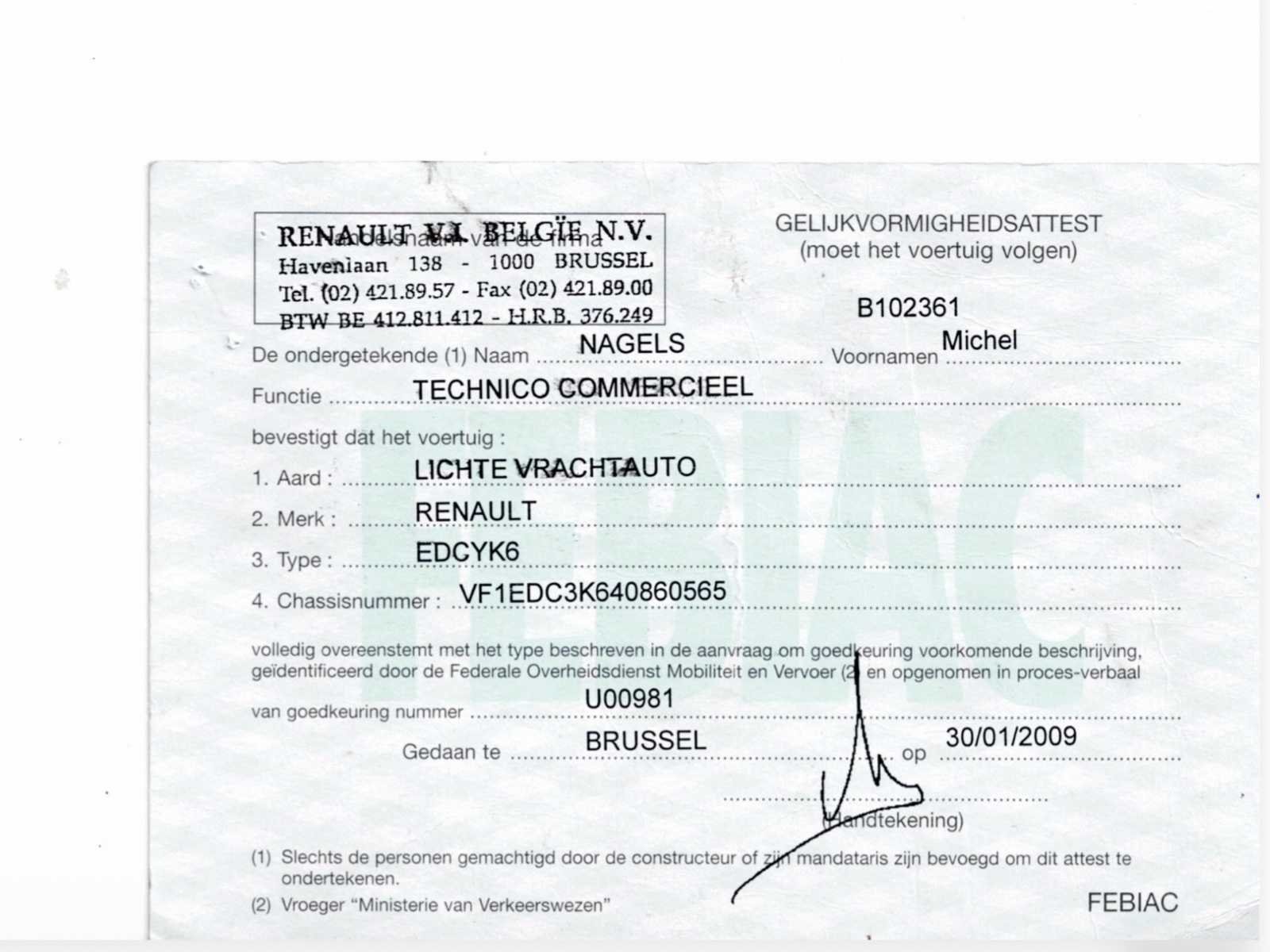 Merk: Renault Type: EDCYK6 Bouwjaar: 2009 Chassisnummer VIN: VF1EDC3K640860565(01) Kilometerstand bij opname: 191940km Afgelezen kilometerstand: 191940km