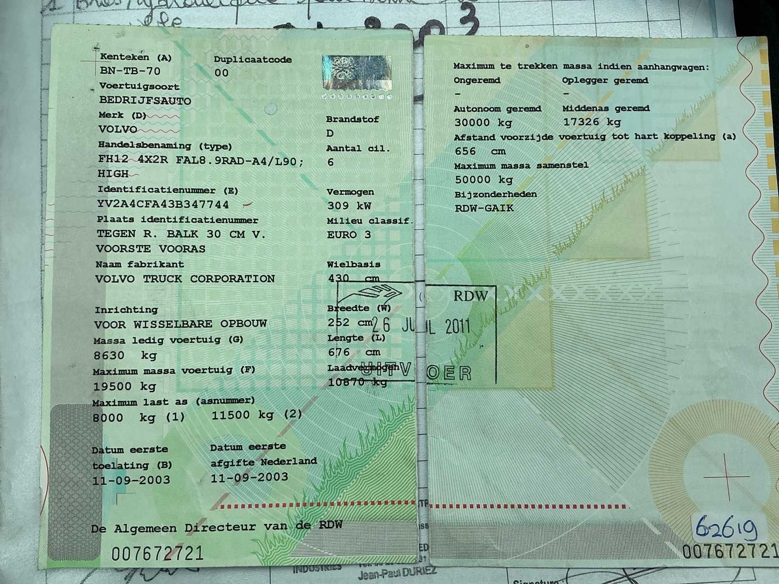 <Br> - Boorddocumenten: Voertuig met Nederlands kentekenbewijs, reeds uitgevoerd. Inschrijving ten laste van de koper. - Inclusief container afmeting circa 460x230xH85cm. Merk: Volvo Type: FH12 Chassisnummer VIN: YV2A4CFA43B347744 Kilometerstand bij opname: 979026km Datum eerste toelating: 11/09/2003 Type transmissie: Automatisch Fuel Type: Diesel Automaat: true