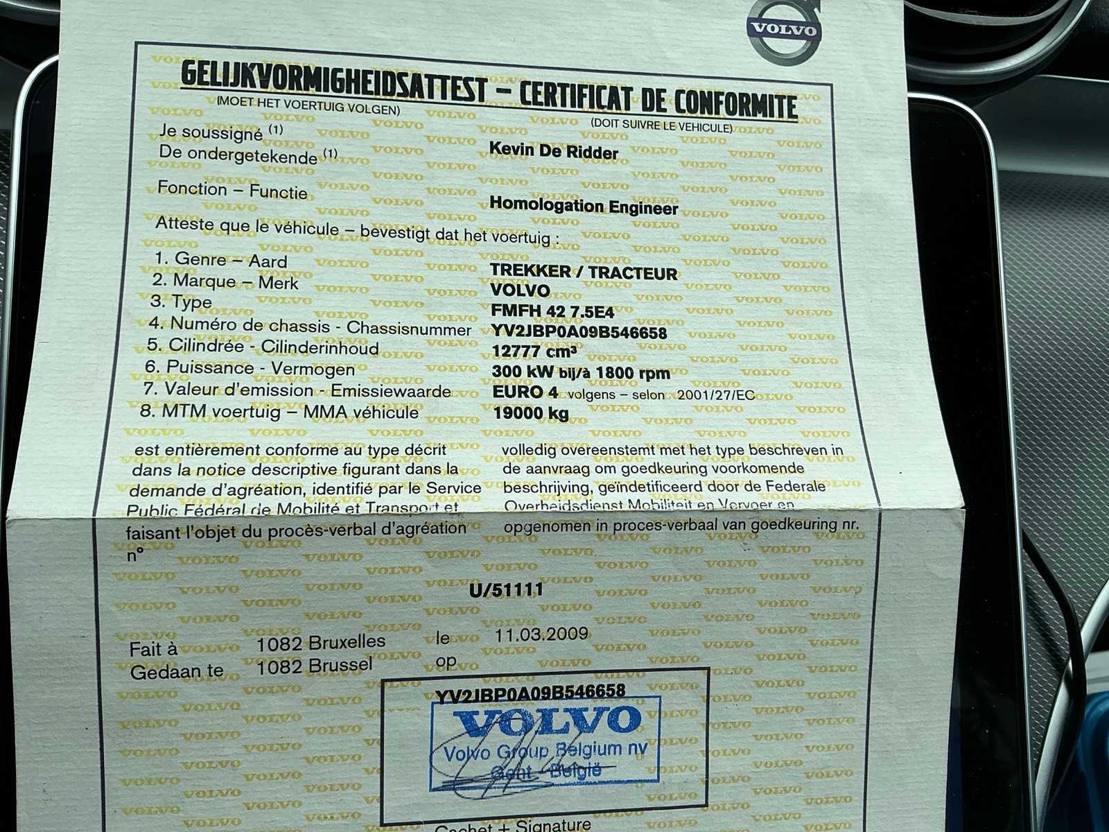 <Br> - Trekker. - Inschrijvingsbewijs: deel1 en deel2 aanwezig. - Gelijkvormigheidsattest: aanwezig. - Alternator te herstellen. Merk: Volvo Type: FMFH 42 7,5E4 Chassisnummer VIN: YV2JBP0A09B546658 Cilinderinhoud: 12777cc Kilometerstand bij opname: 464104km Datum eerste toelating: 26/03/2009 Type transmissie: Automatisch Fuel Type: Diesel