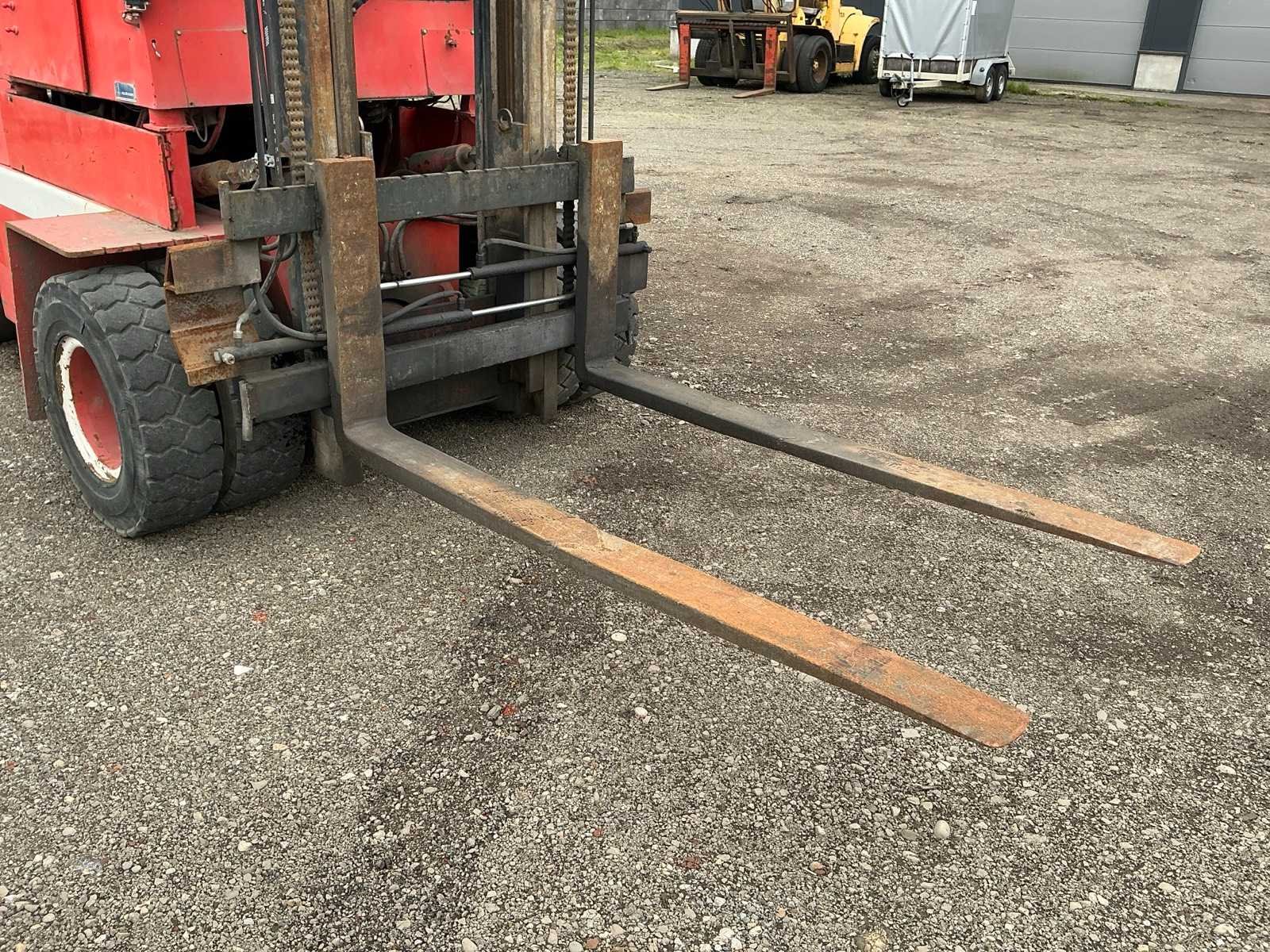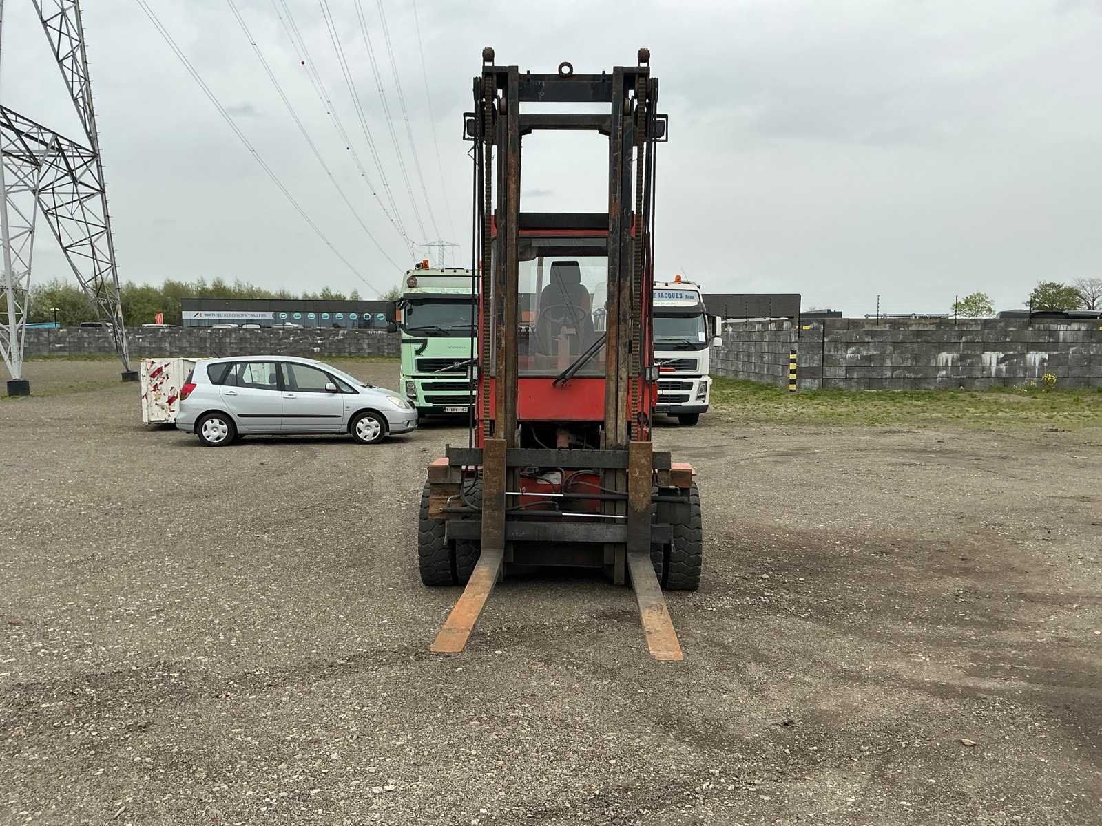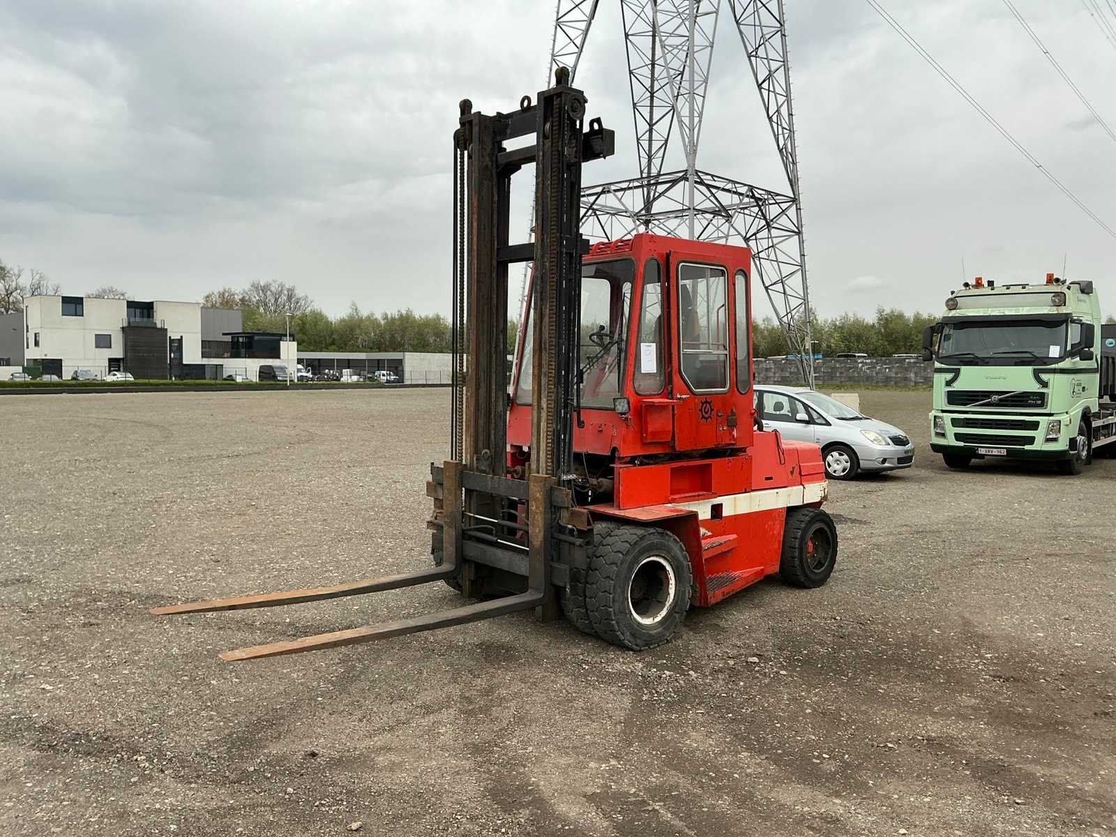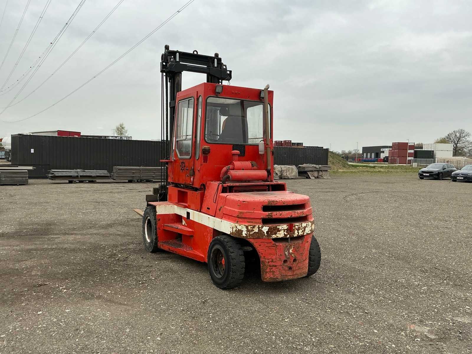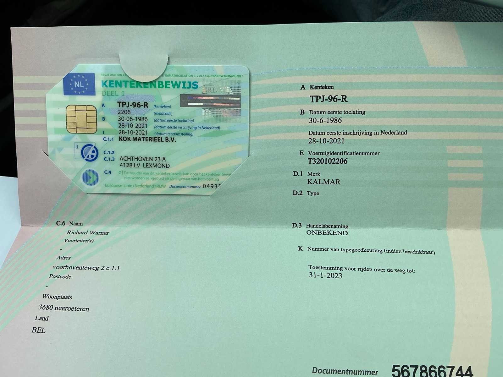 - Datum eerste inschrijving: 30/06/1986. - Voertuigidentificatienummer: T320102206. - Boorddocumenten: Voertuig met Nederlands kentekenbewijs, reeds uitgevoerd. Merk: Kalmar Brandstof: Diesel Afgelezen urenstand: 20572 Hydraulisch verstelbare lepels: true Duplex mast: true Eigen gewicht: 7900kg Hefvermogen: 5500kg Lepellengte: 2010mm