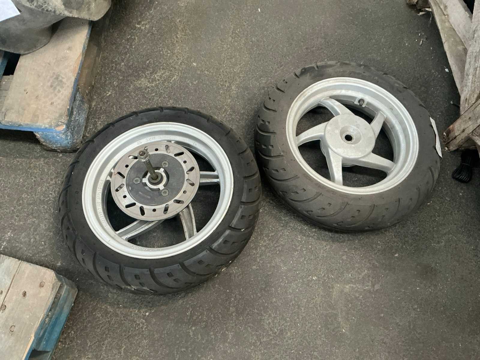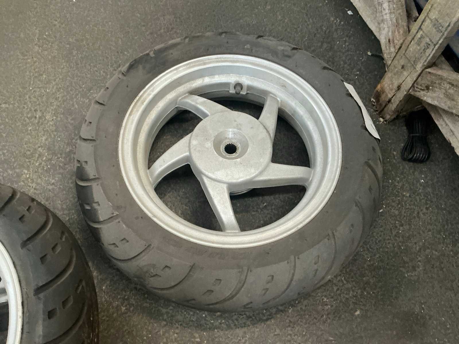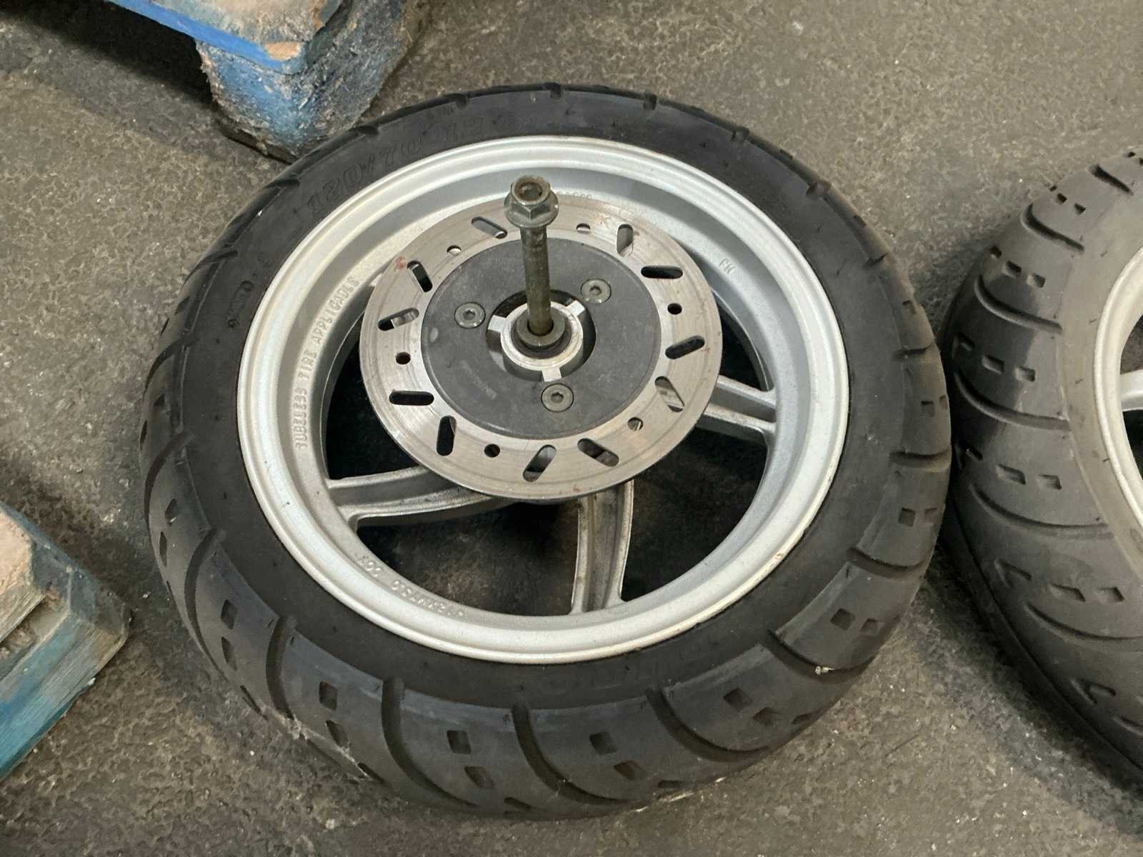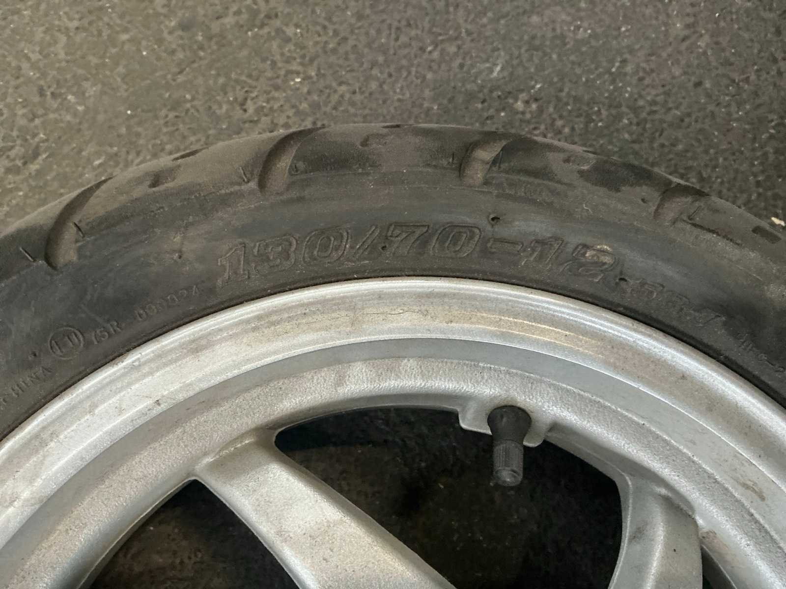 Voorband 130/70, achterband 120/70 met remschijf Merk: Duro Model: 120-130/70-12