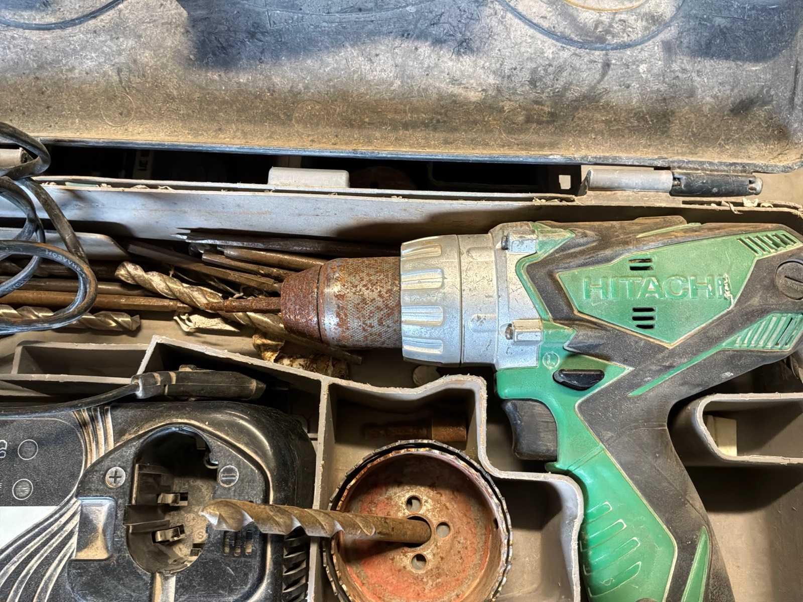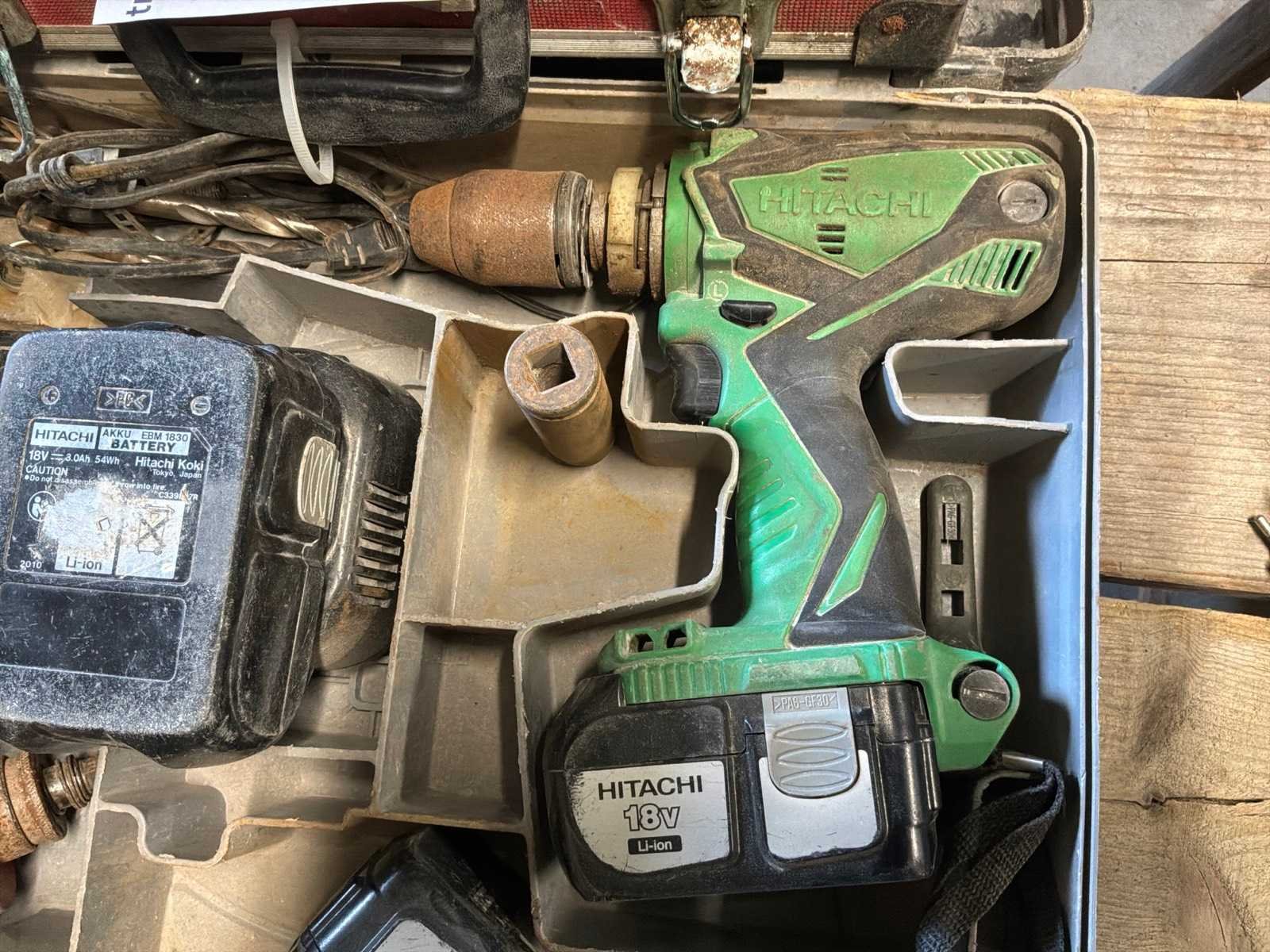 Waaronder 1x Bosch Ixo schroefmachine met lader in koffer, 2x Hitachi DS18DL2 schroefboormachine met 2x acculader en 5x accu in koffer, 1x Hitachi DB 3DL2 schroefmachine met acculader en 2x accu met koffer, 1x Bosch PSR 1800 LI-2 schroefmachine met acculader en 2x accu in Metabo-koffer