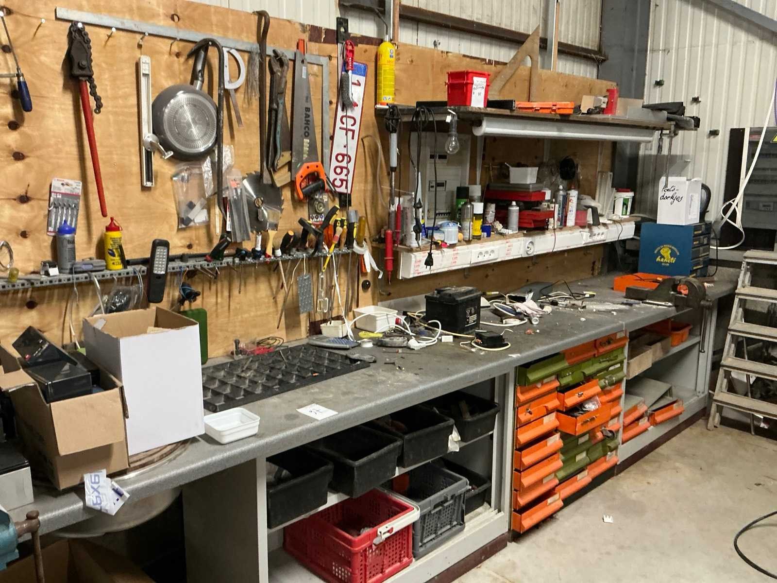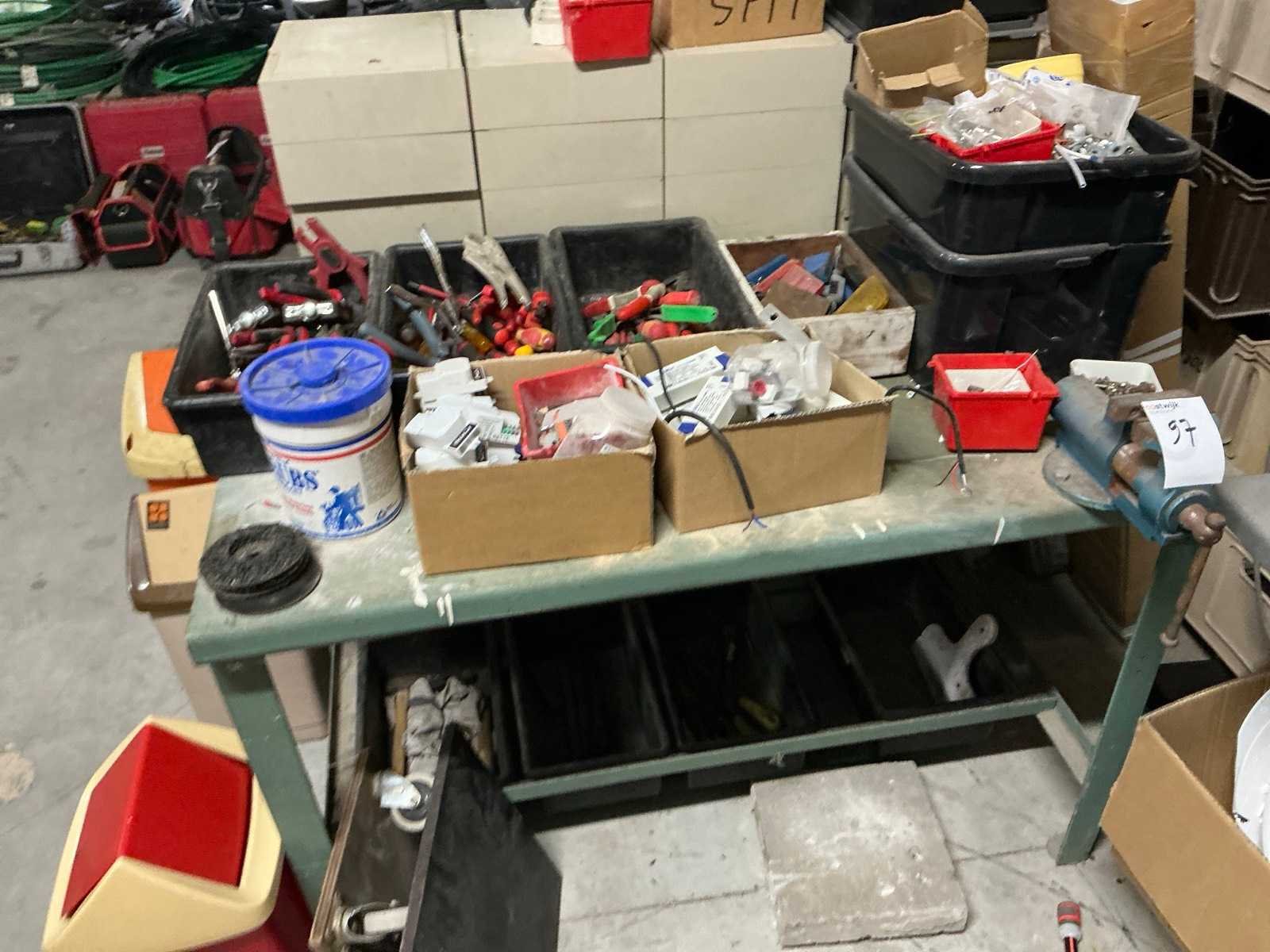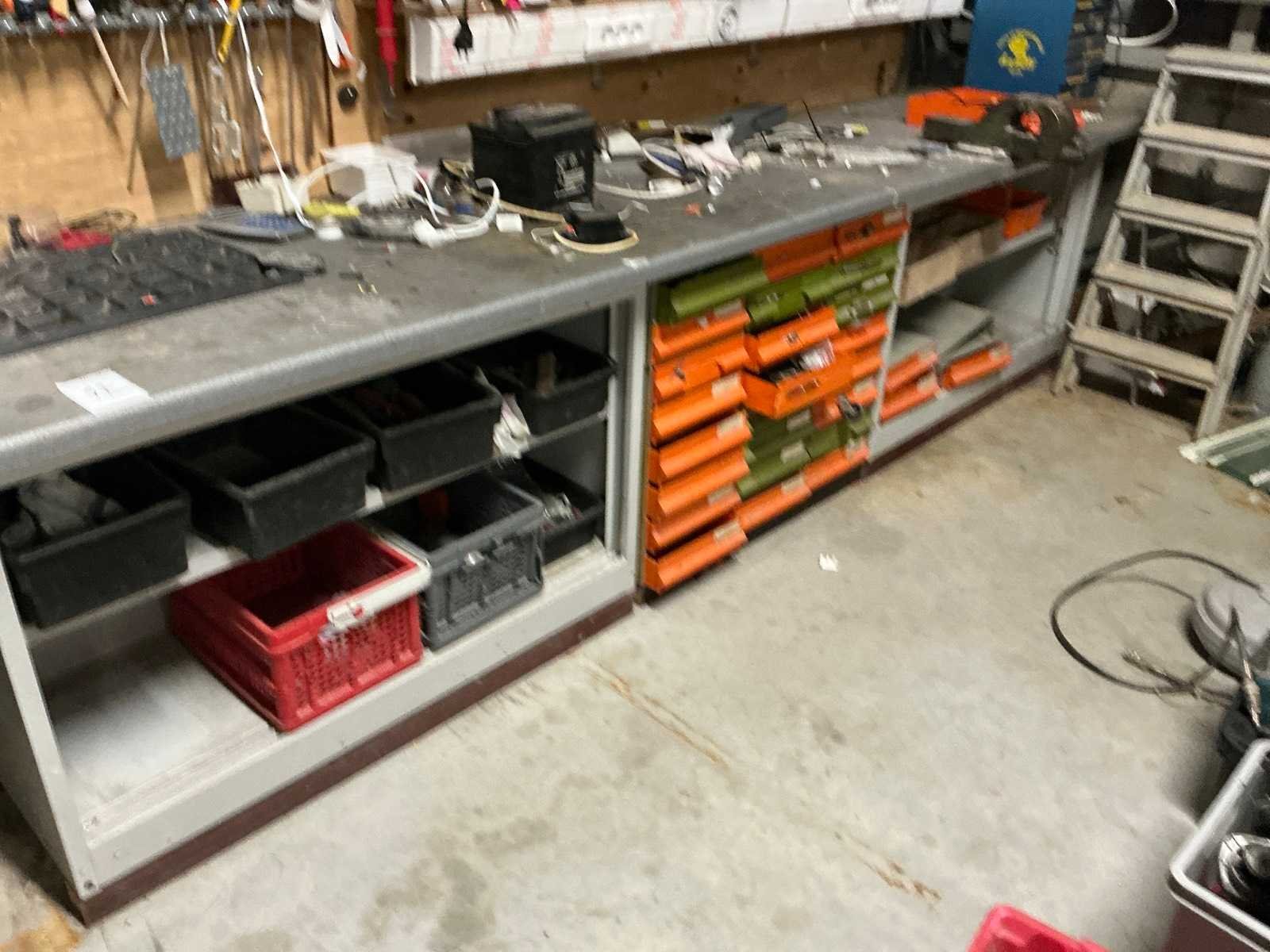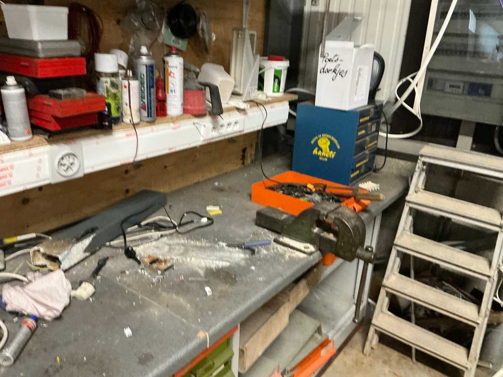 Allebei met bankschroef, inhoud bestaande uit handgereedschappen, voedingen, …. inclusief 2 rekjes en kast met diverse inhoud